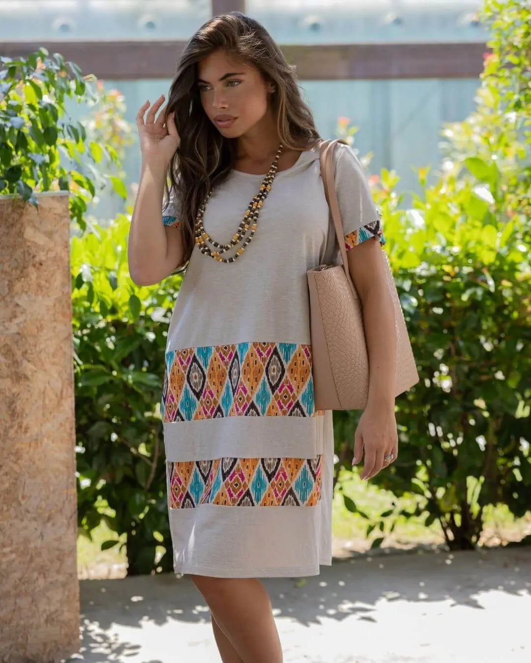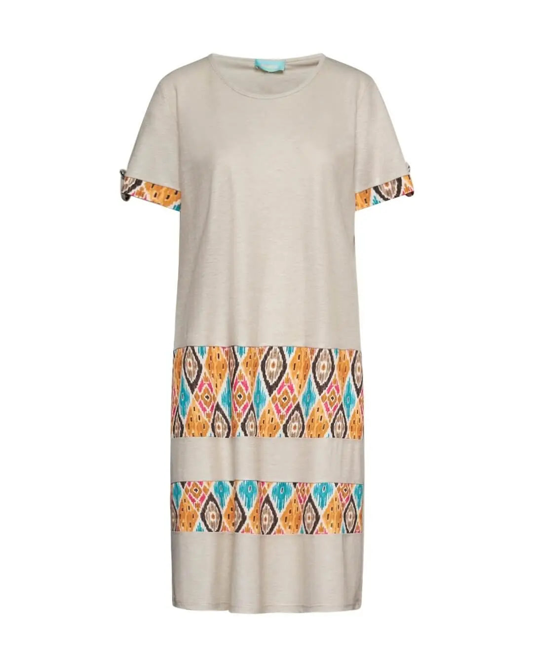 Vestido recto de manga corta en mezcla de viscosa con paneles de jersey elástico con estampado multicolor NARANJA