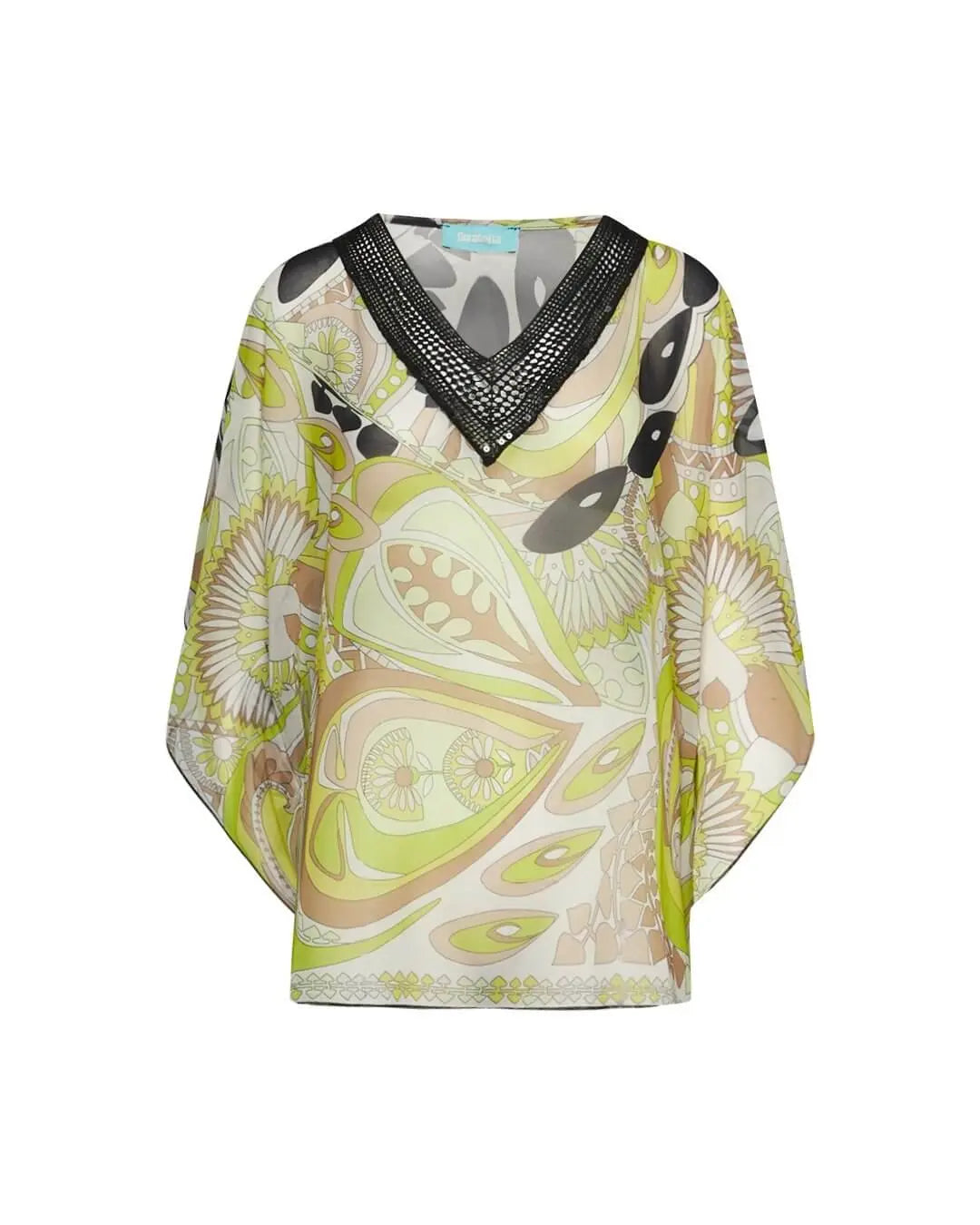 Blusa de georgette con estampado multicolor y escote en pico en encaje de crochet con lentejuelas. AMARILLO