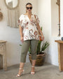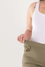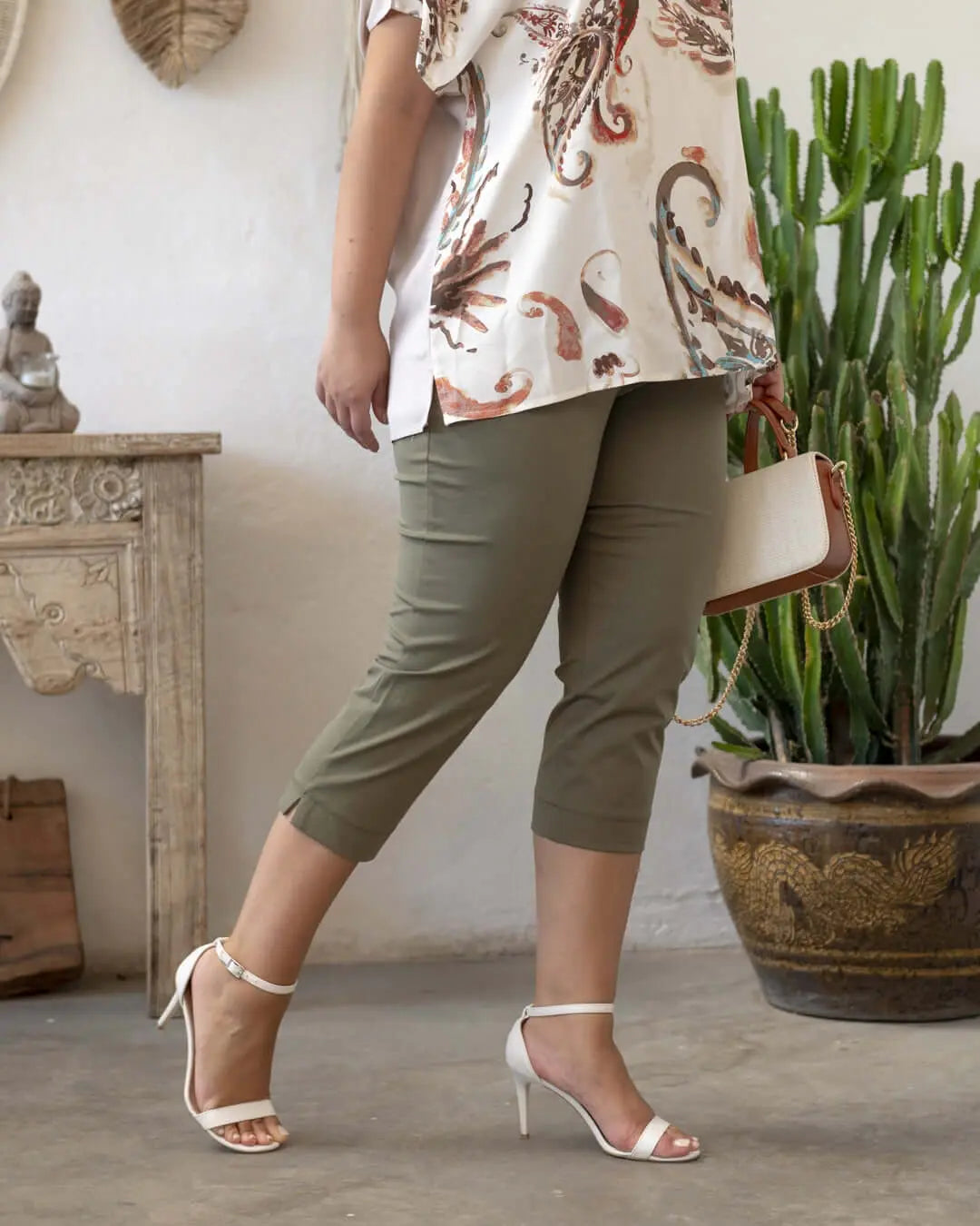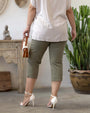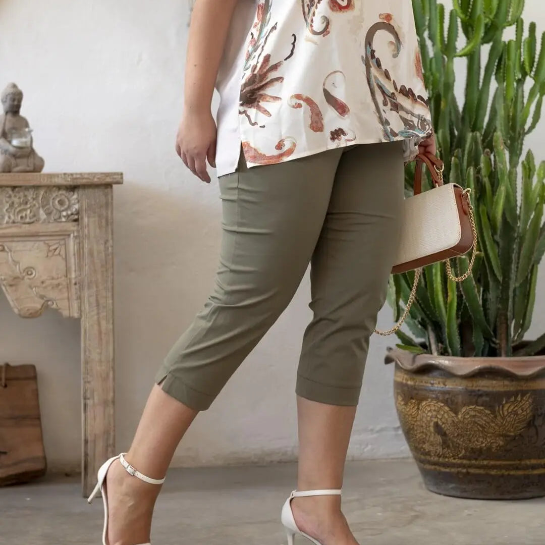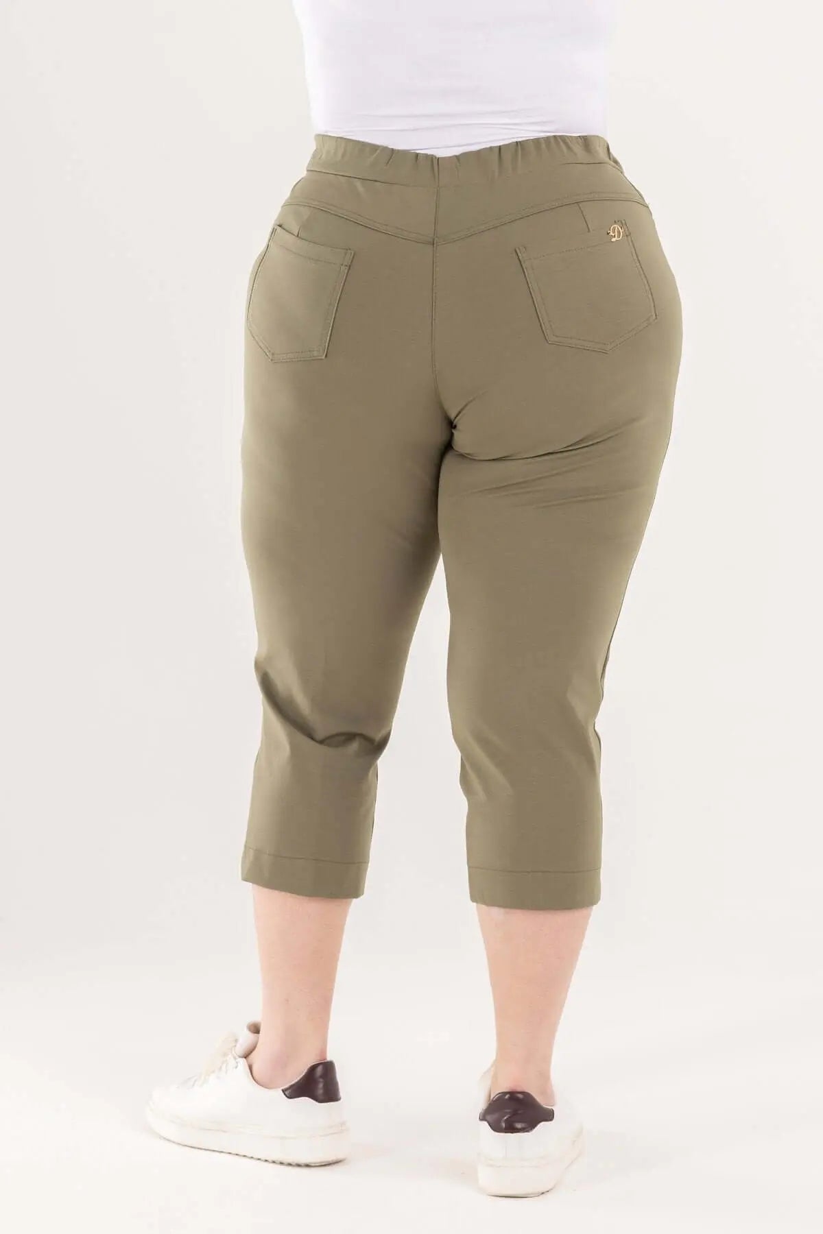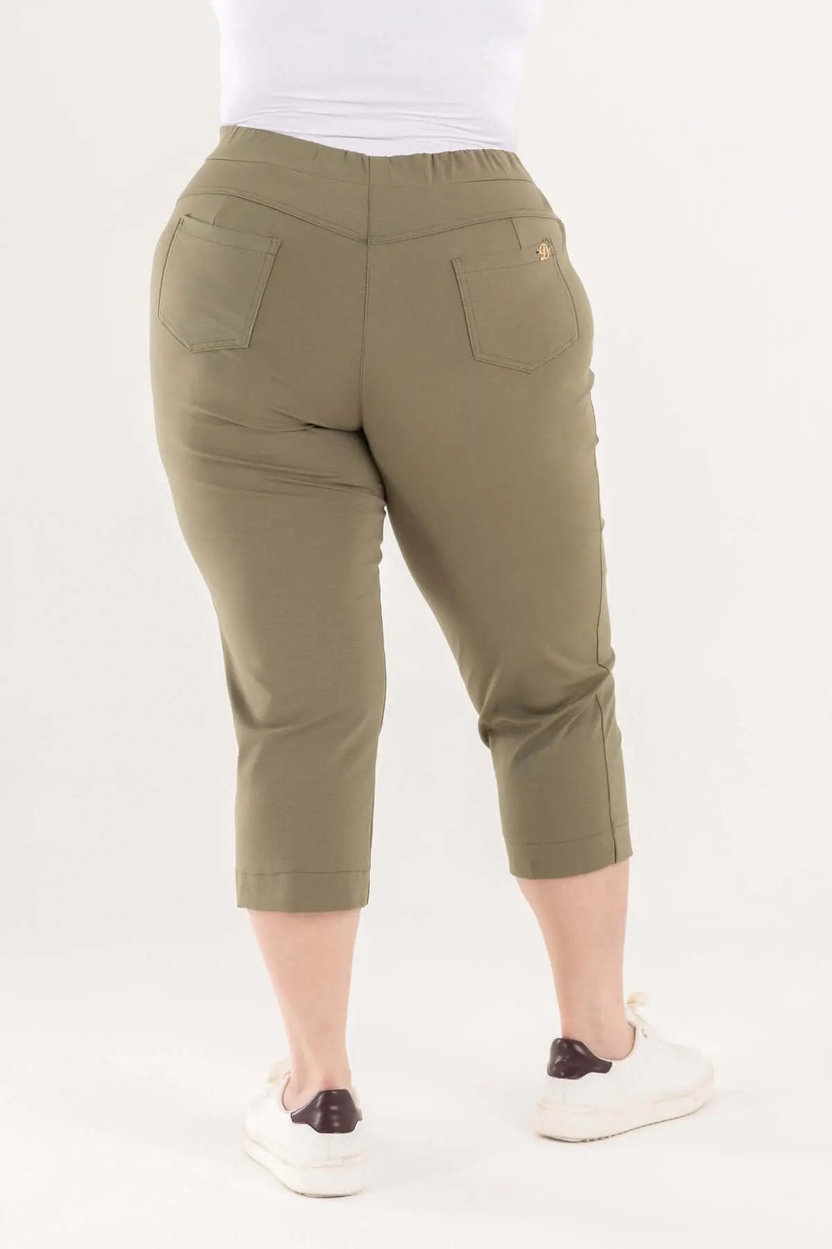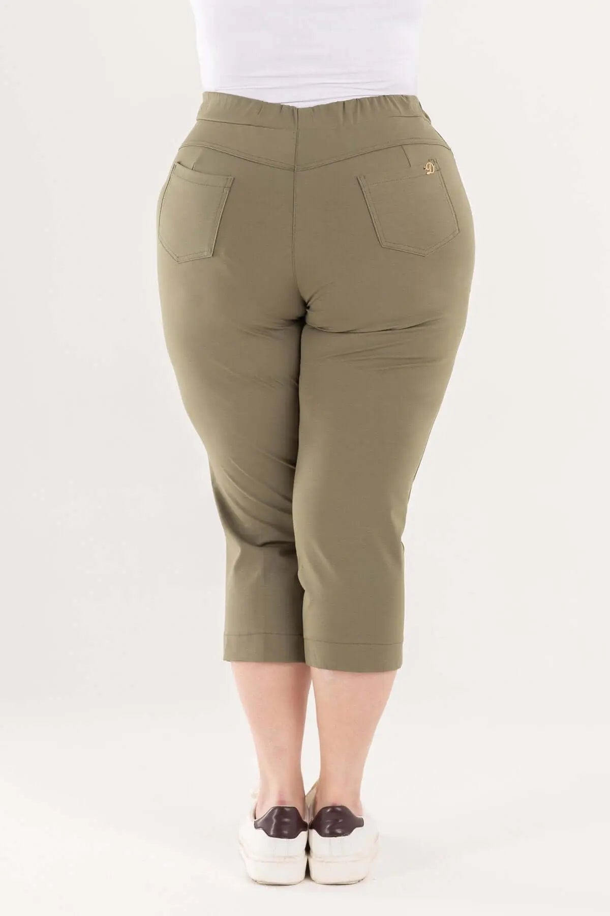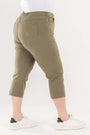 Pantalones capri de cinco bolsillos en sarga de mezcla de algodón elástico de color liso. MILITAR