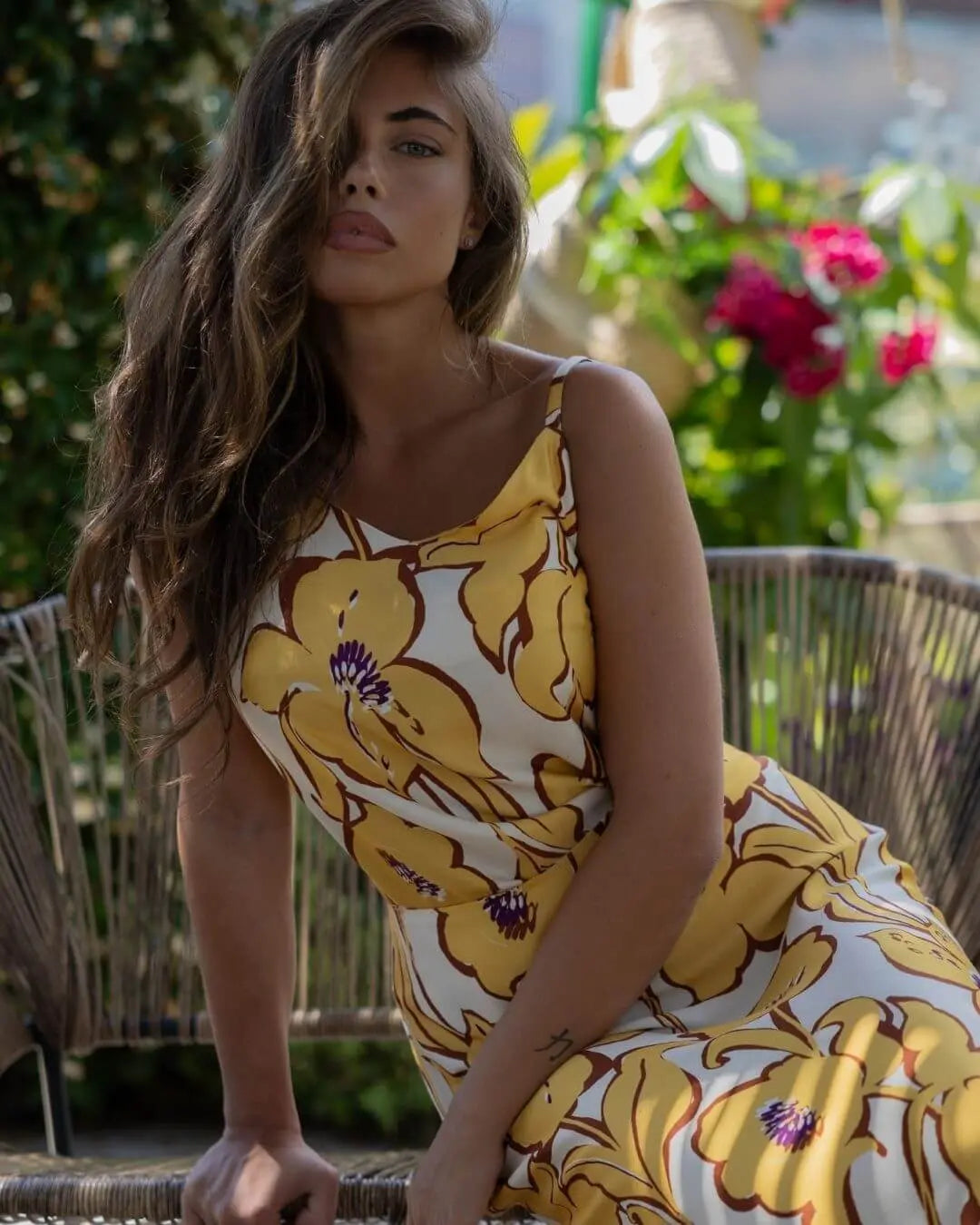 Top de tirantes finos en viscosa brillante con estampado floral. OCRE