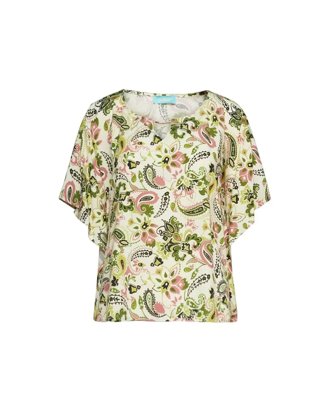 Blusa de viscosa con estampado multicolor y detalle metálico en el escote. VERDE