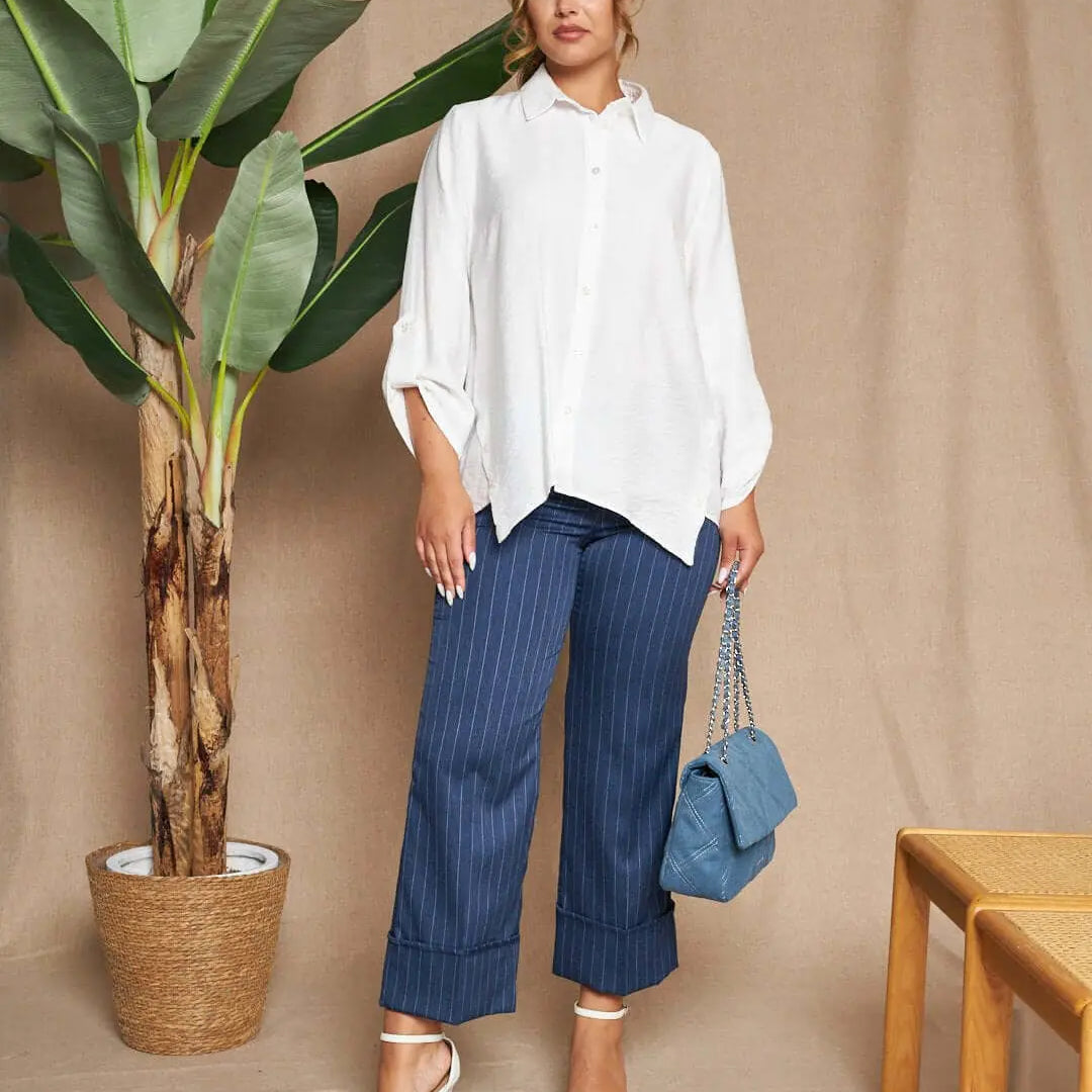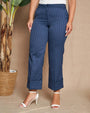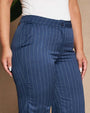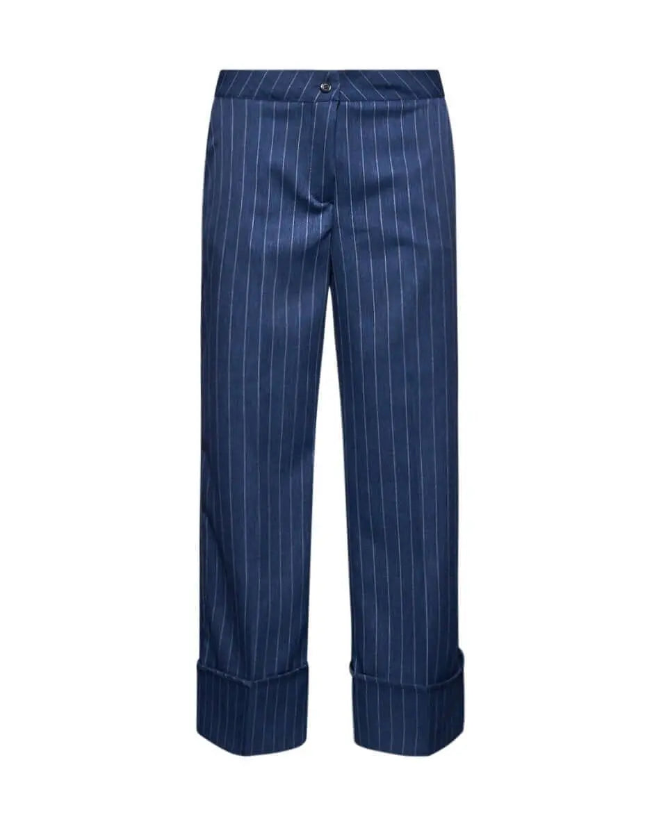 Pantalón recto de lona elástica de color liso con rayas en el bajo y maxi vueltas. AZUL