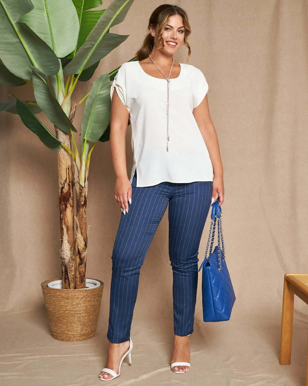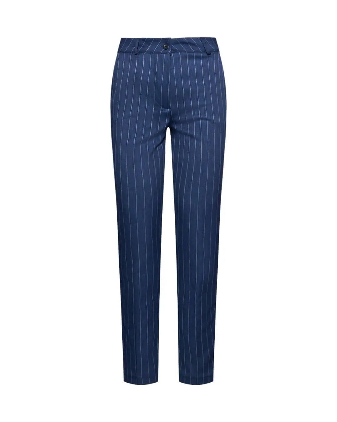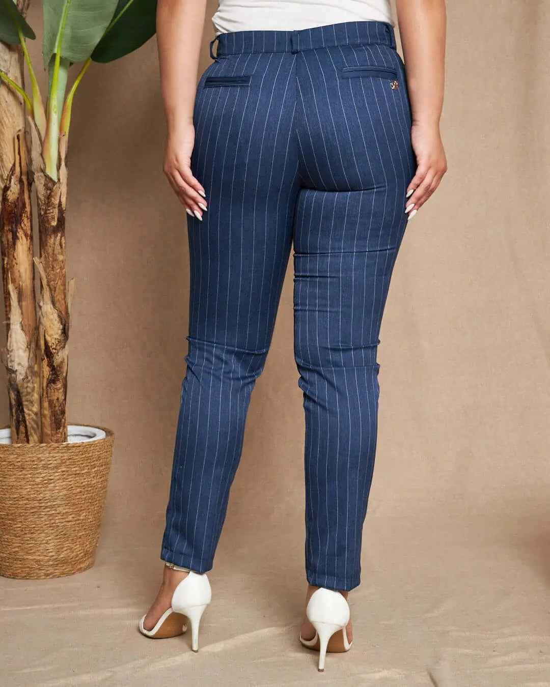 Pantalón pitillo en chambray de raya diplomática con bolsillos americanos y logo D metálico. AZUL