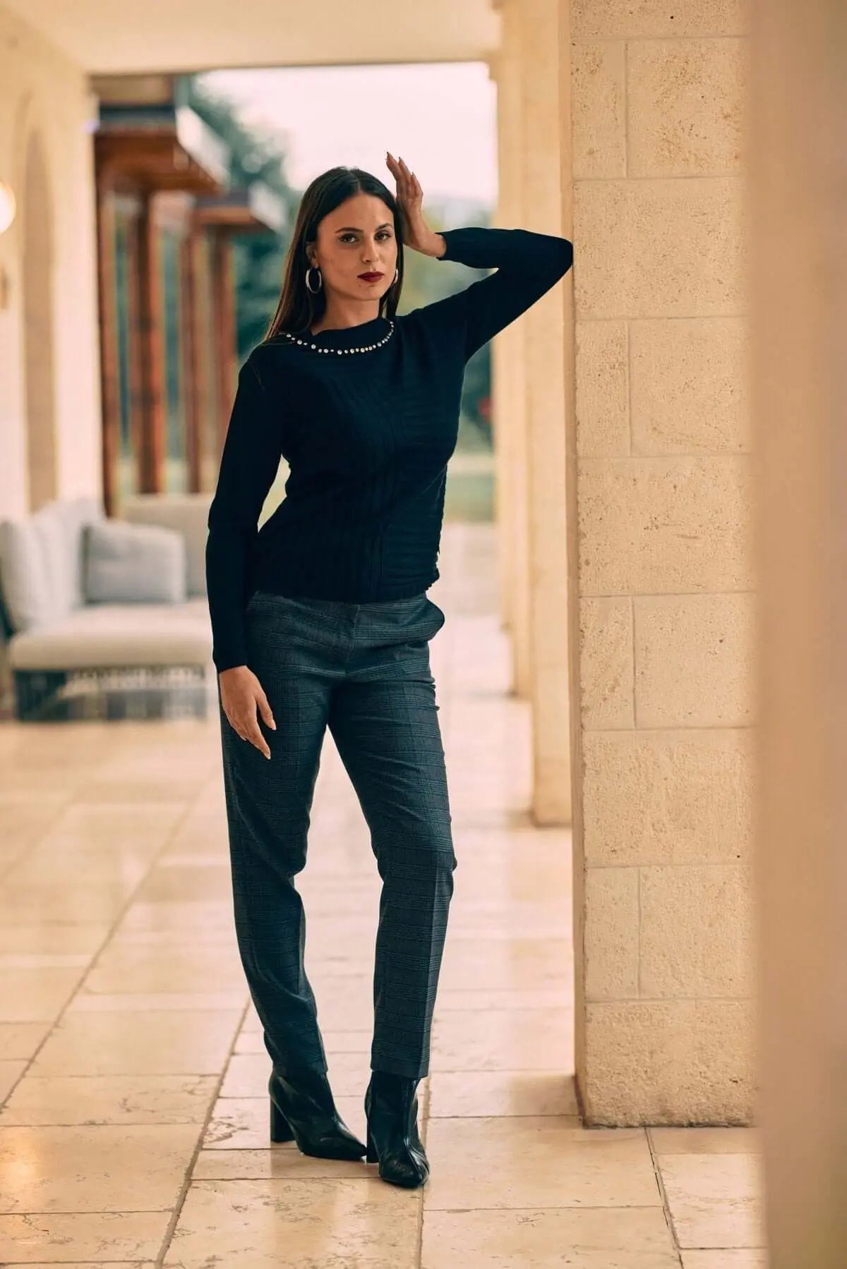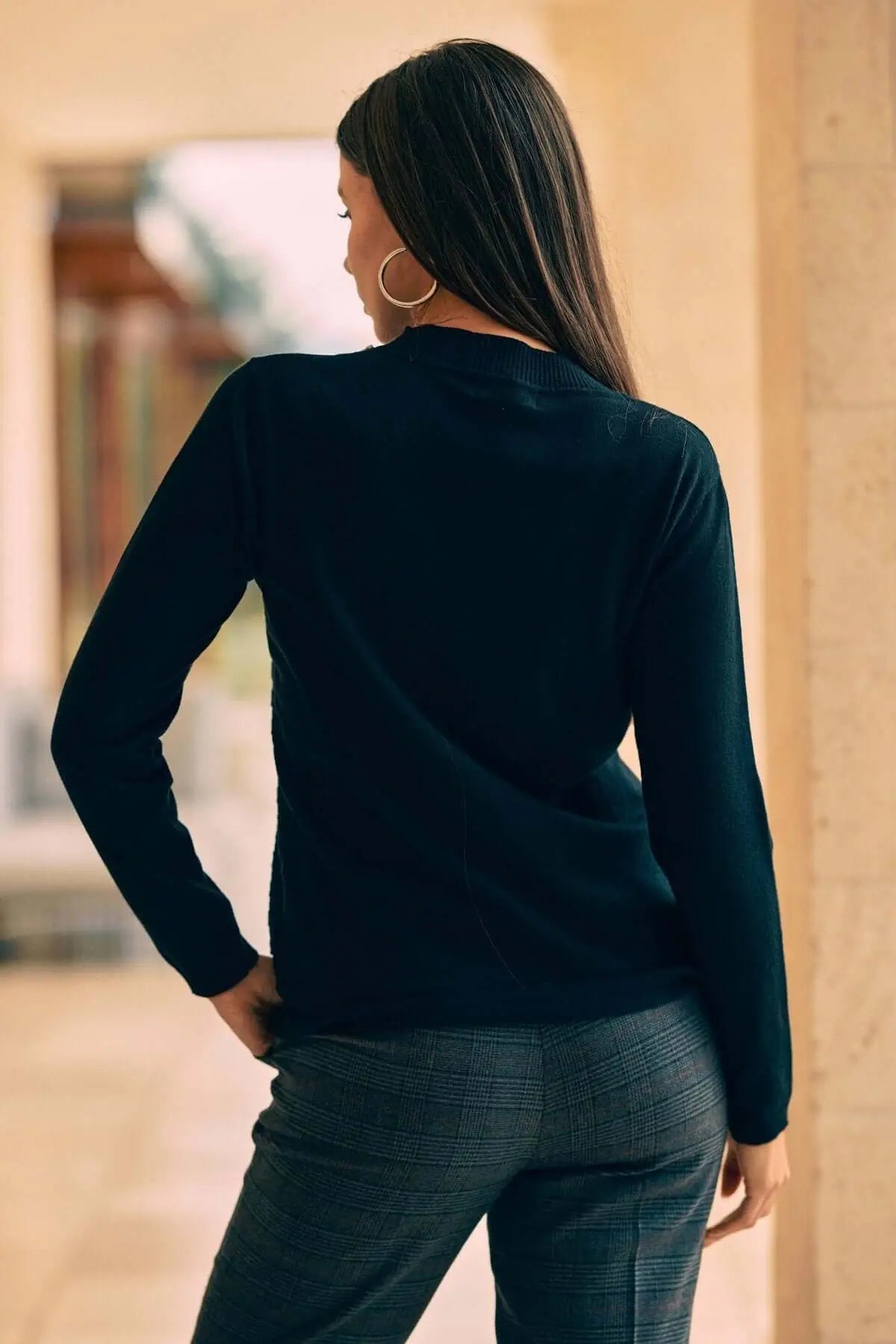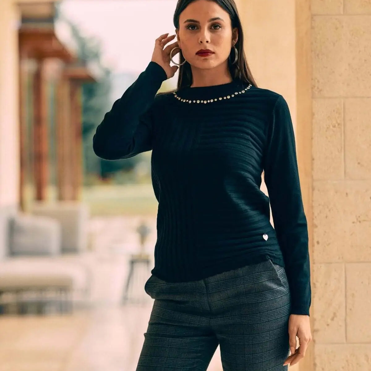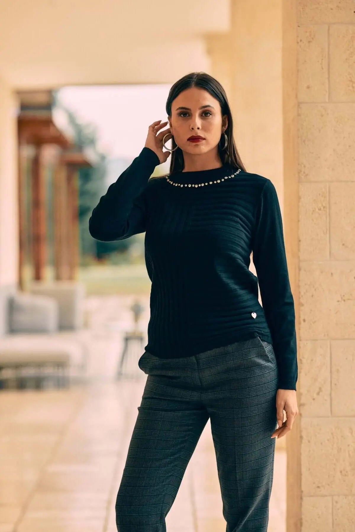 Suéter de cuello redondo con aplicaciones de joya en el escote NEGRO