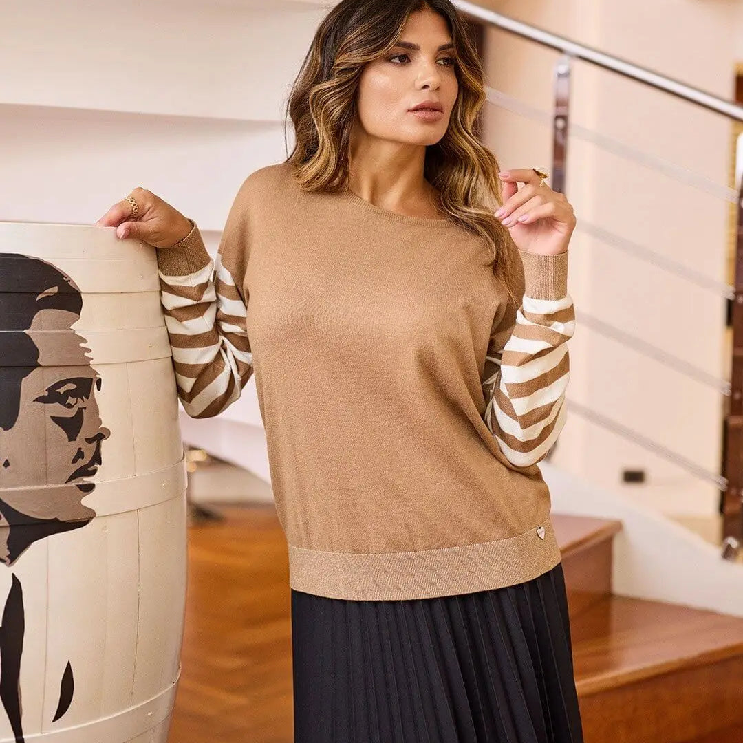Jersey de cuello redondo con estampado de rayas e inserciones de lúrex CAMEL