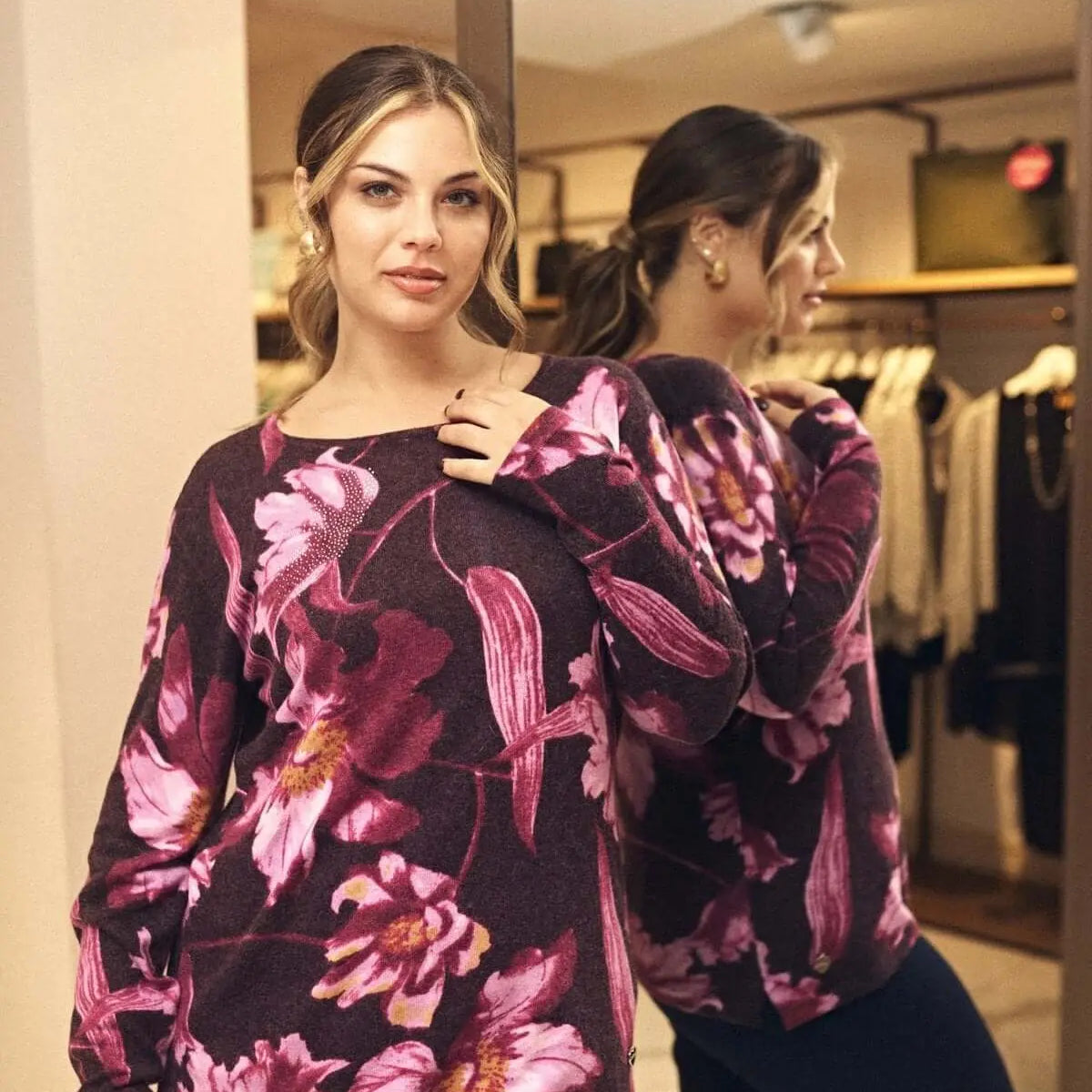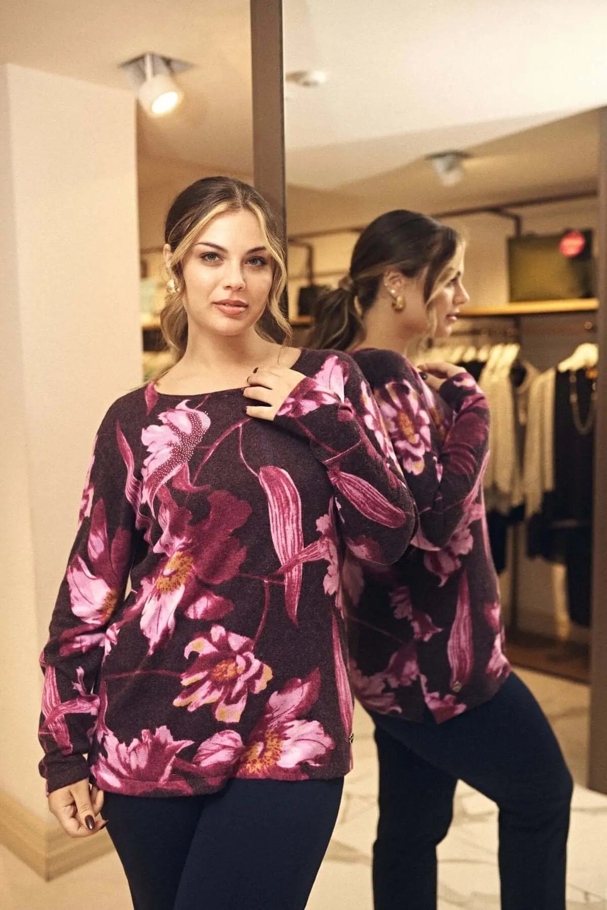 Suéter de cuello redondo con estampado floral en toda la prenda MORADO