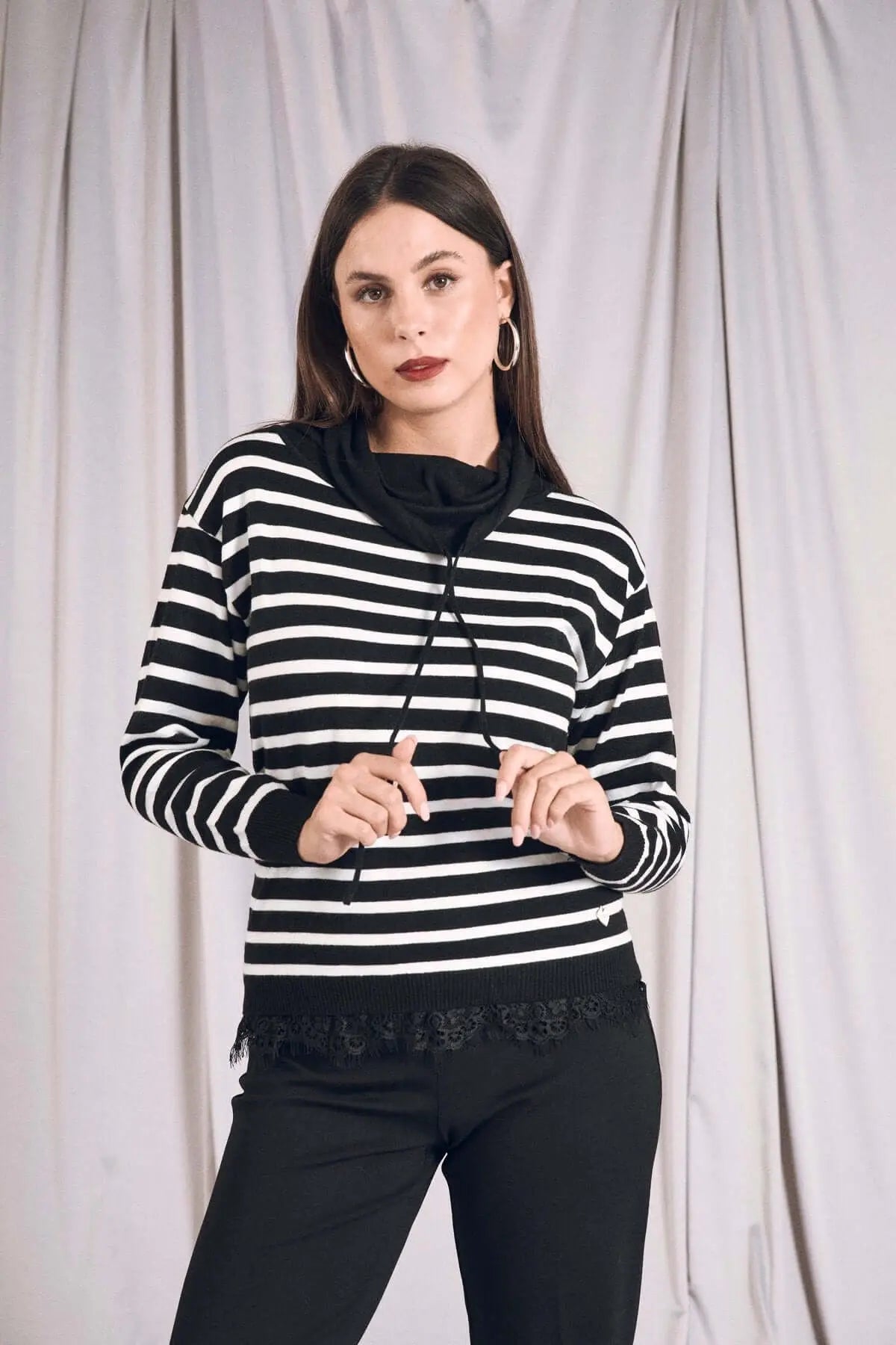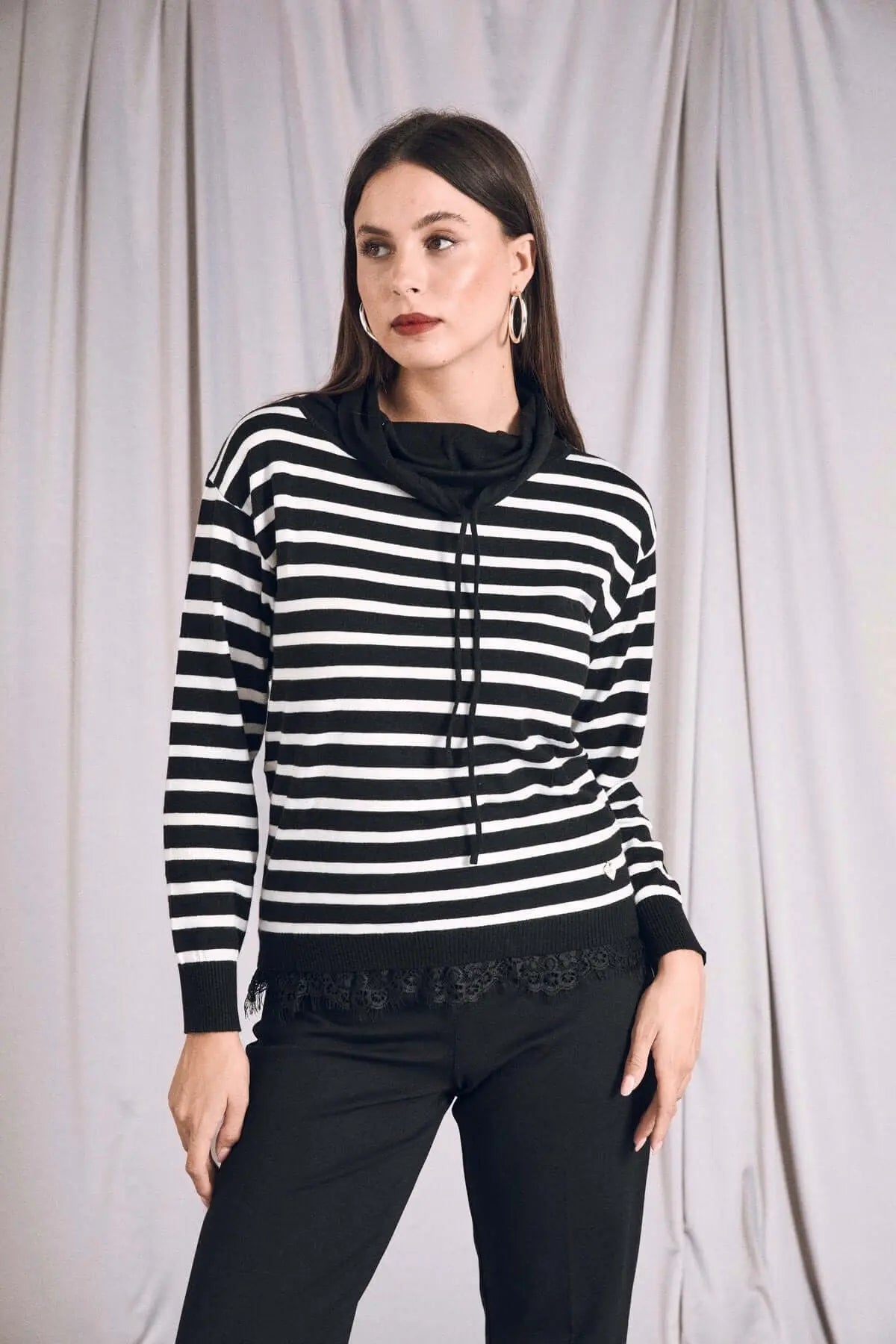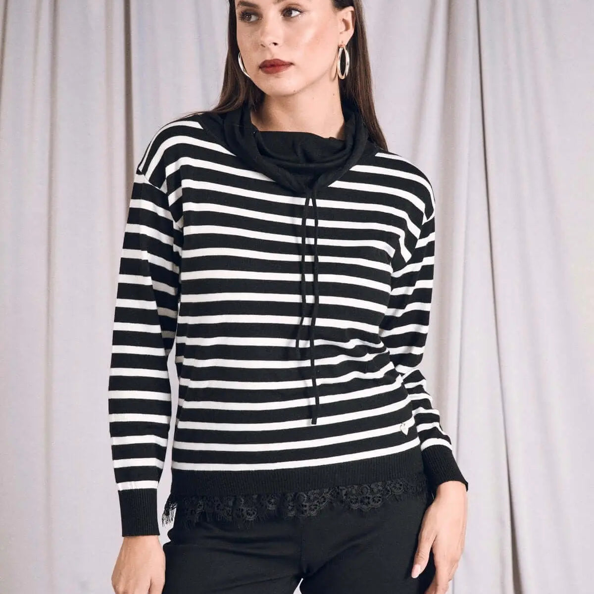 Suéter de rayas con cuello cráter y cordón NEGRO