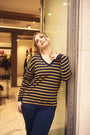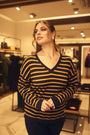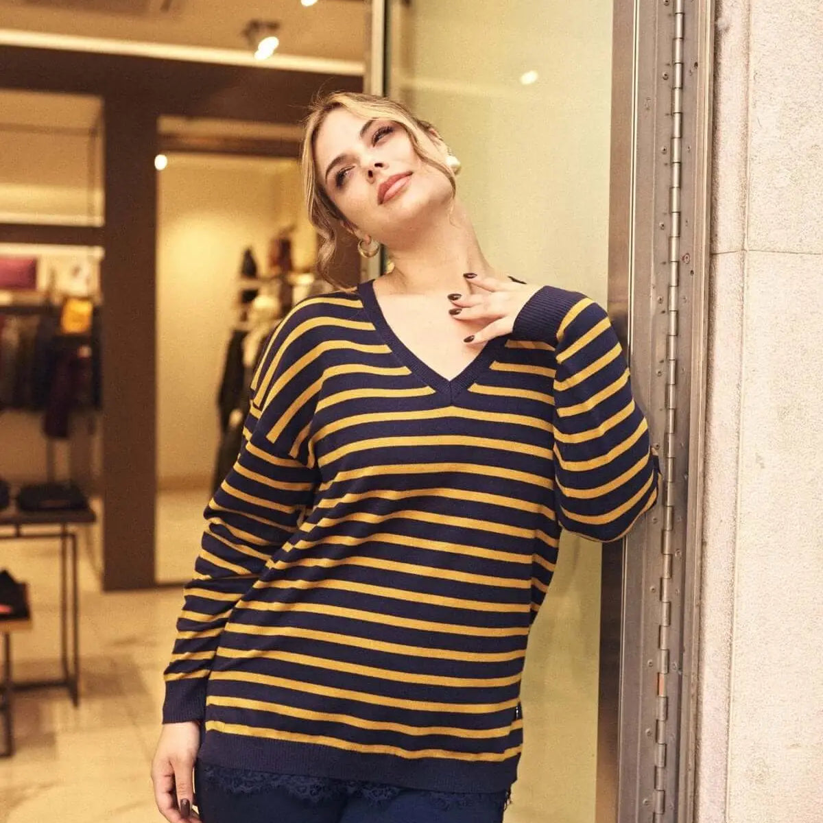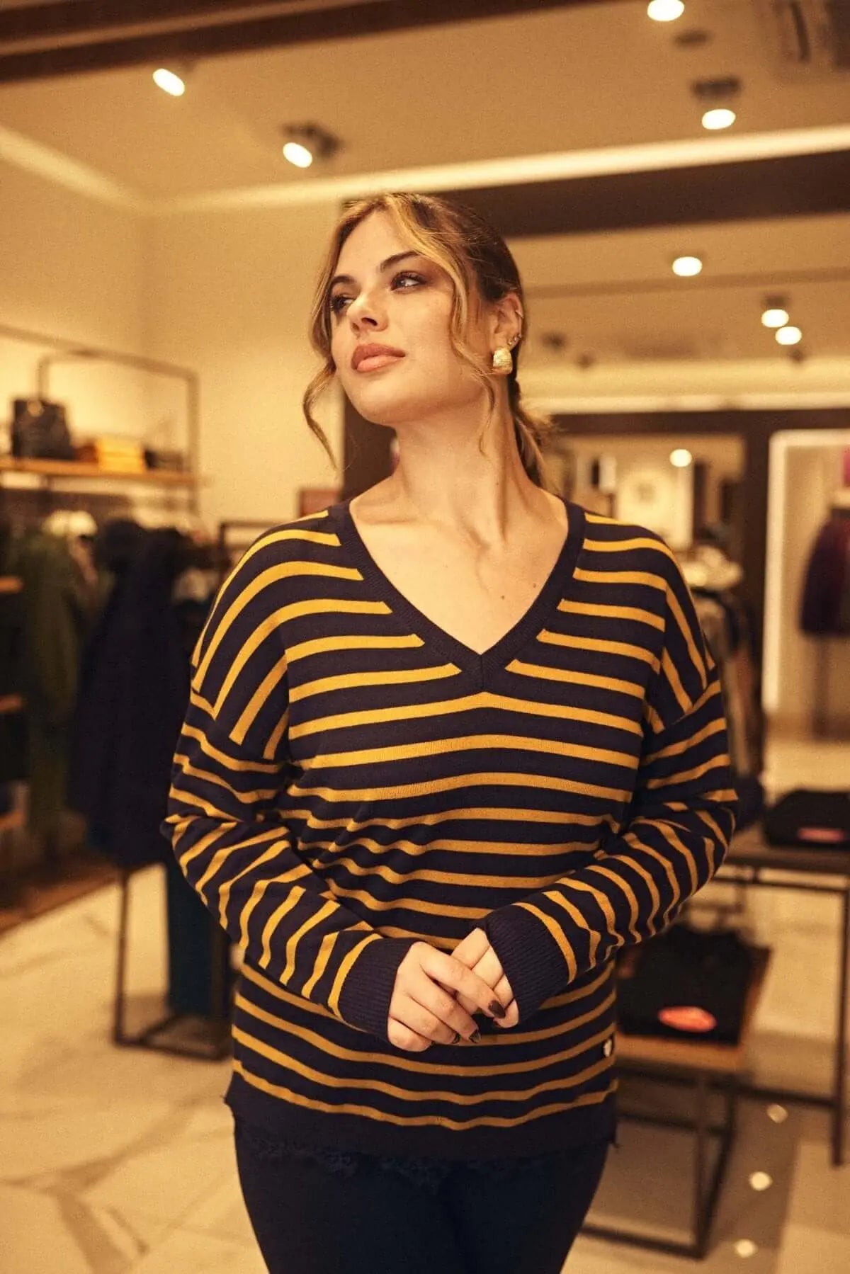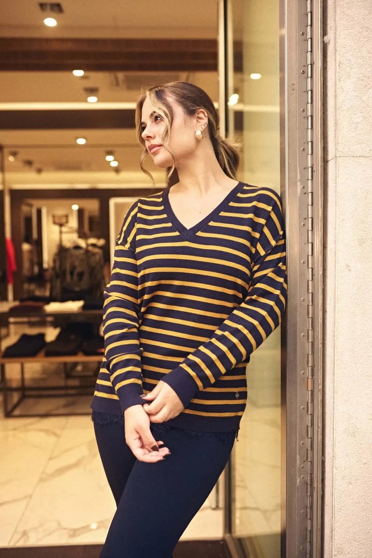 Suéter de rayas con cuello en V y ribete de encaje AZUL