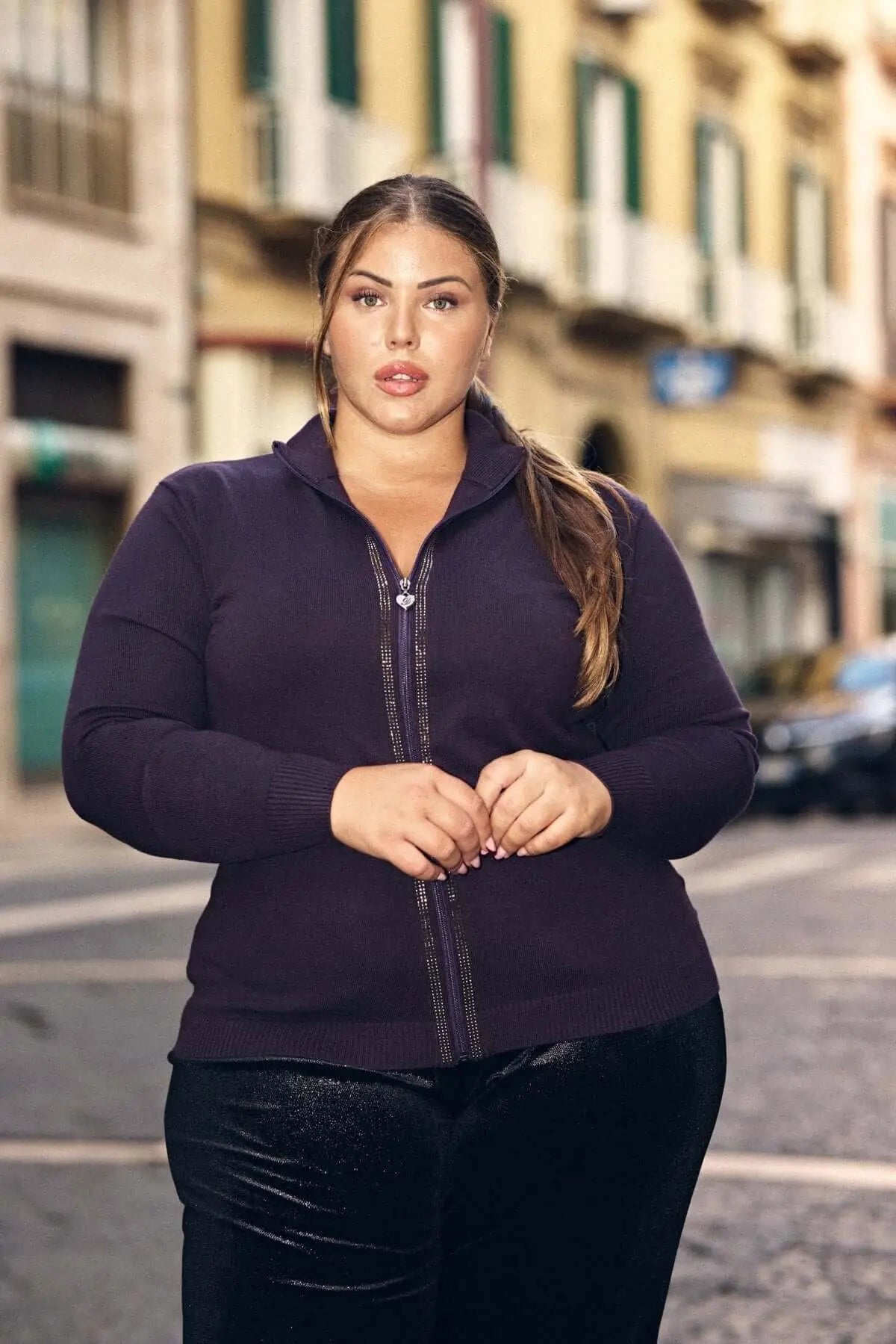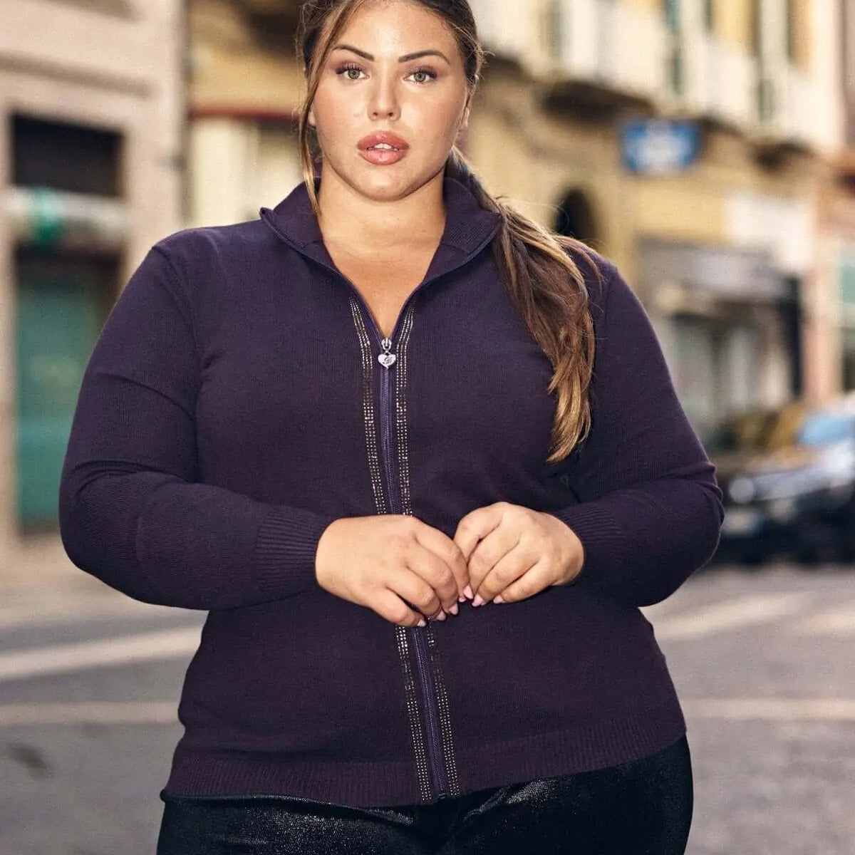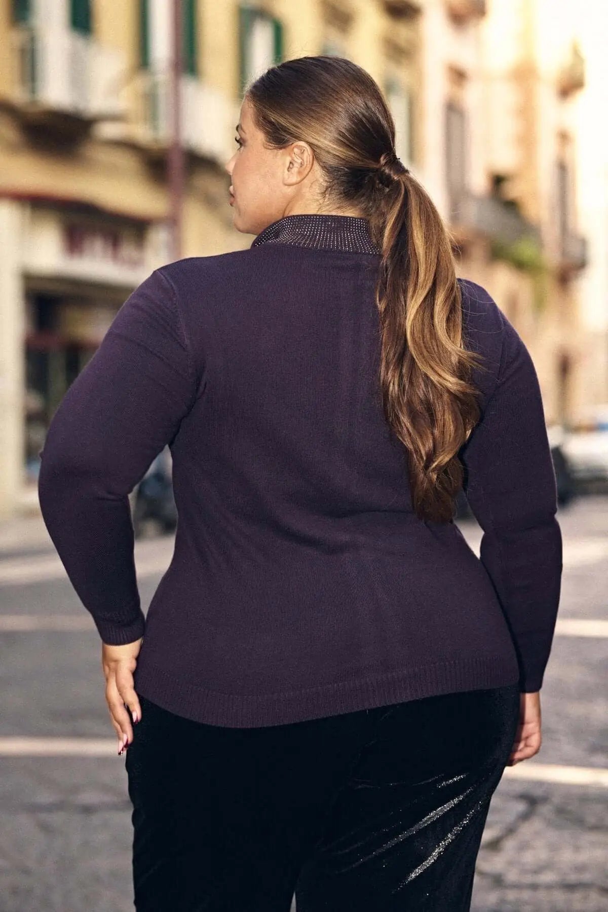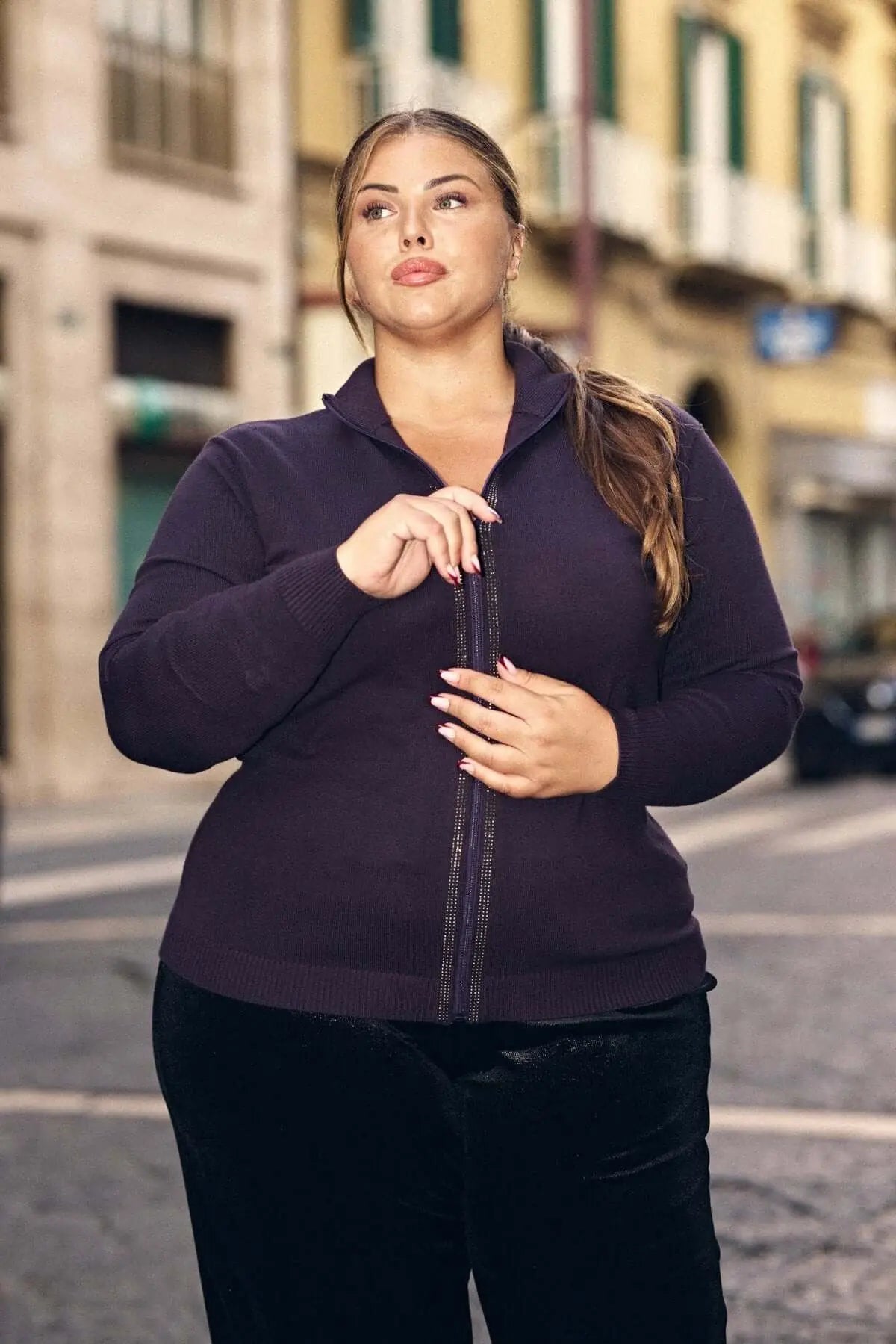 Jersey de cuello medio con cremallera y pedrería PLUM
