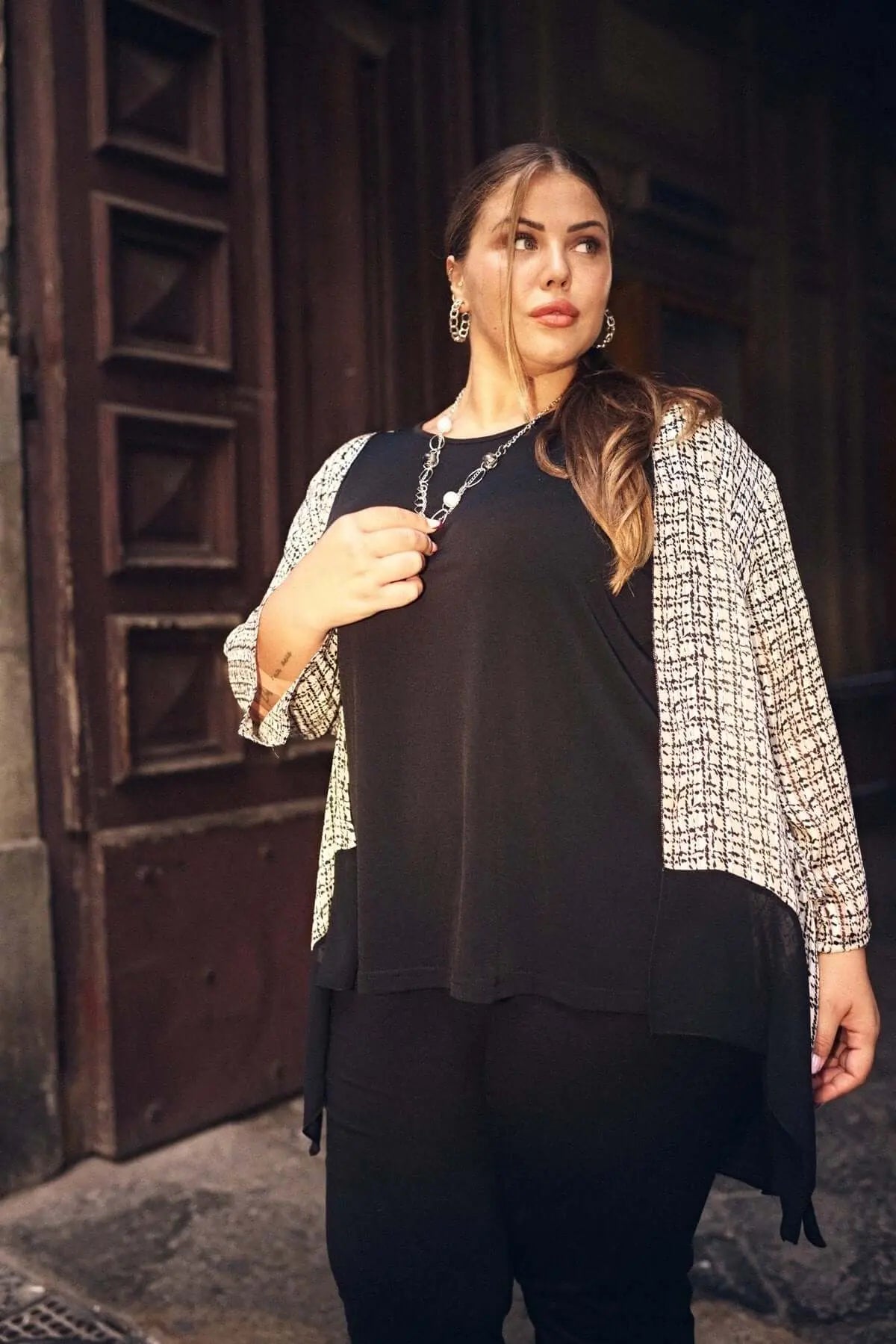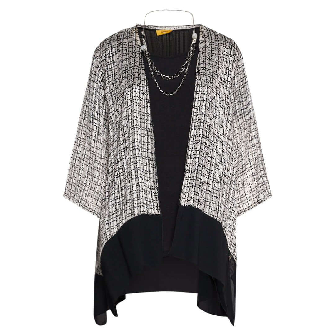 Conjunto coordinado con guardapolvo estampado y blusa lisa con collar accesorio NEGRO-BLANCO