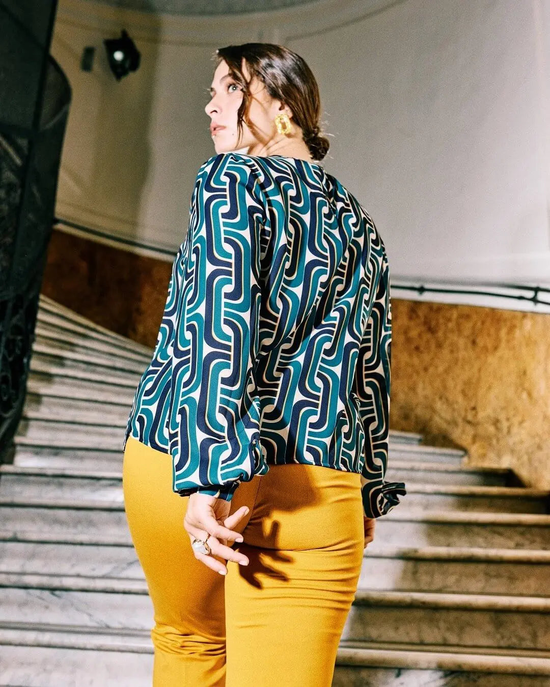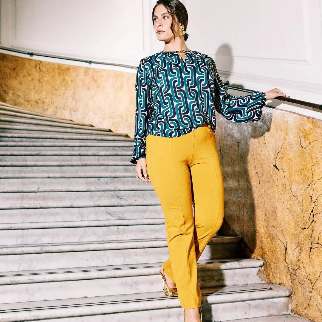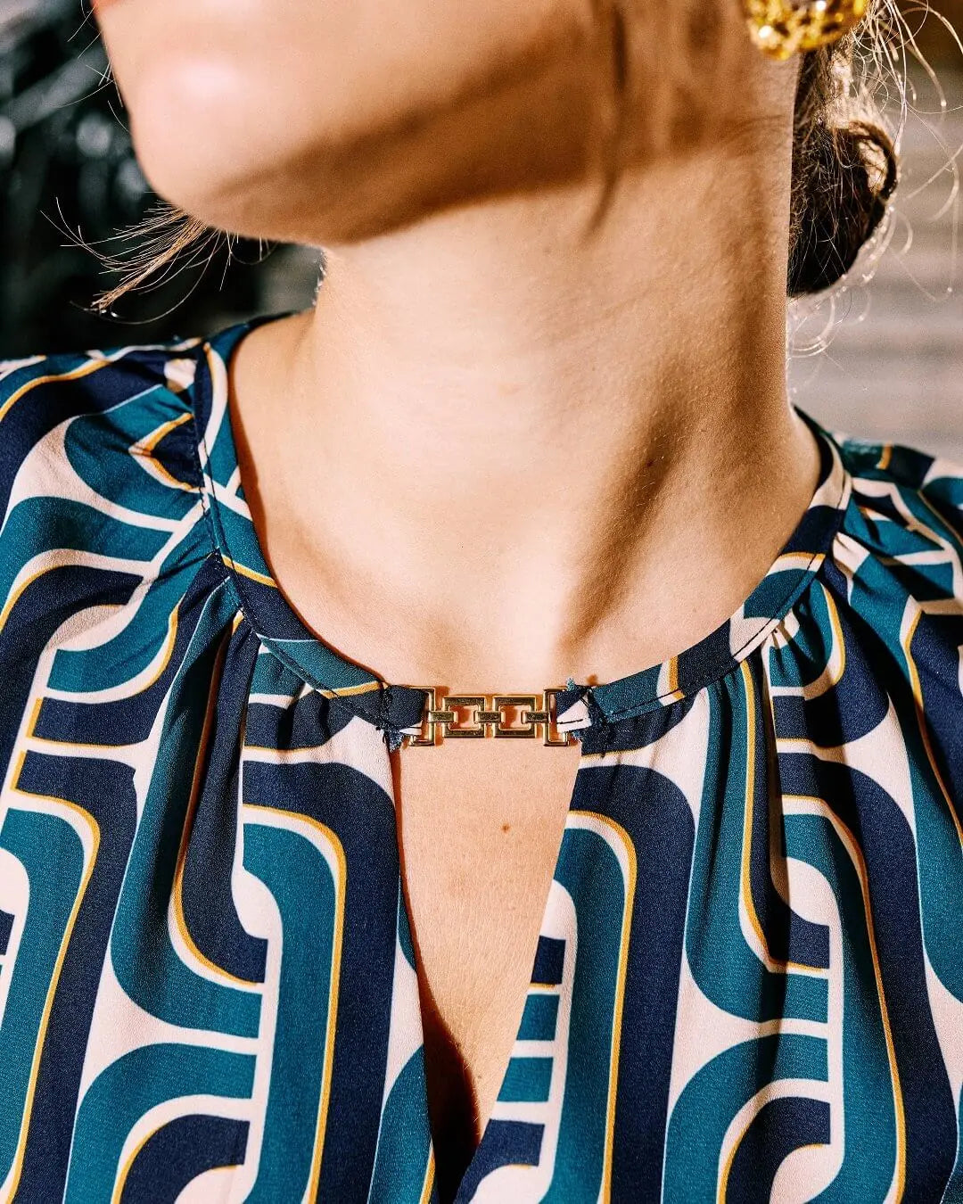 Blusa de crepe óptico con cadena en el escote AZUL MOSTAZA