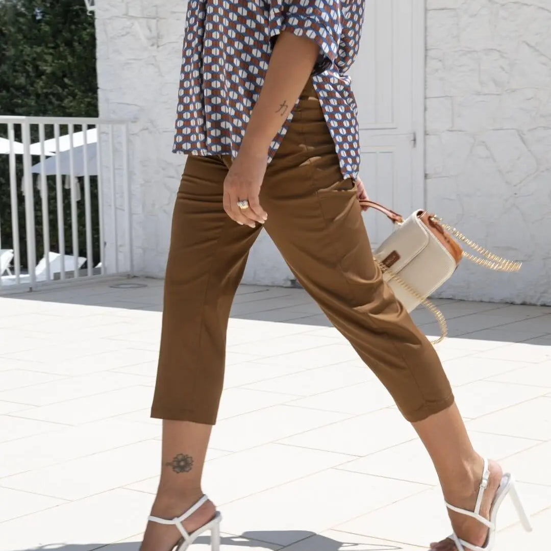 Pantalones capri de sarga de algodón elástico liso con cierre de cremallera. TABACO