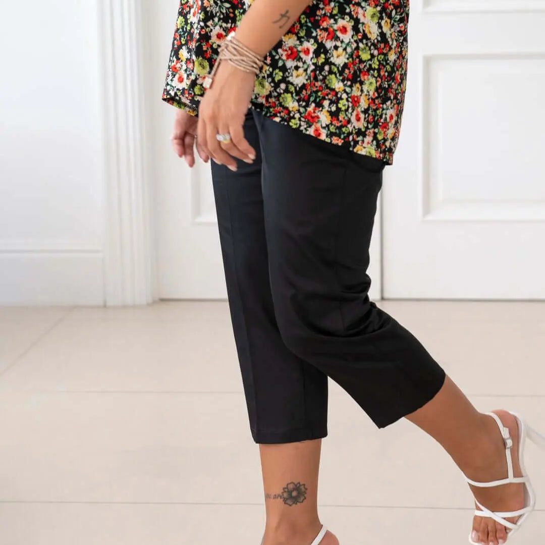 Pantalones capri de sarga de algodón elástico liso con cierre de cremallera. NEGRO