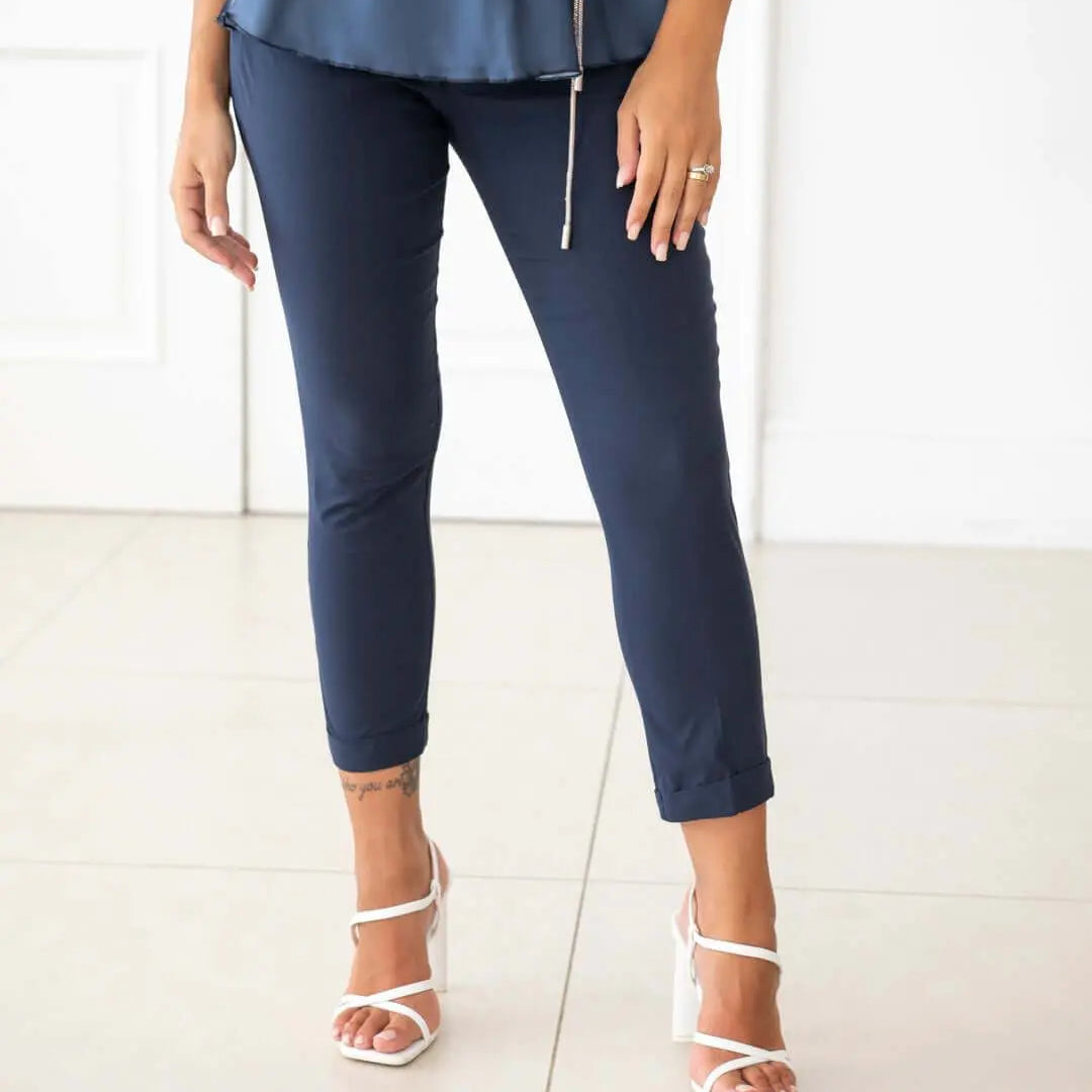 Pantalón capri ajustado de sarga de mezcla de viscosa elástica en color liso con bolsillos americanos AZUL