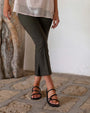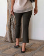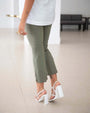 Pantalón pitillo con perneras acampanadas en sarga de mezcla de viscosa elástica de color liso. MILITAR