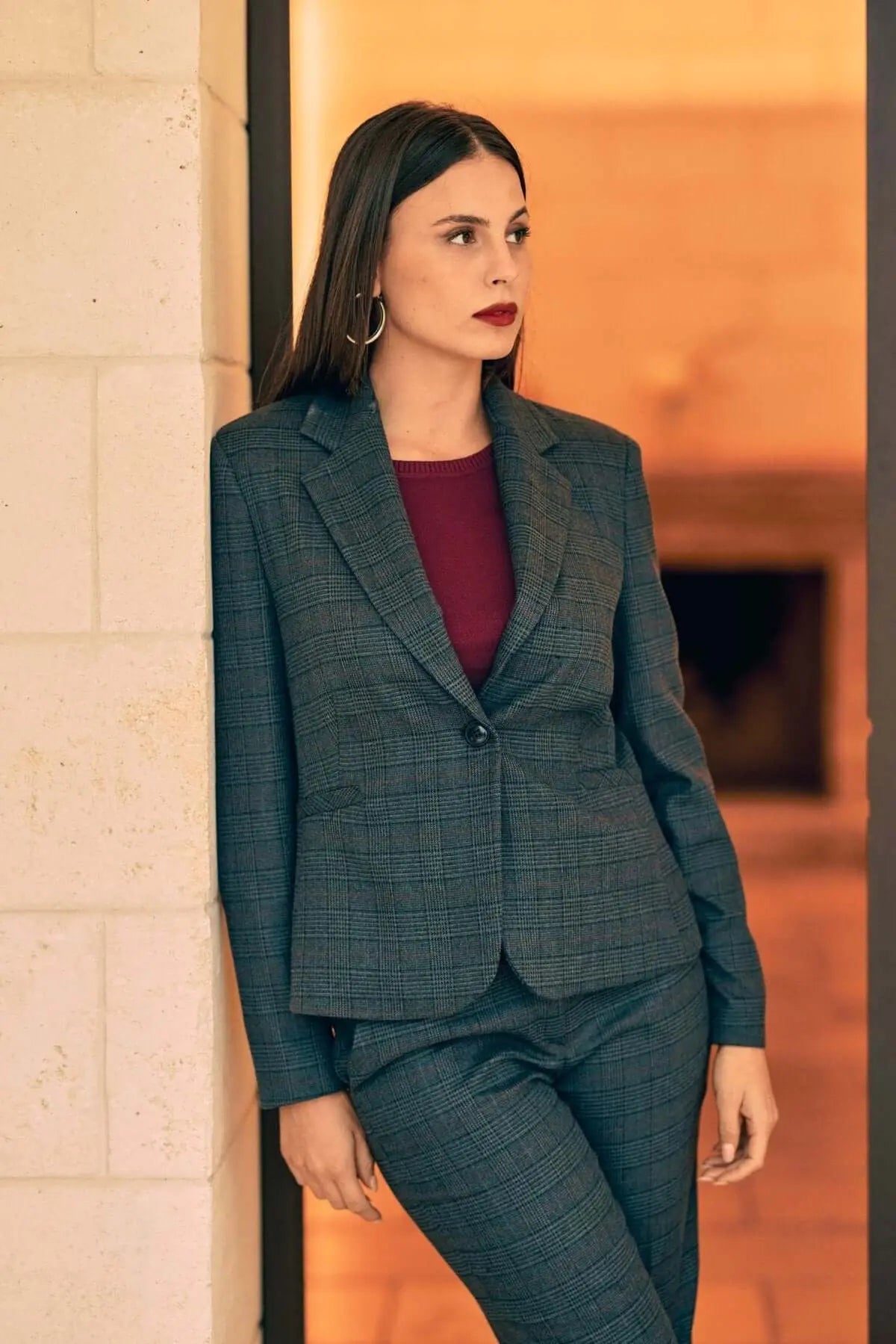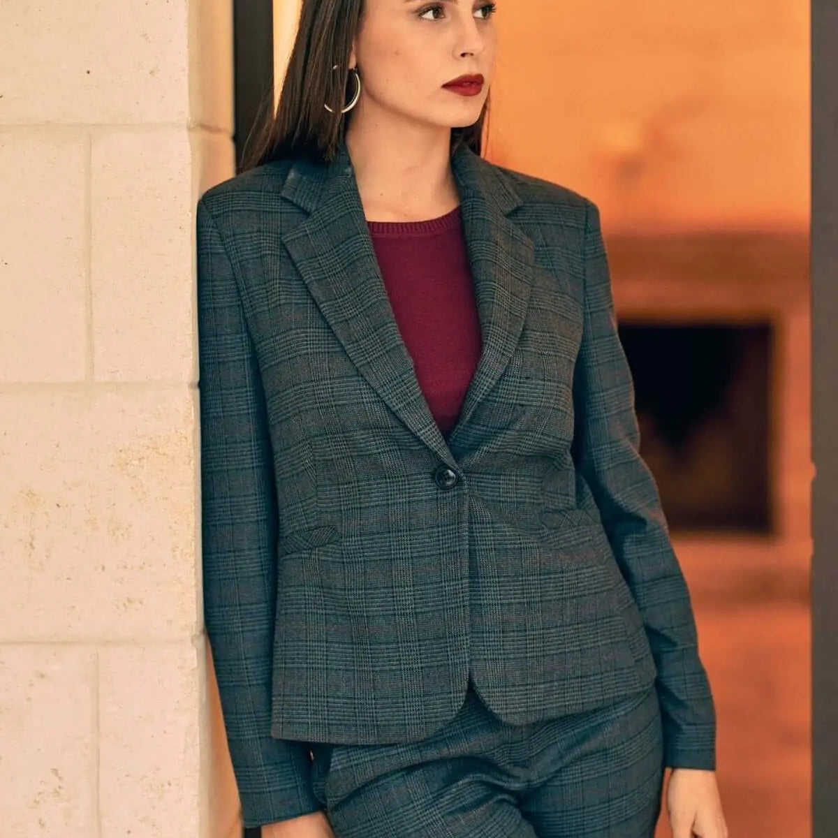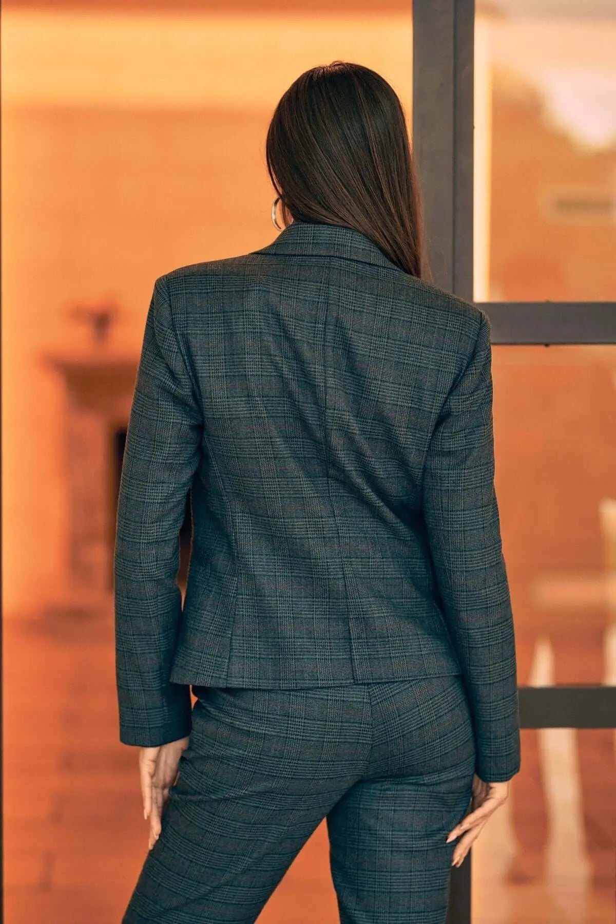 Chaqueta de tartán de botonadura sencilla con bolsillos GRIS