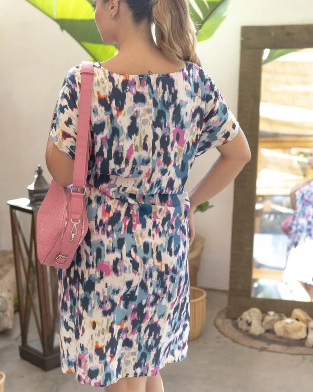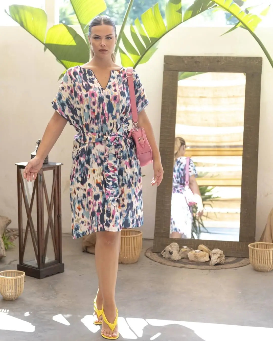 Vestido con mangas kimono y cinturón fijo estampado MULTICOLOR