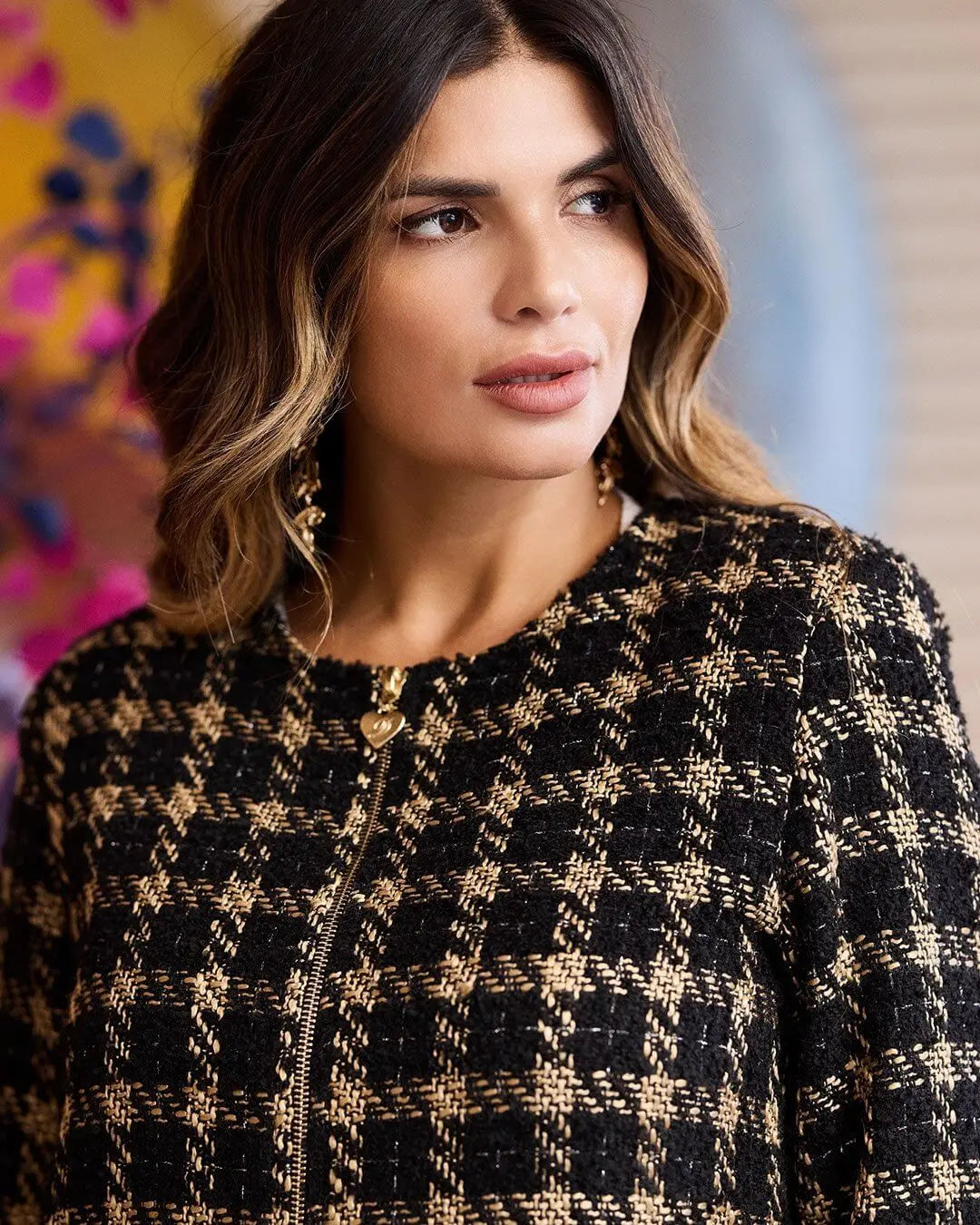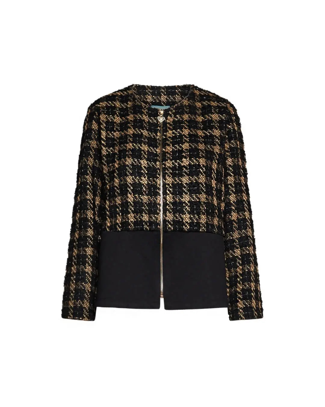 Chaqueta de tweed en mezcla de viscosa bicolor con cremallera y aplicación de color liso en la parte inferior. NEGRO