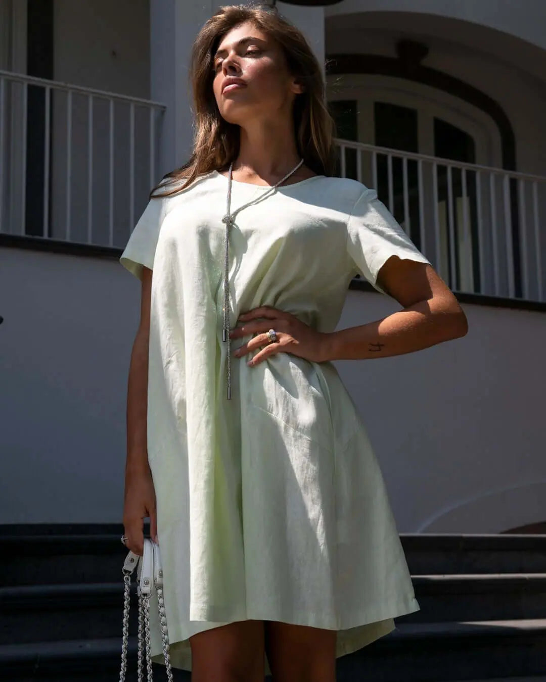 Vestido de manga corta en viscosa y lino con pliegues y bolsillos VERDE SALVIA