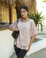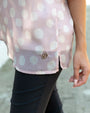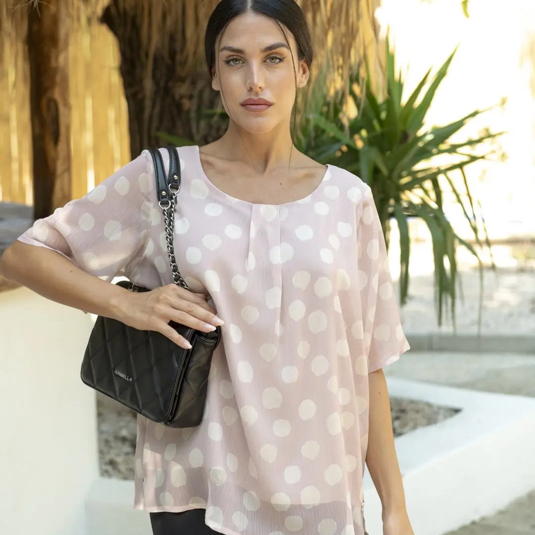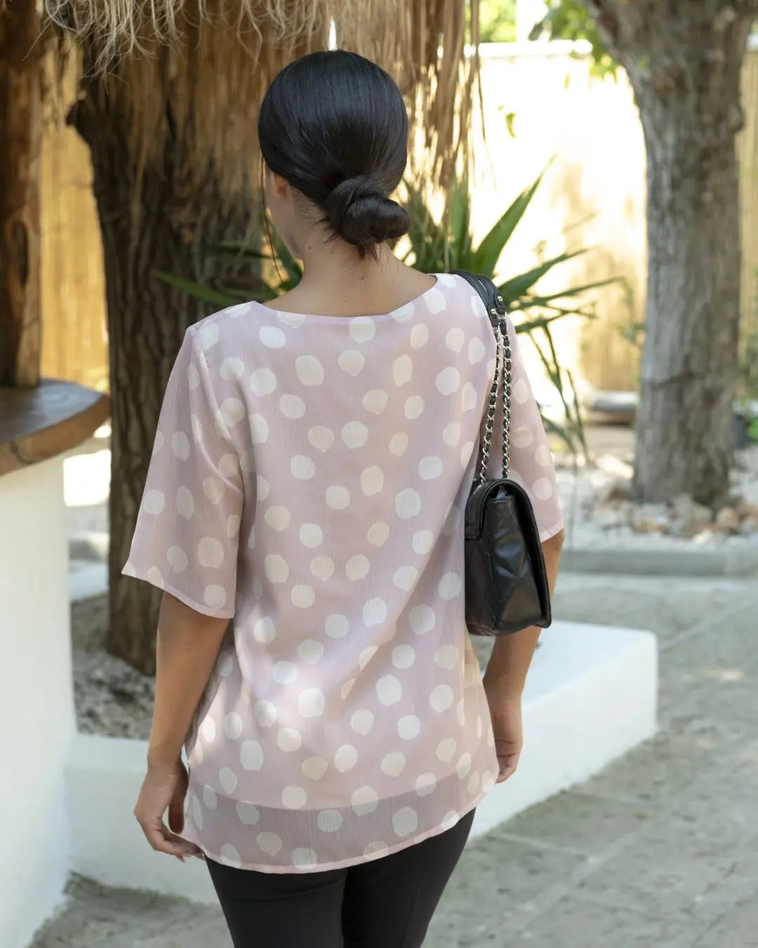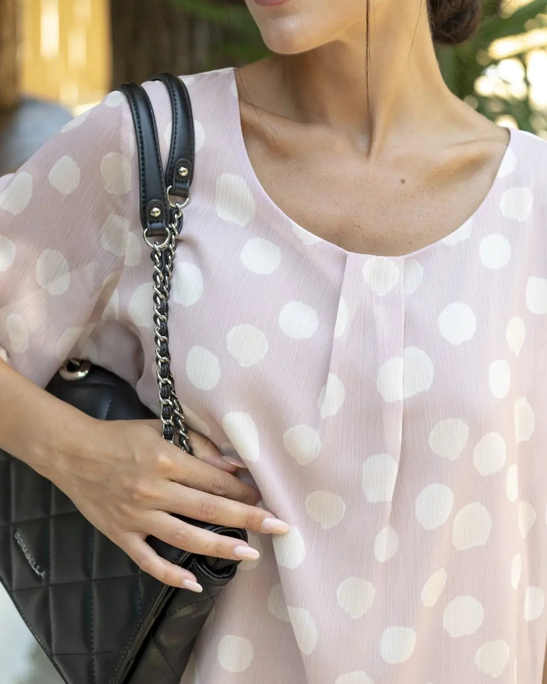 Blusa con estampado geométrico, cuello redondo y bajo fruncido ROSA CLARO