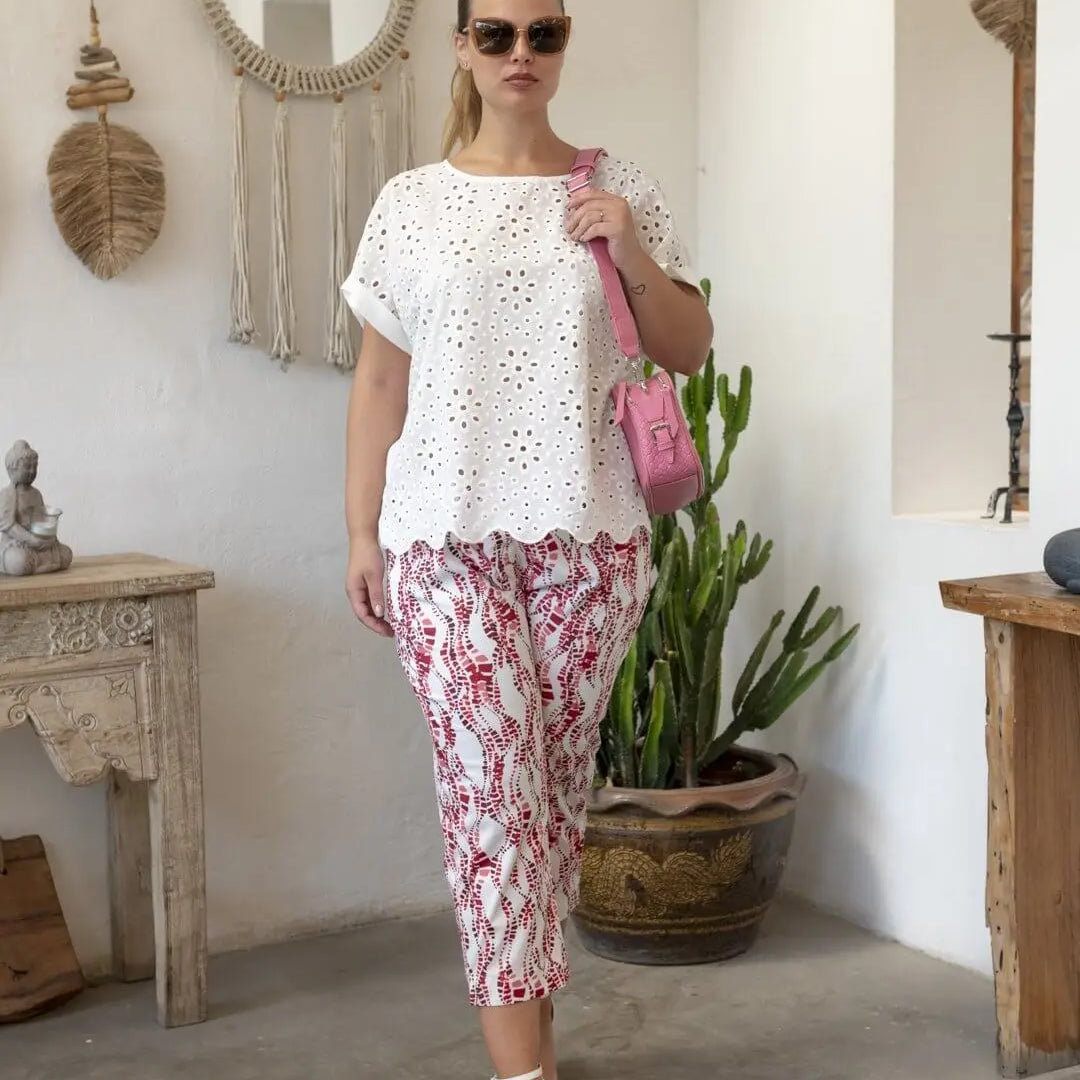 Pantalón capri de algodón elástico con estampado patchwork BLANCO-ROJO