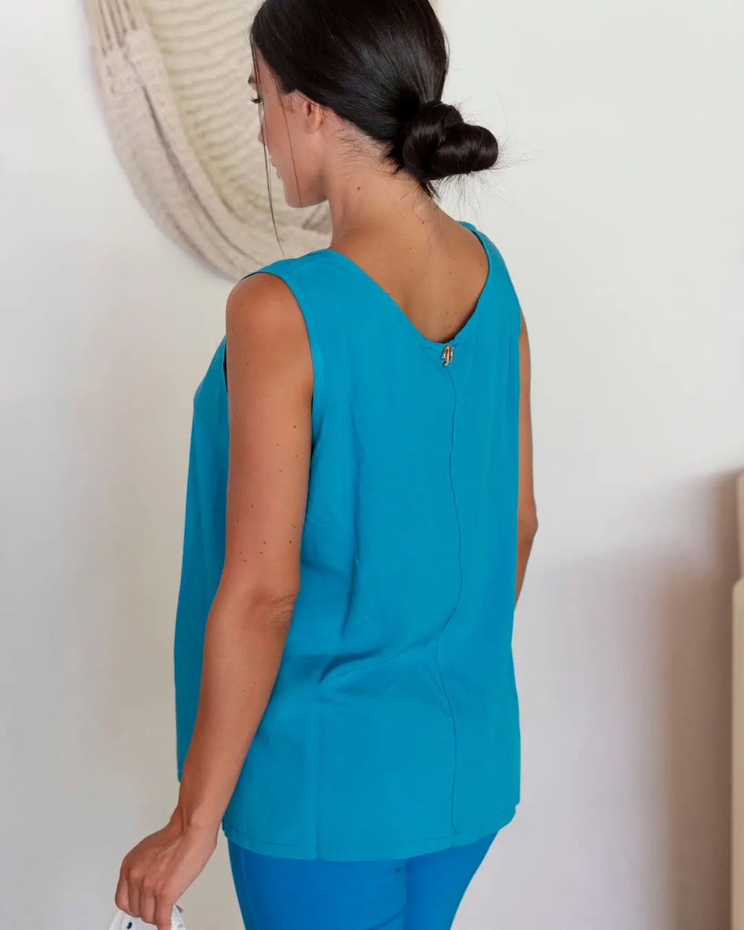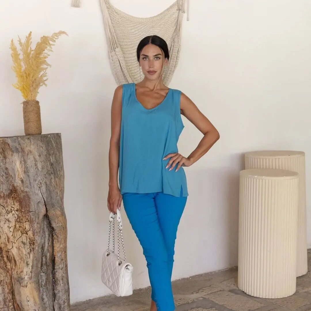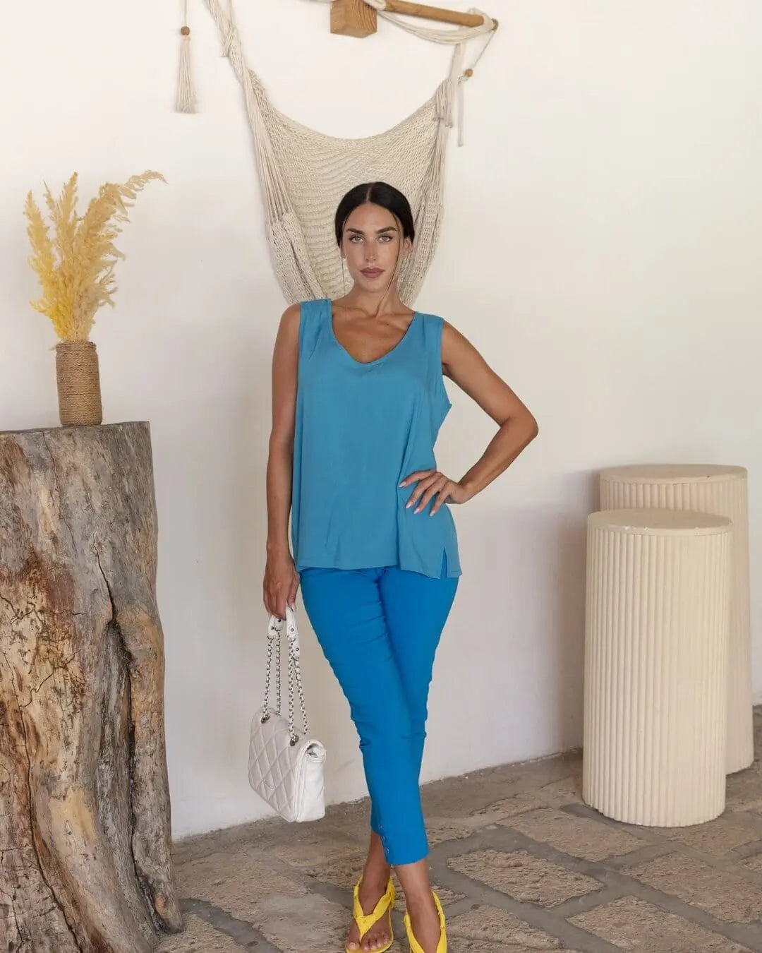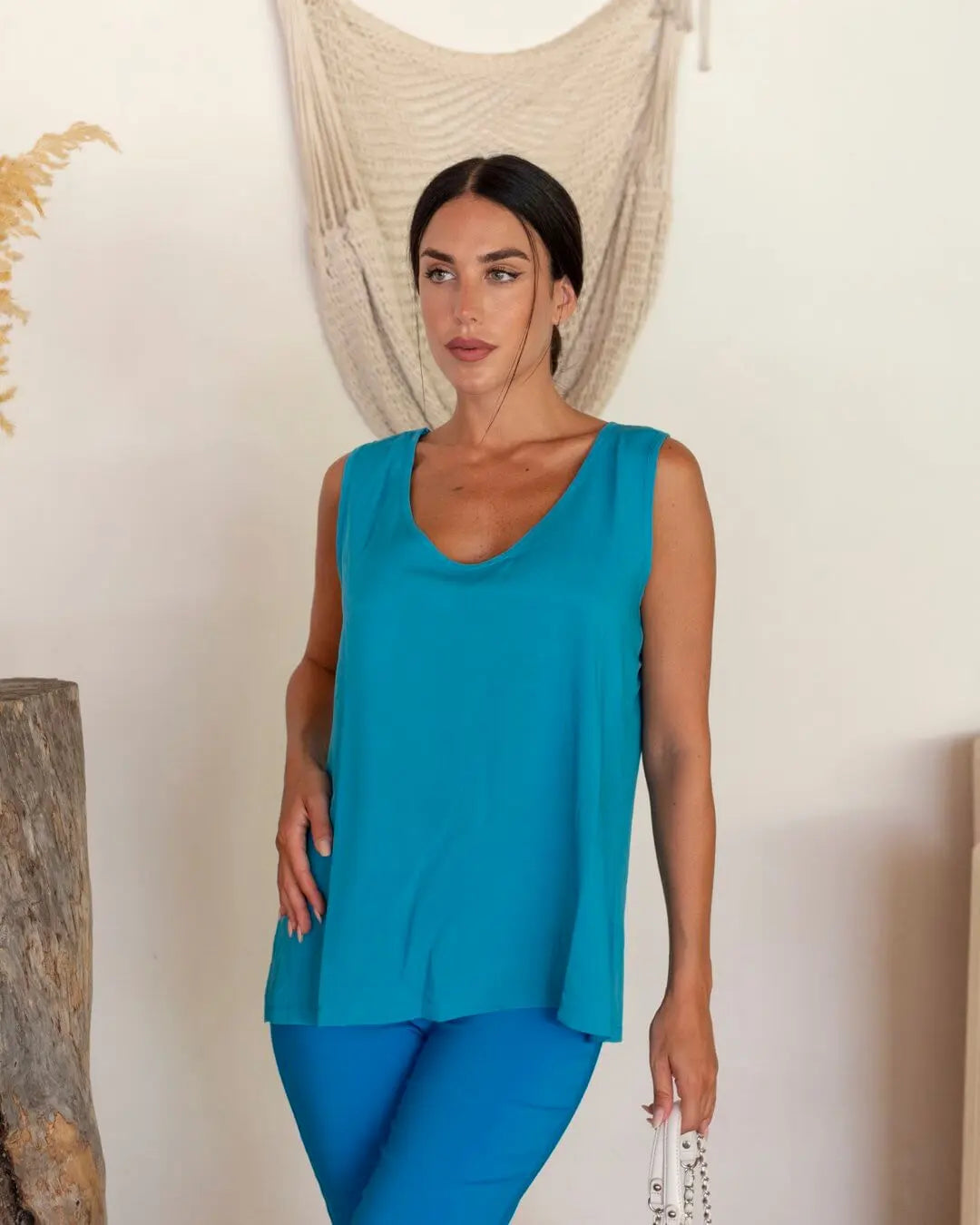 Camiseta de tirantes de cuello redondo de viscosa de color liso TURQUESA
