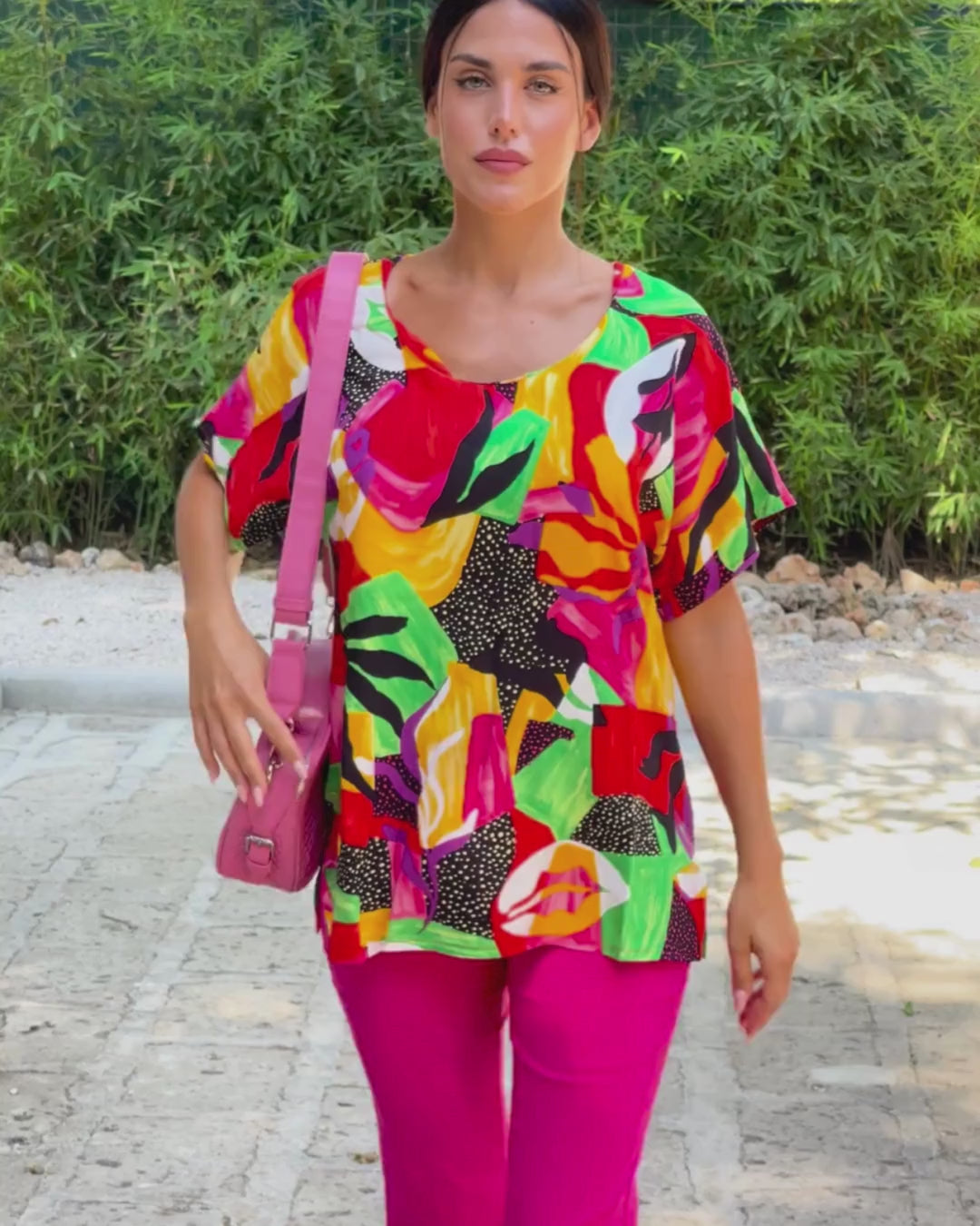 Blusa de viscosa con estampado coral de media manga y aberturas laterales CORAL