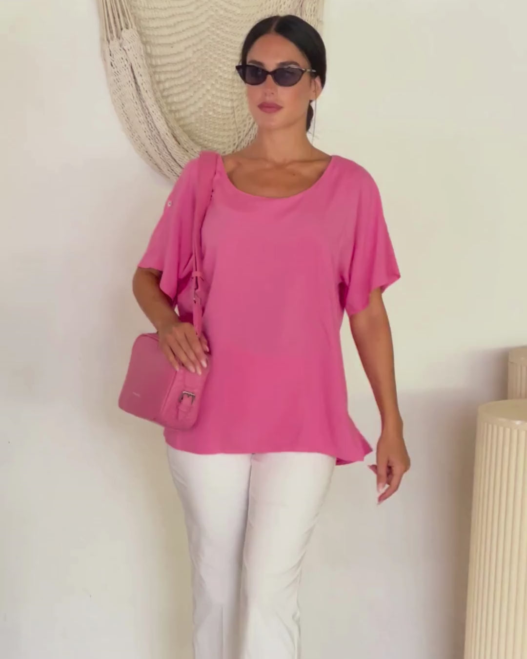 Blusa de media manga de viscosa de color liso con aberturas laterales ROSA