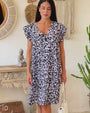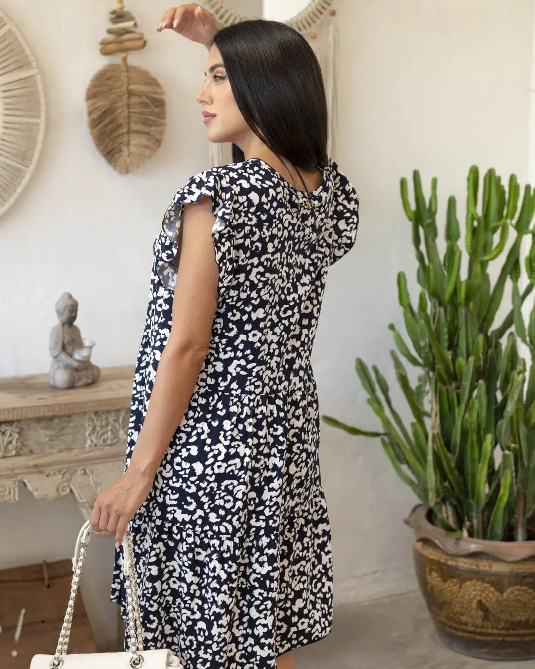 Vestido escote pico con volantes y estampado floral AZUL-BLANCO