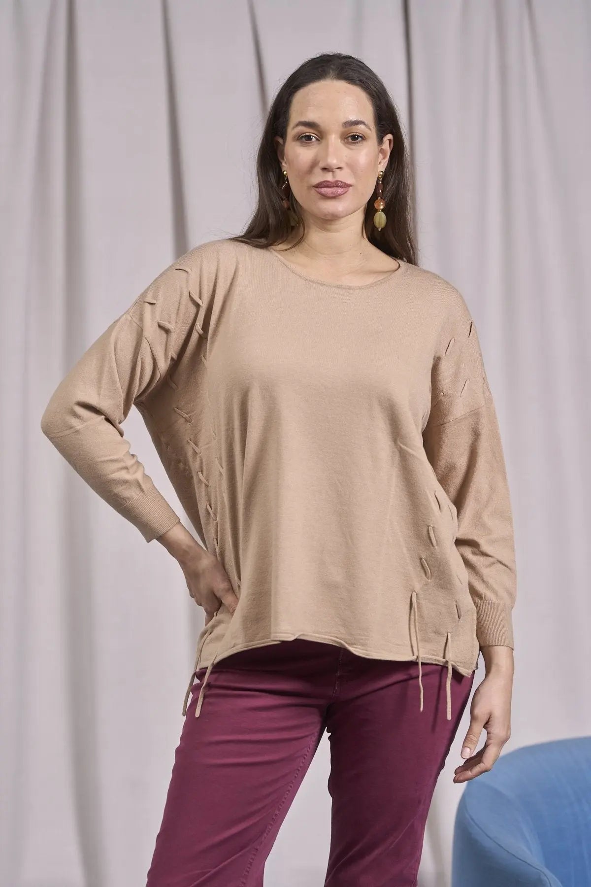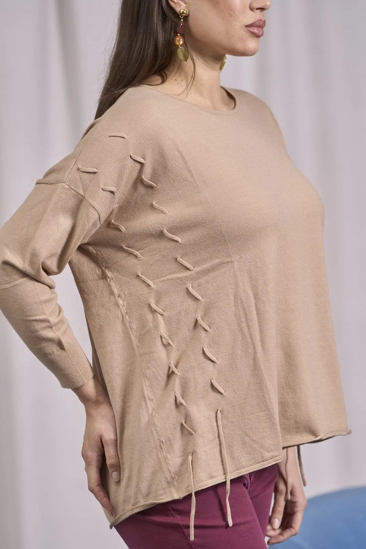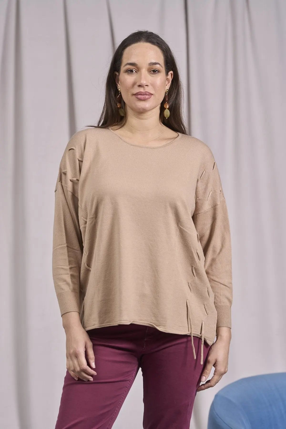 Suéter de cuello redondo con trenzas delanteras CAMEL
