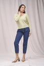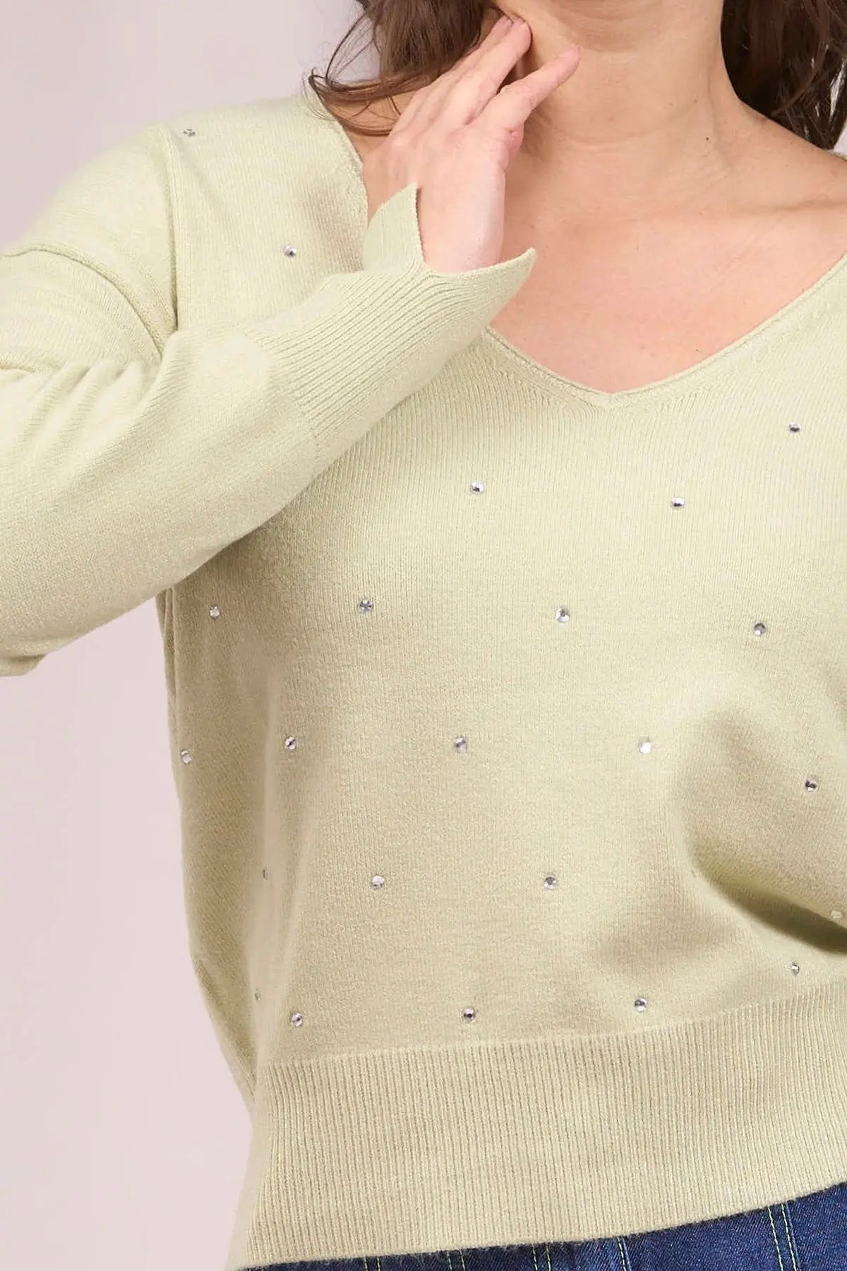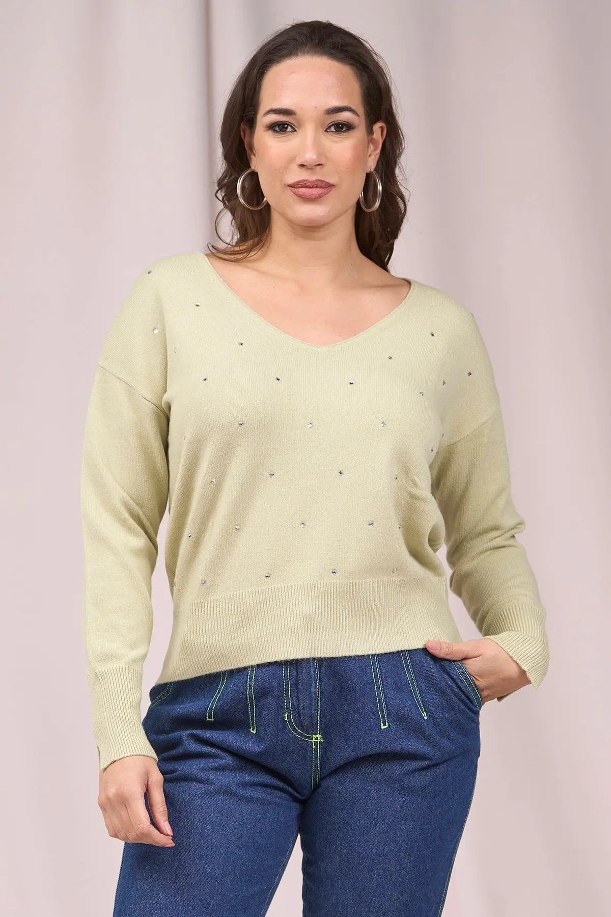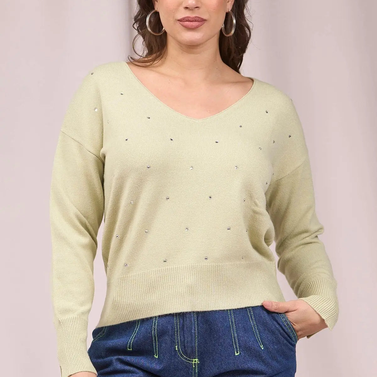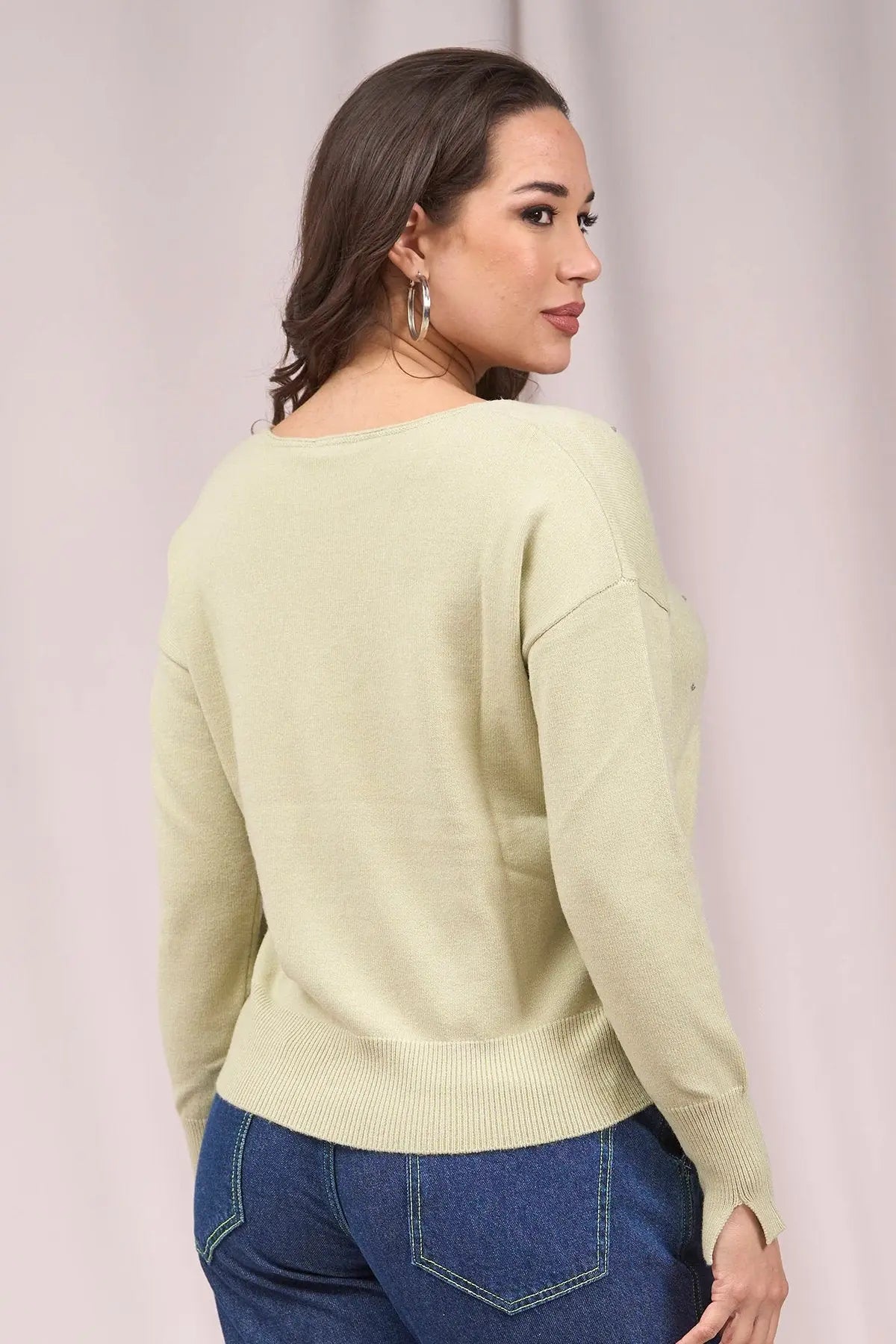 Suéter de cuello en V con pedrería delantera y aberturas VERDE