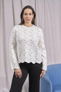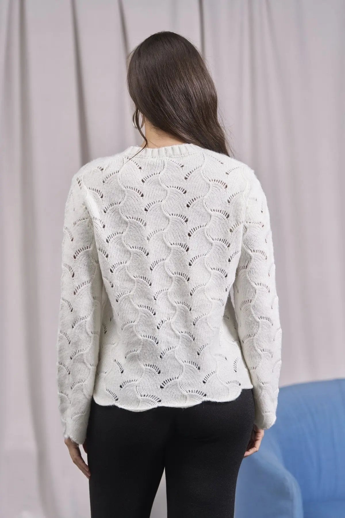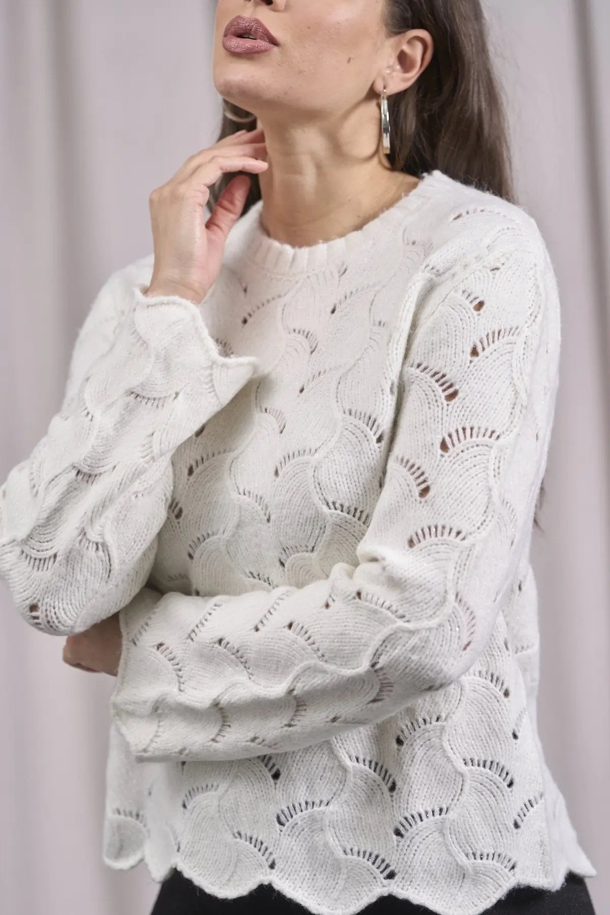 Suéter de punto intarsia con dobladillos festoneados en blanco roto