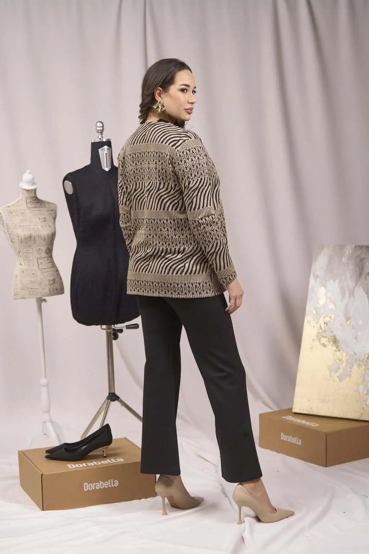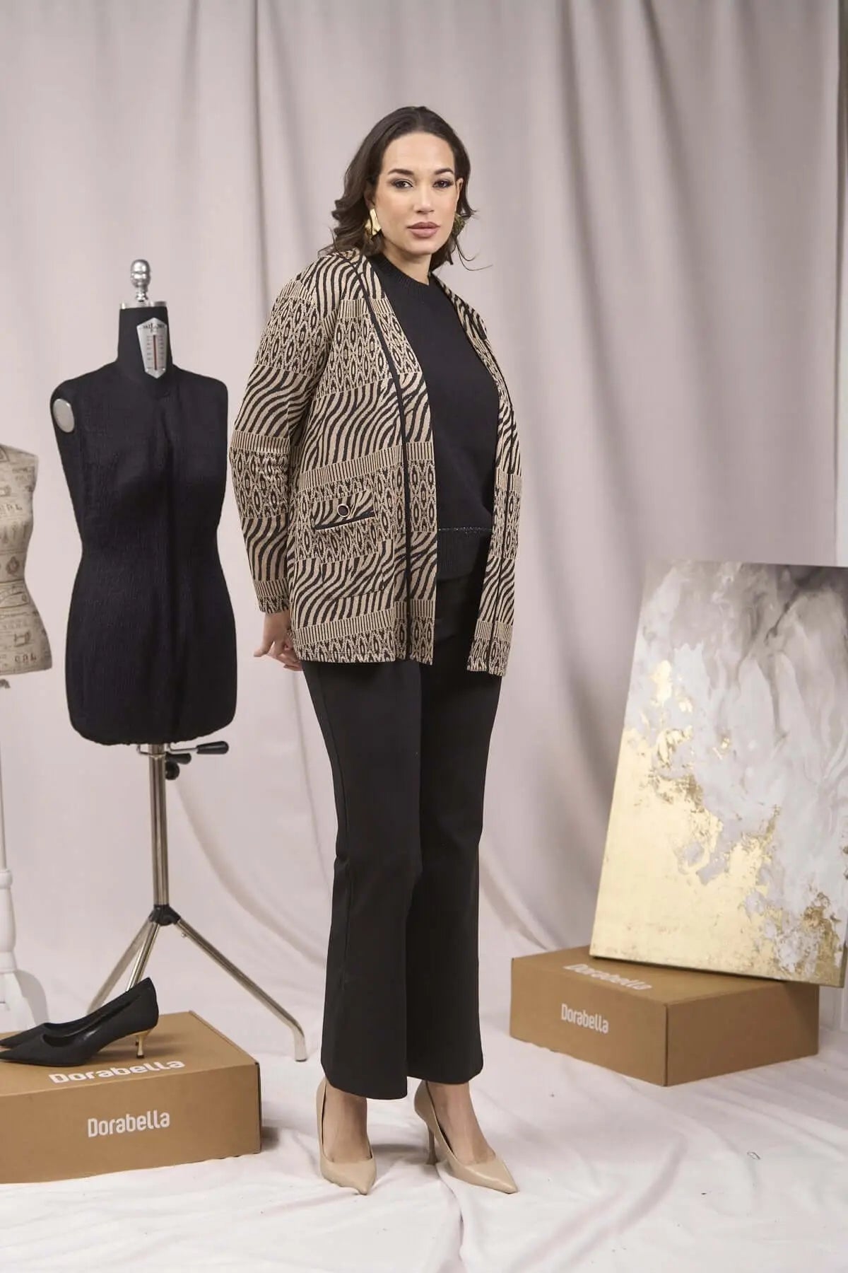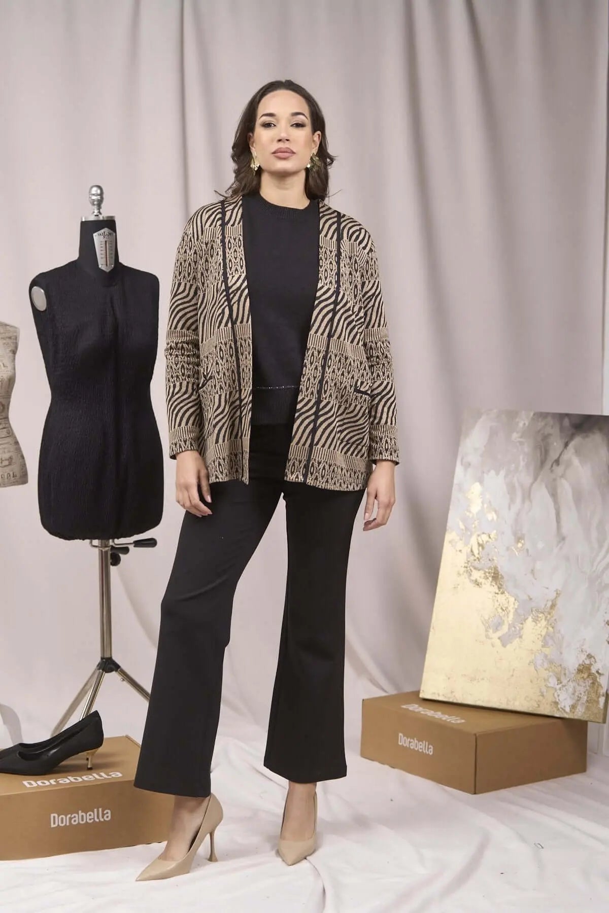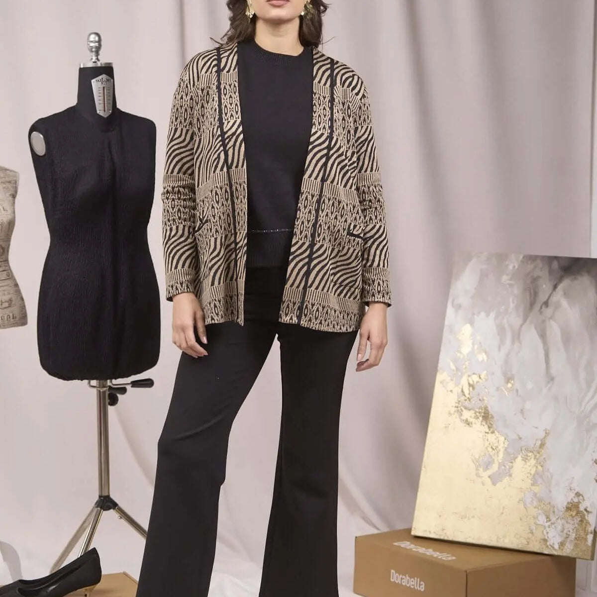 Cárdigan con bolsillos y estampado de jacquard y lúrex ORO-NEGRO