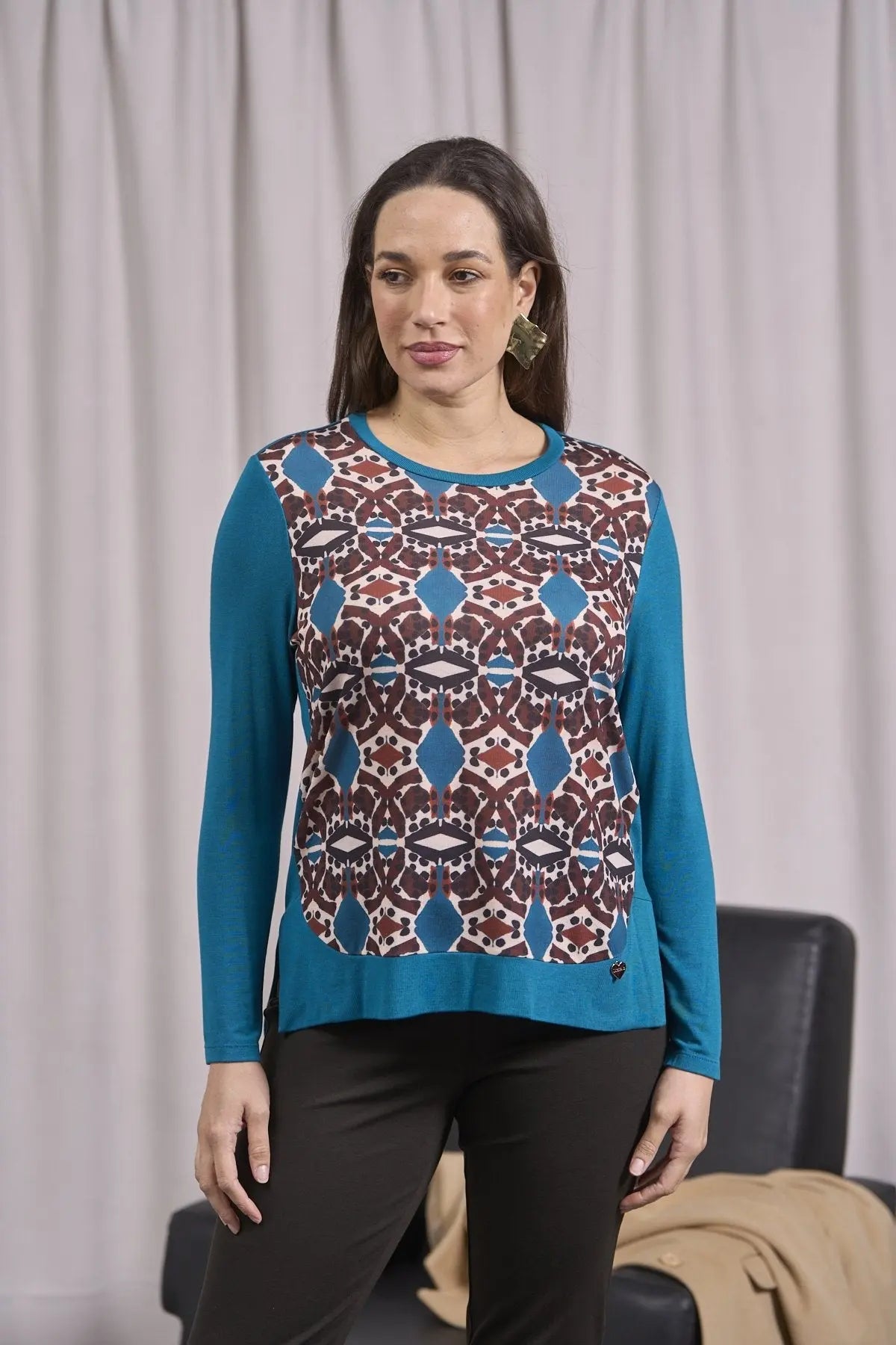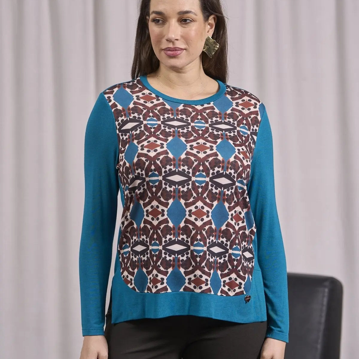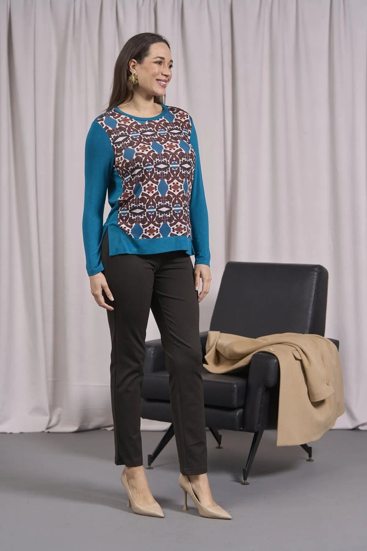 Suéter de color liso con inserción estampada y aberturas OTTE