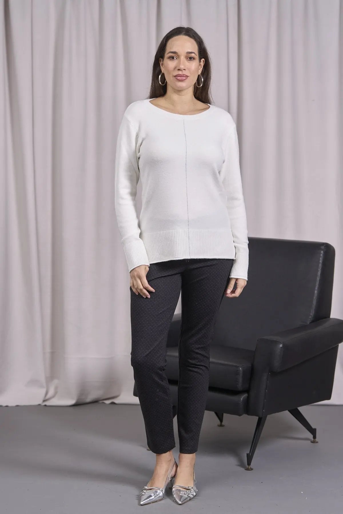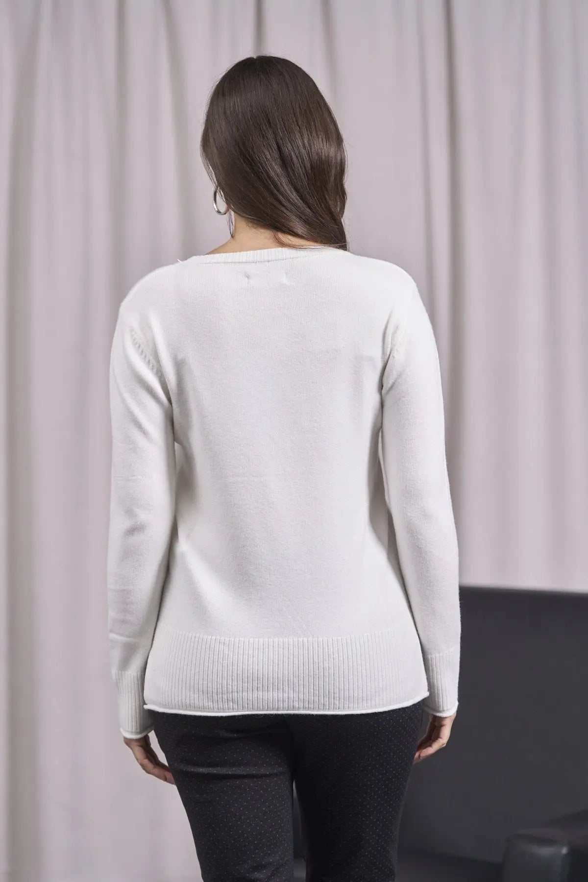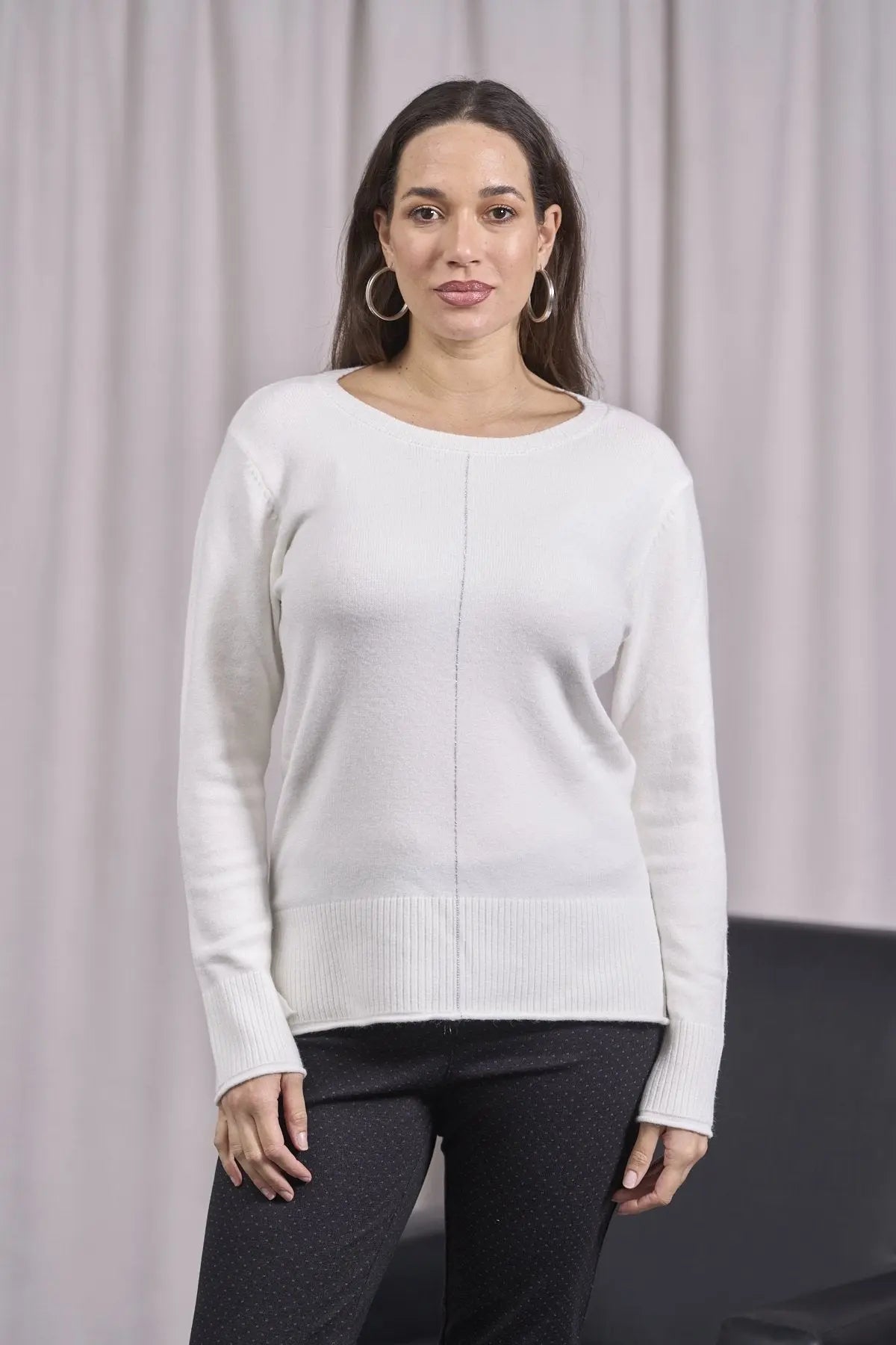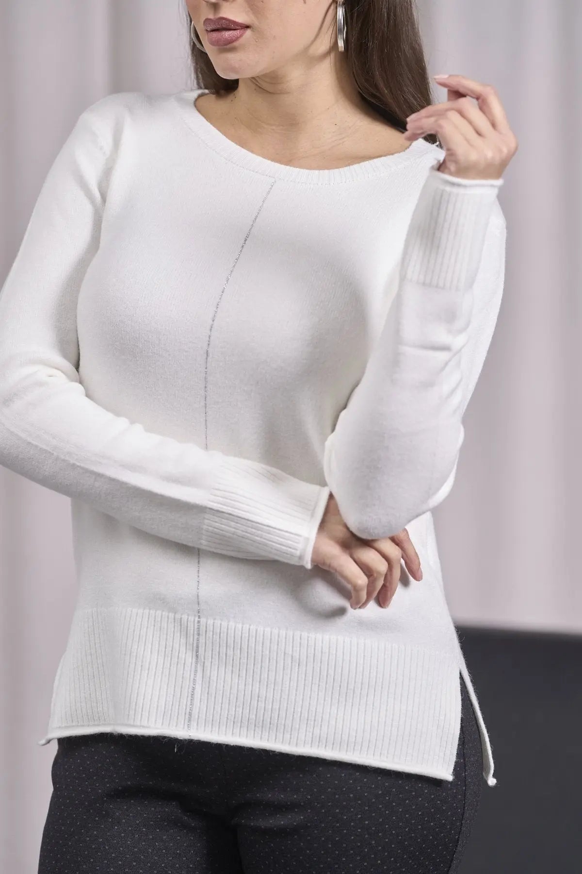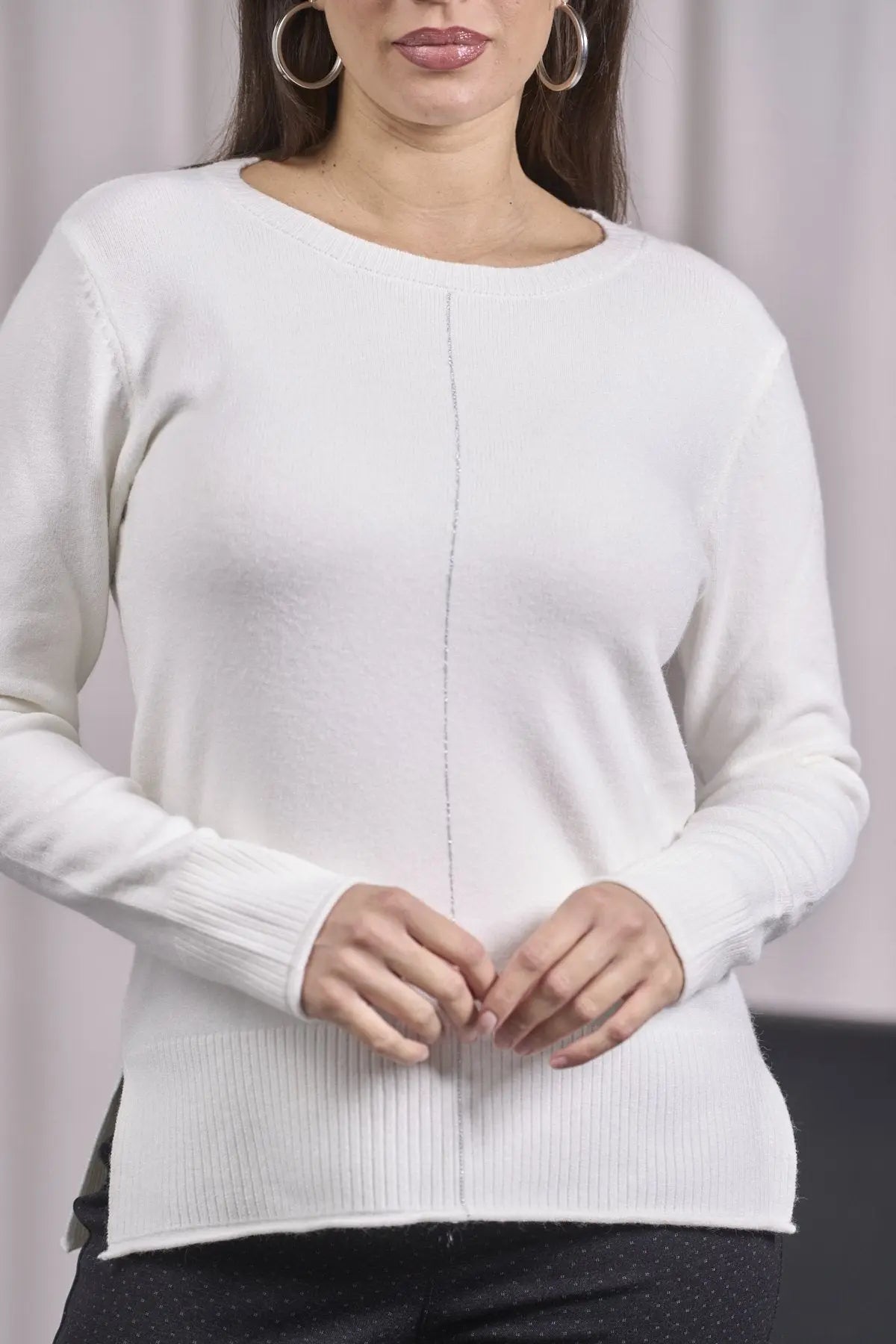 Suéter de cuello redondo con corte crudo, aberturas y canalé CREMA