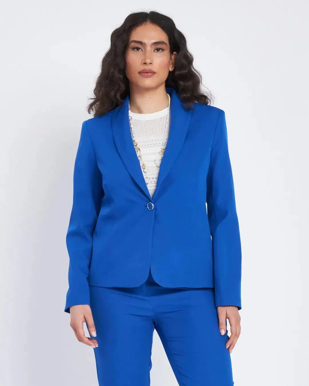 Líneas limpias y esenciales delinean la silueta de esta chaqueta recta con cuello chal: diseñada en bistretch, el cierre es sencillo con botón.