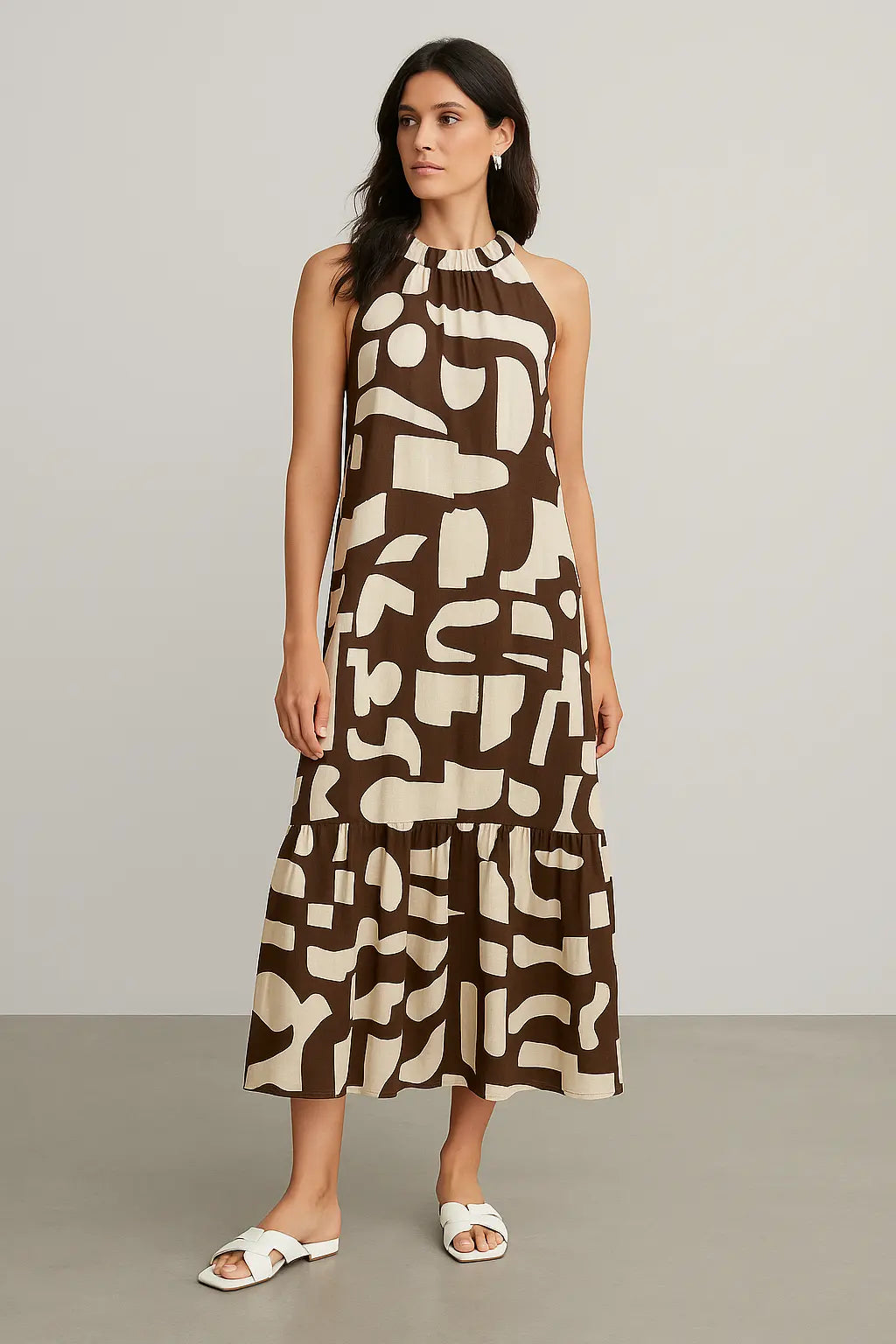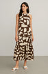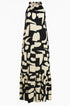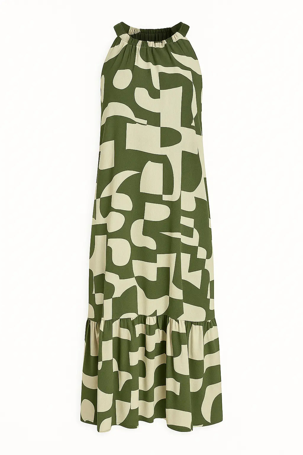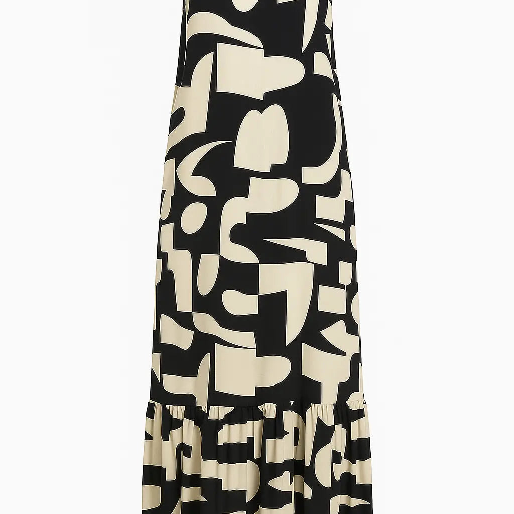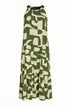 Elegante e contemporaneo, questo abito lungo è la scelta ideale per distinguersi con stile durante la stagione calda. Realizzato in un leggero tessuto stampato, si caratterizza per il suo design con scollo all’americana e giromanica a vogatore, che valorizza le spalle con femminilità. La balza sul fondo aggiunge volume e movimento, mentre la stampa grafica in verde militare dona un tocco moderno e versatile. Perfetto sia per il giorno con sandali flat che per la sera con accessori più sofisticati.