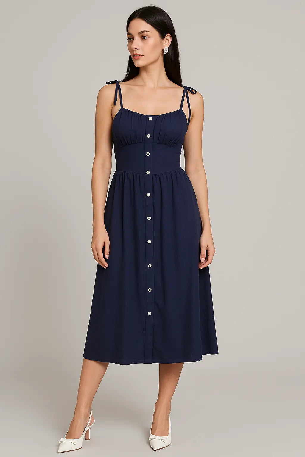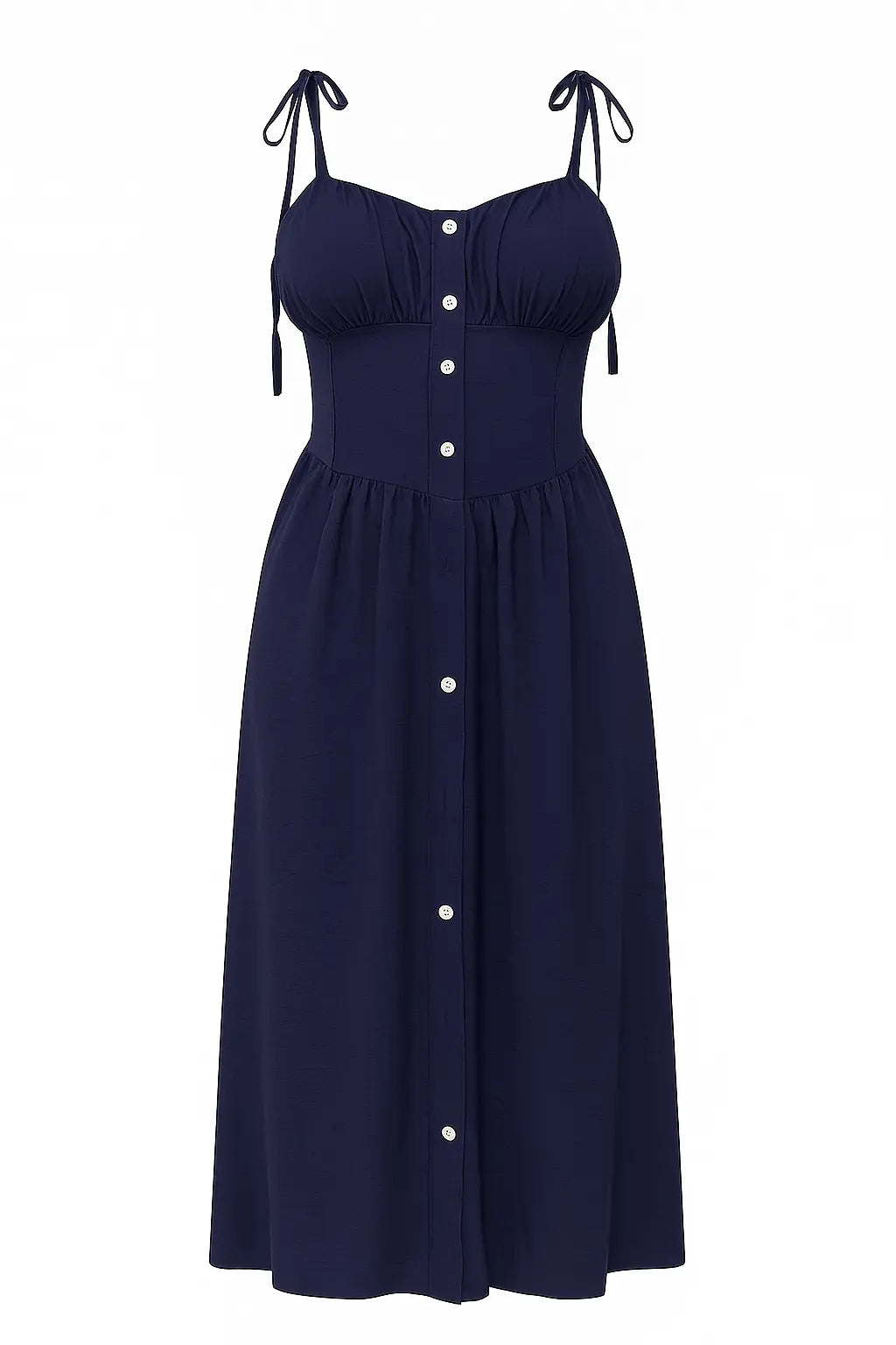 Femminile, essenziale ed estremamente versatile: questo abito midi in blue navy con bretelline annodate rappresenta il perfetto equilibrio tra comfort e stile. Il corpino con coppette interne valorizza il décolleté, mentre la baschina segna delicatamente il punto vita. Il design è completato da un'elegante abbottonatura frontale e da una gonna fluida, senza tagli, che scivola leggera lungo la silhouette. Realizzato in tessuto leggero ed effetto crinkle, è l’ideale per affrontare le giornate più calde con eleganza disinvolta.