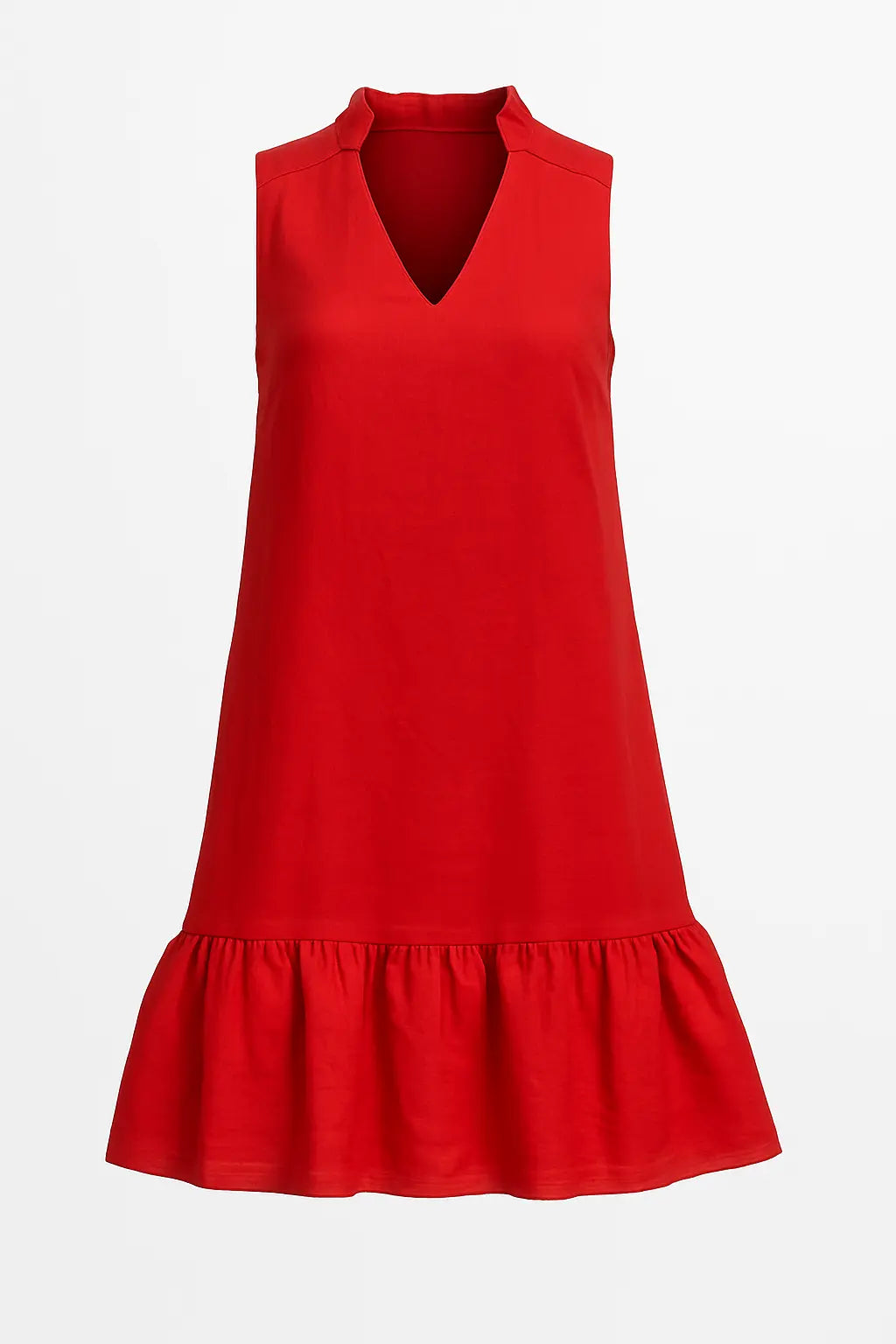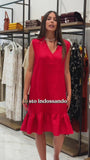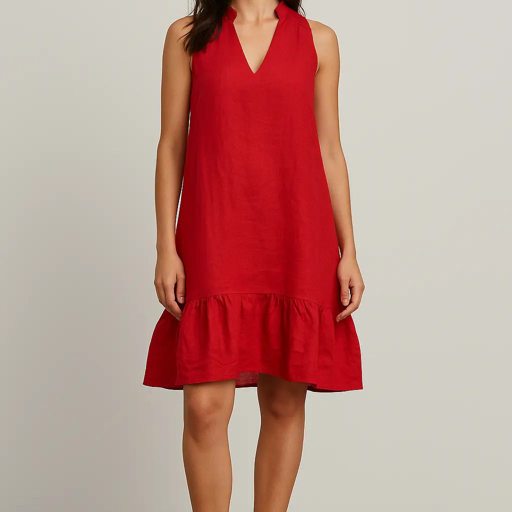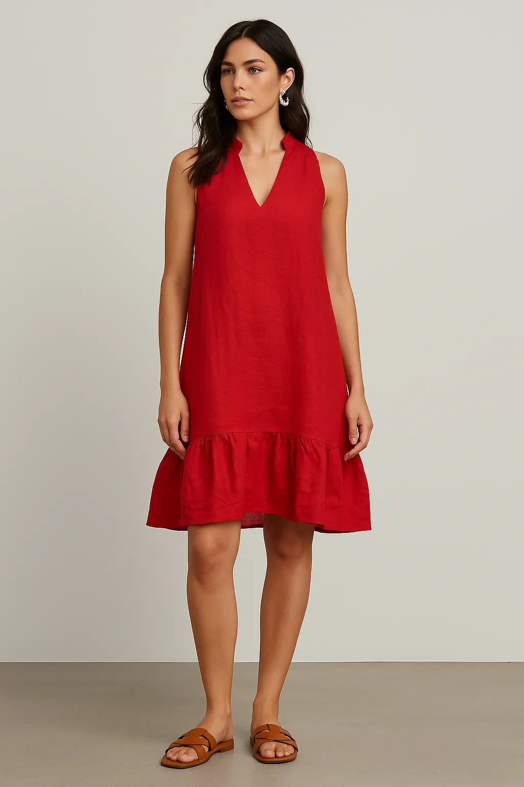 Questo abito balza in lino è il perfetto mix di eleganza e praticità. Con il suo scollo a V e la balza sul fondo, si adatta perfettamente sia a occasioni mattutine che serali. Lo stile easy chic lo rende fresco e sofisticato, ideale per un look ricercato.