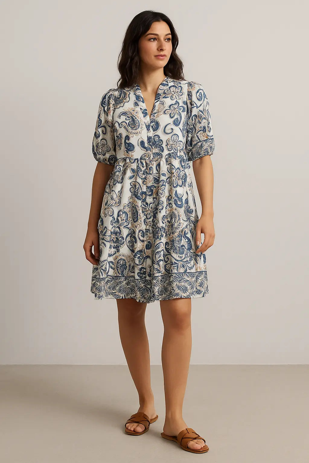 Questo abito trendy è un must-have per ogni donna! Con il suo scollo a V, i bottoni e la leggera svolazzantezza, ti farà sentire comoda e femminile in ogni occasione. Realizzato in morbida viscosa a fantasia, sarà il compagno perfetto in città o durante le vacanze. Aggiungilo subito al tuo guardaroba!