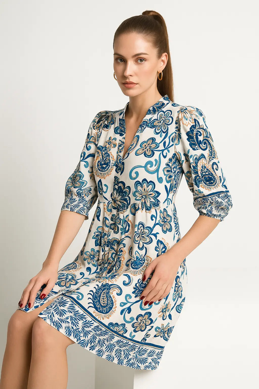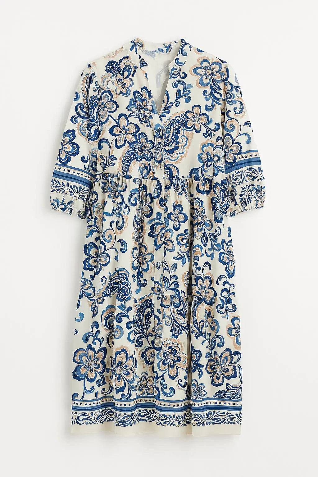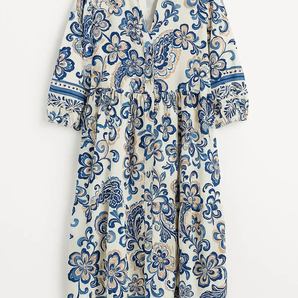Abito con scollo a V e bottoni in viscosa a fantasia