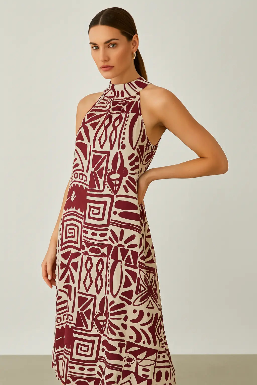 Dall’allure etnico-contemporanea, questo abito lungo è un inno alla leggerezza e alla femminilità. Realizzato in tessuto fluido e fresco, presenta un’elegante scollatura all’americana che valorizza le spalle e slancia la figura. La stampa grafica a motivi geometrici bordeaux su fondo chiaro conferisce personalità e movimento al capo.