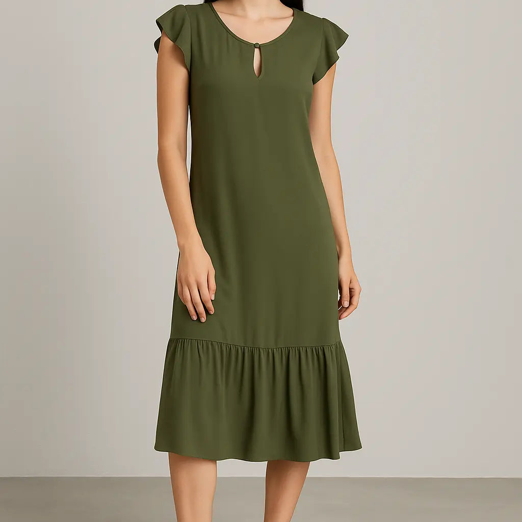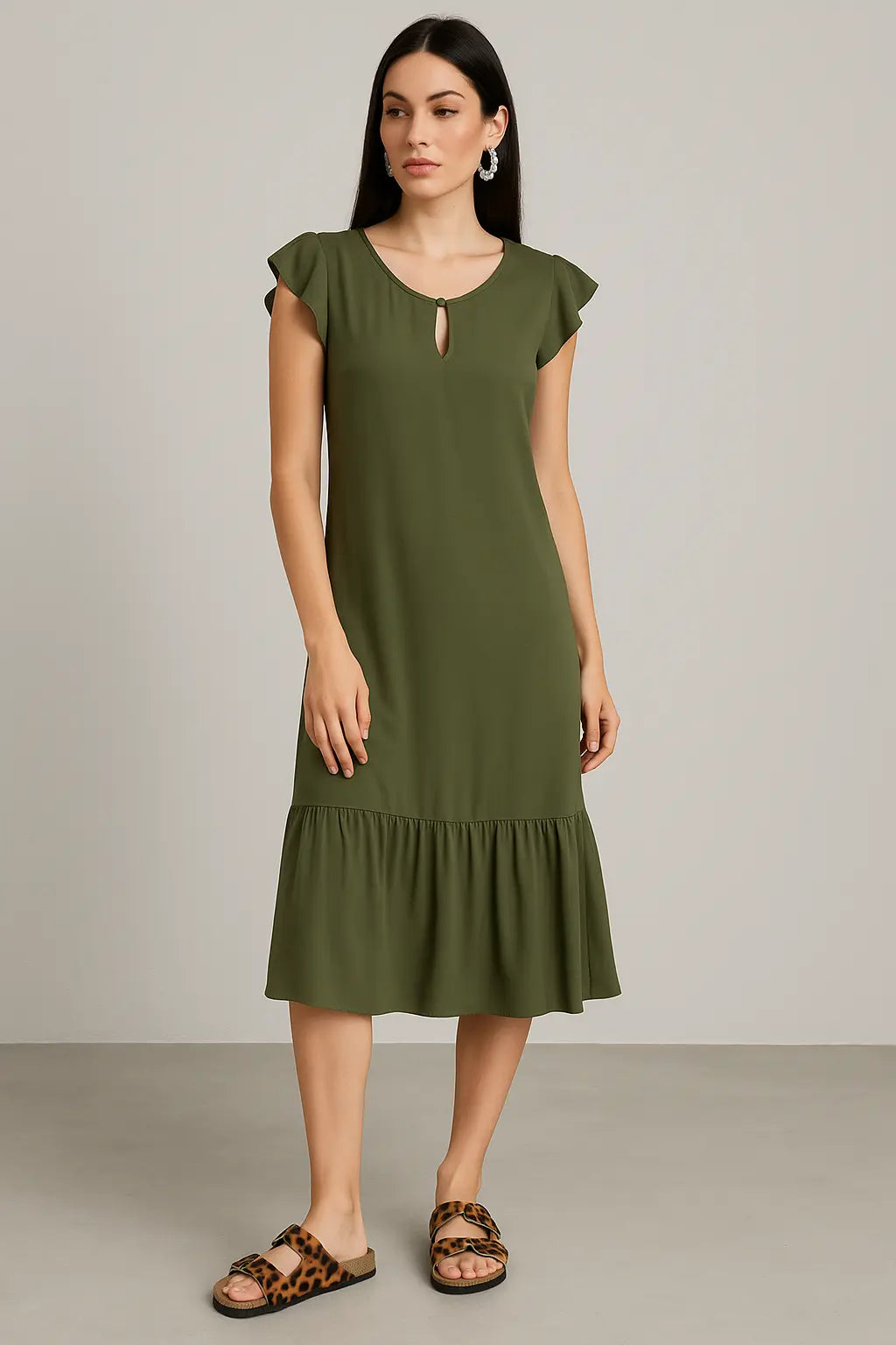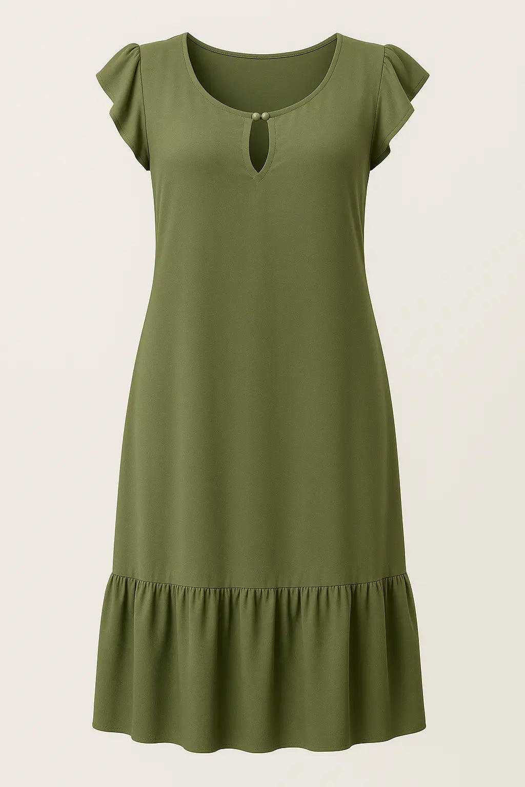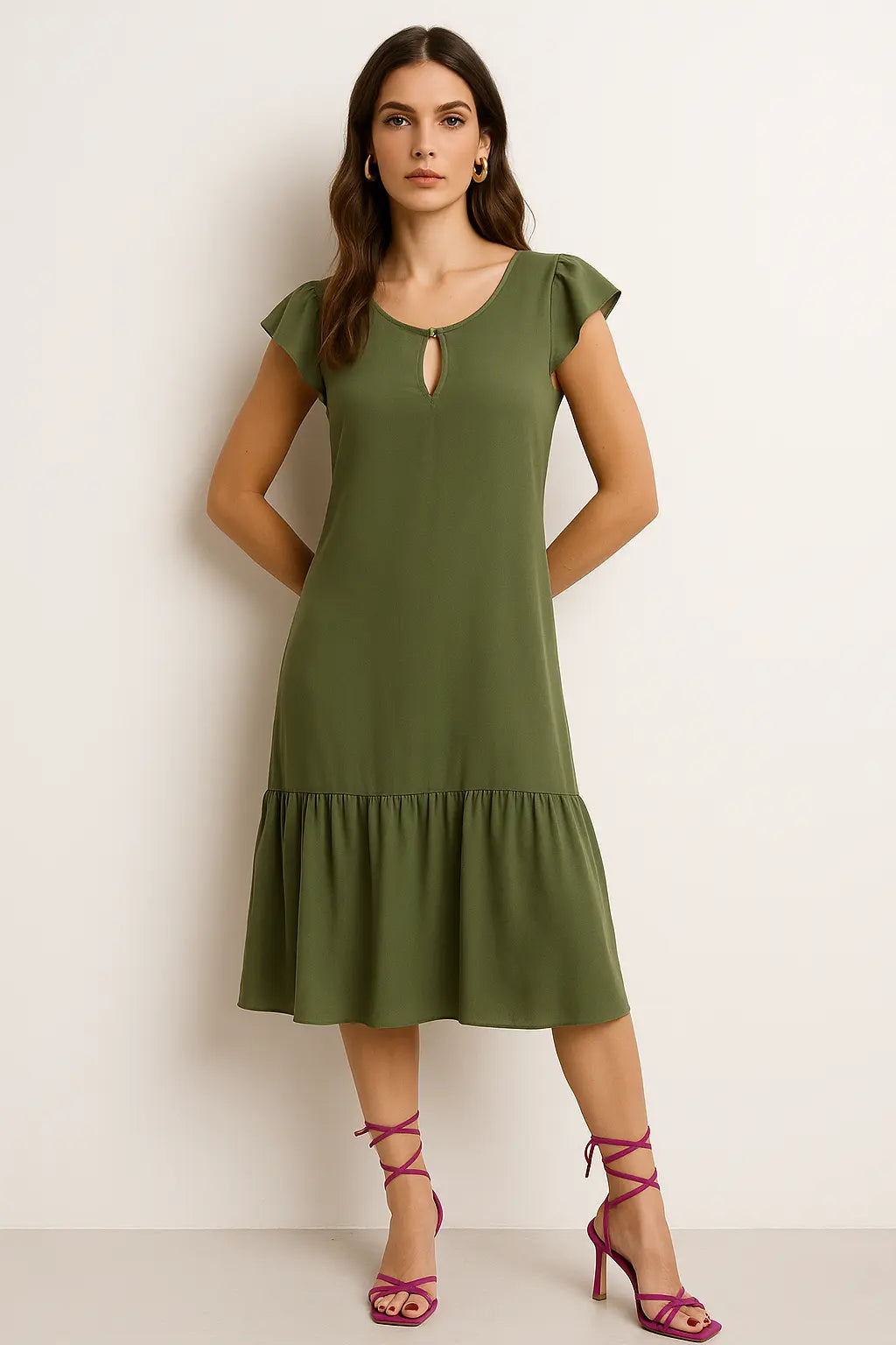 Rinnova il tuo guardaroba estivo con questo elegante abito corto in tessuto fluido color verde militare. Il design semplice ma sofisticato è valorizzato da uno scollo stondato con goccia e bottone rivestito tono su tono, maniche ad aletta femminili e una balza sul fondo che dona volume e movimento. Perfetto da indossare sia di giorno con sandali bassi, sia di sera con accessori più ricercati, questo capo è un must-have per uno stile pratico ma chic.