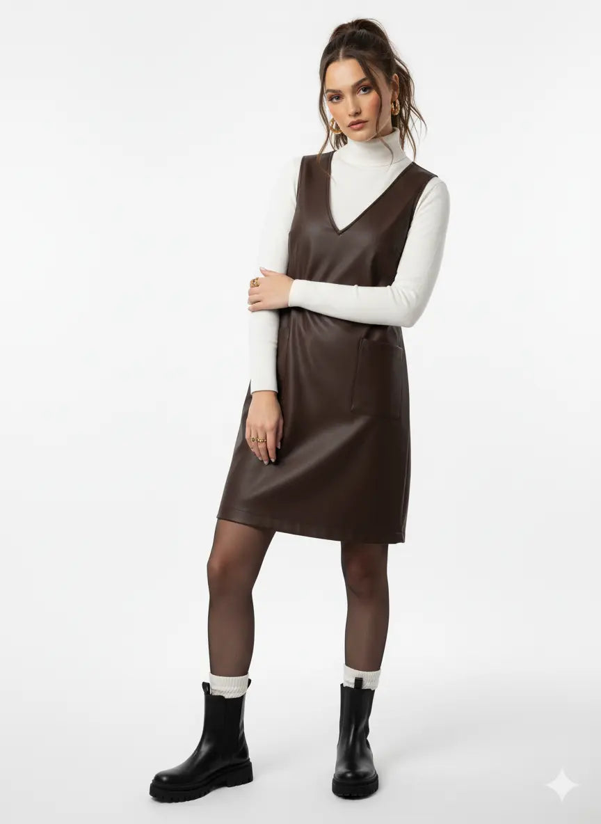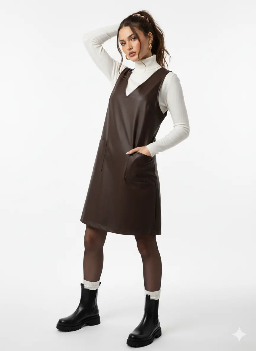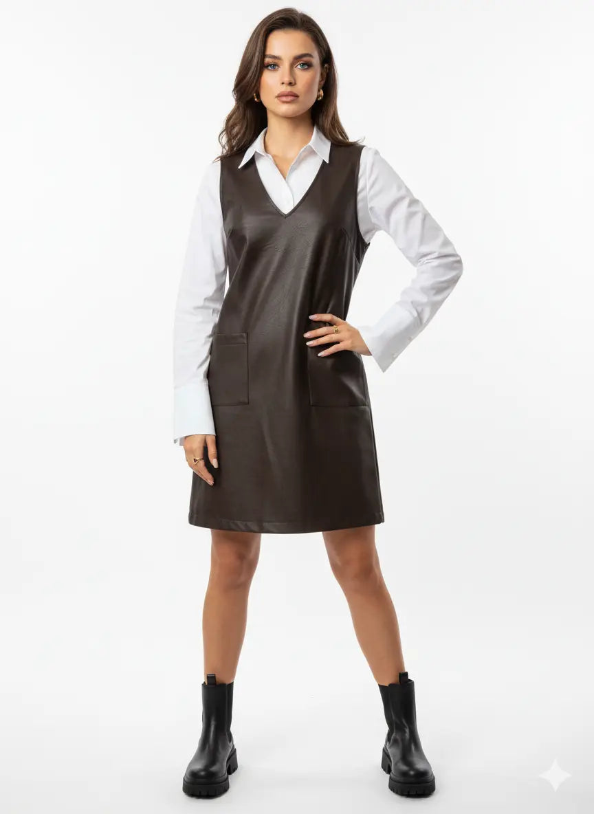 Aggiungi un tocco moderno e sofisticato al tuo guardaroba con questo abito in eco pelle con scollo a V, un capo di tendenza ideale da indossare con camicie, dolcevita o da solo per un look deciso e contemporaneo. La silhouette morbida e la finitura effetto pelle lo rendono perfetto per outfit urban-chic, da giorno e da sera.