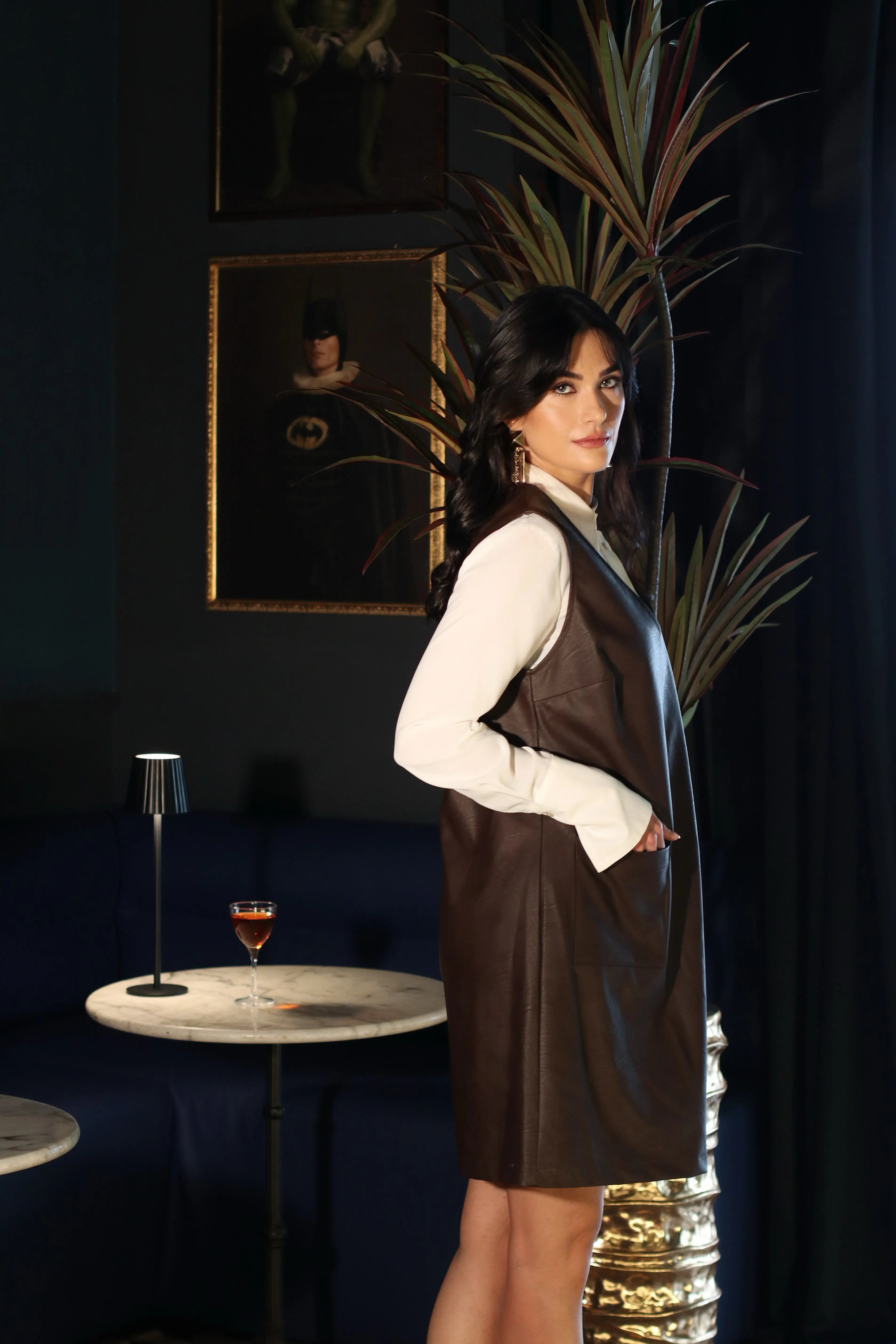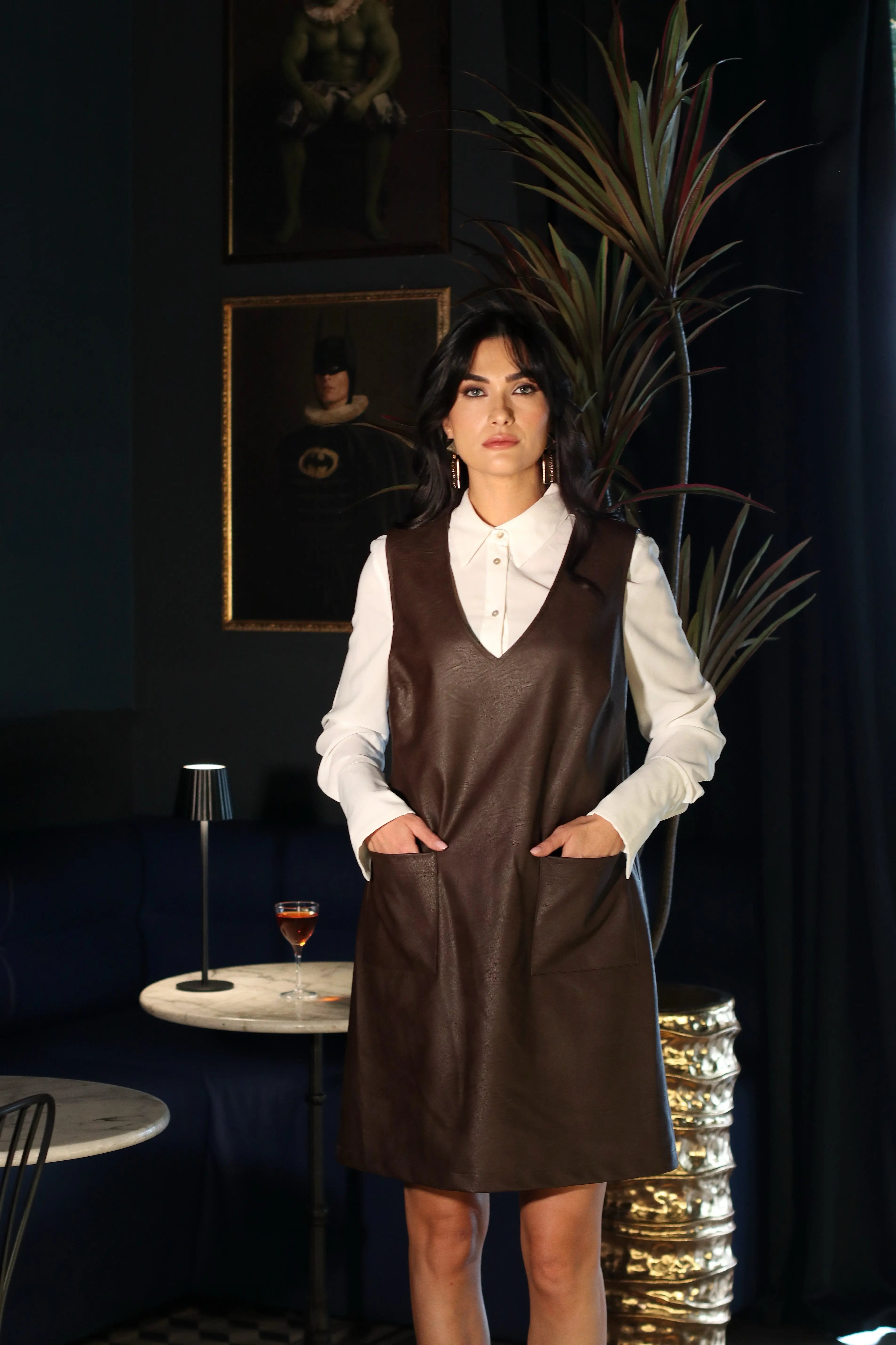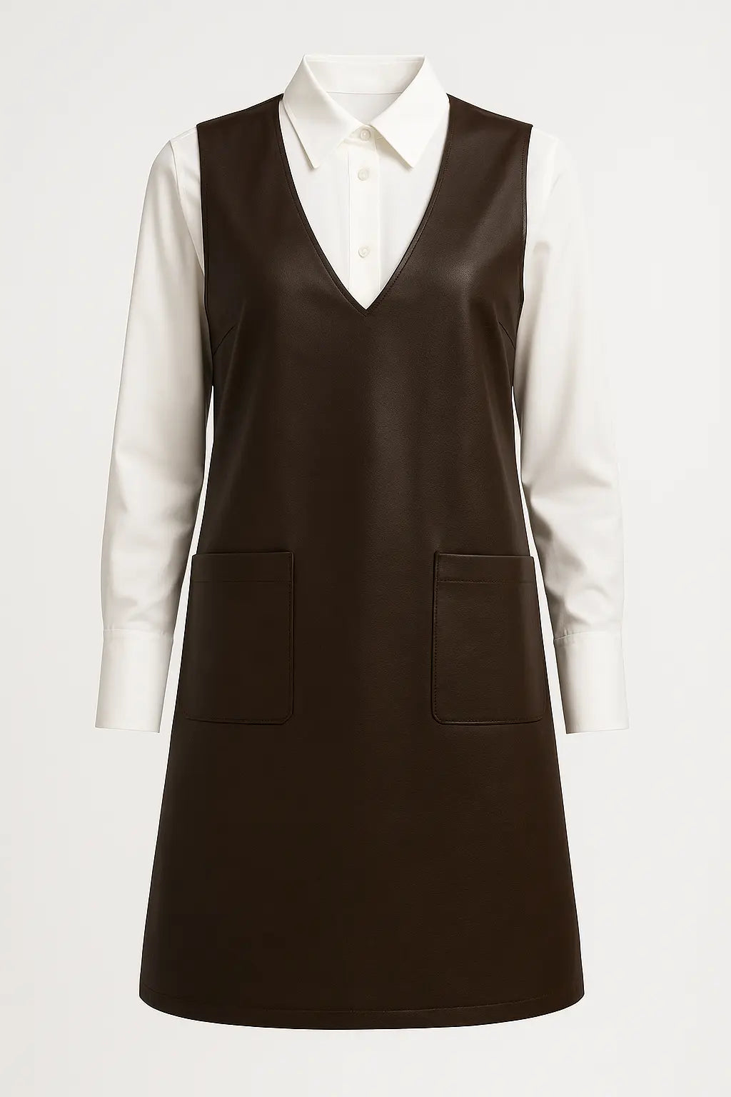 Aggiungi un tocco moderno e sofisticato al tuo guardaroba con questo abito in eco pelle con scollo a V, un capo di tendenza ideale da indossare con camicie, dolcevita o da solo per un look deciso e contemporaneo. La silhouette morbida e la finitura effetto pelle lo rendono perfetto per outfit urban-chic, da giorno e da sera.