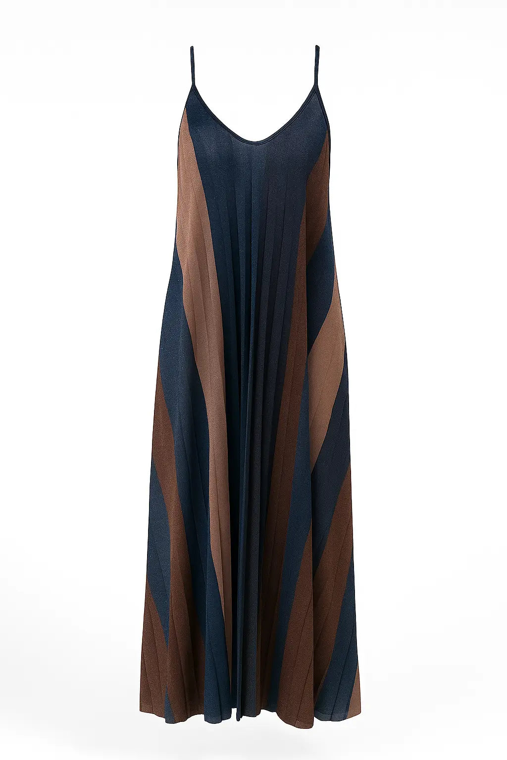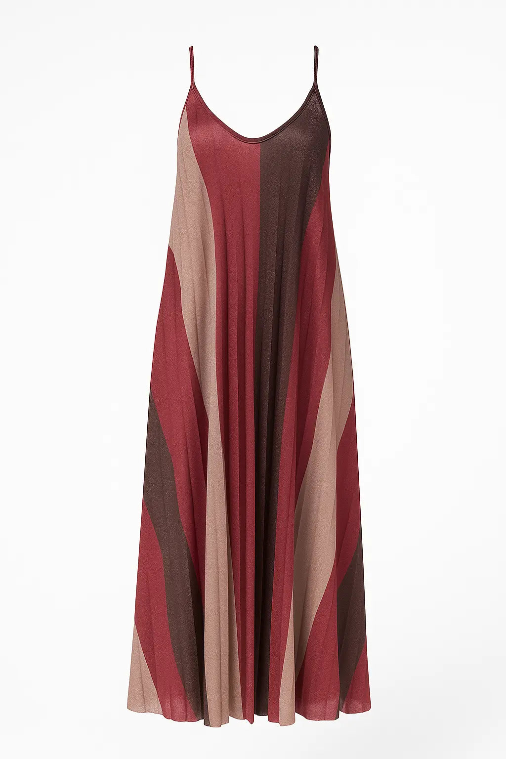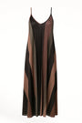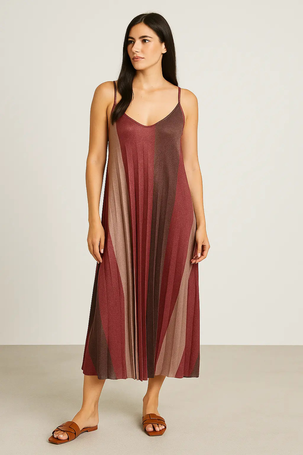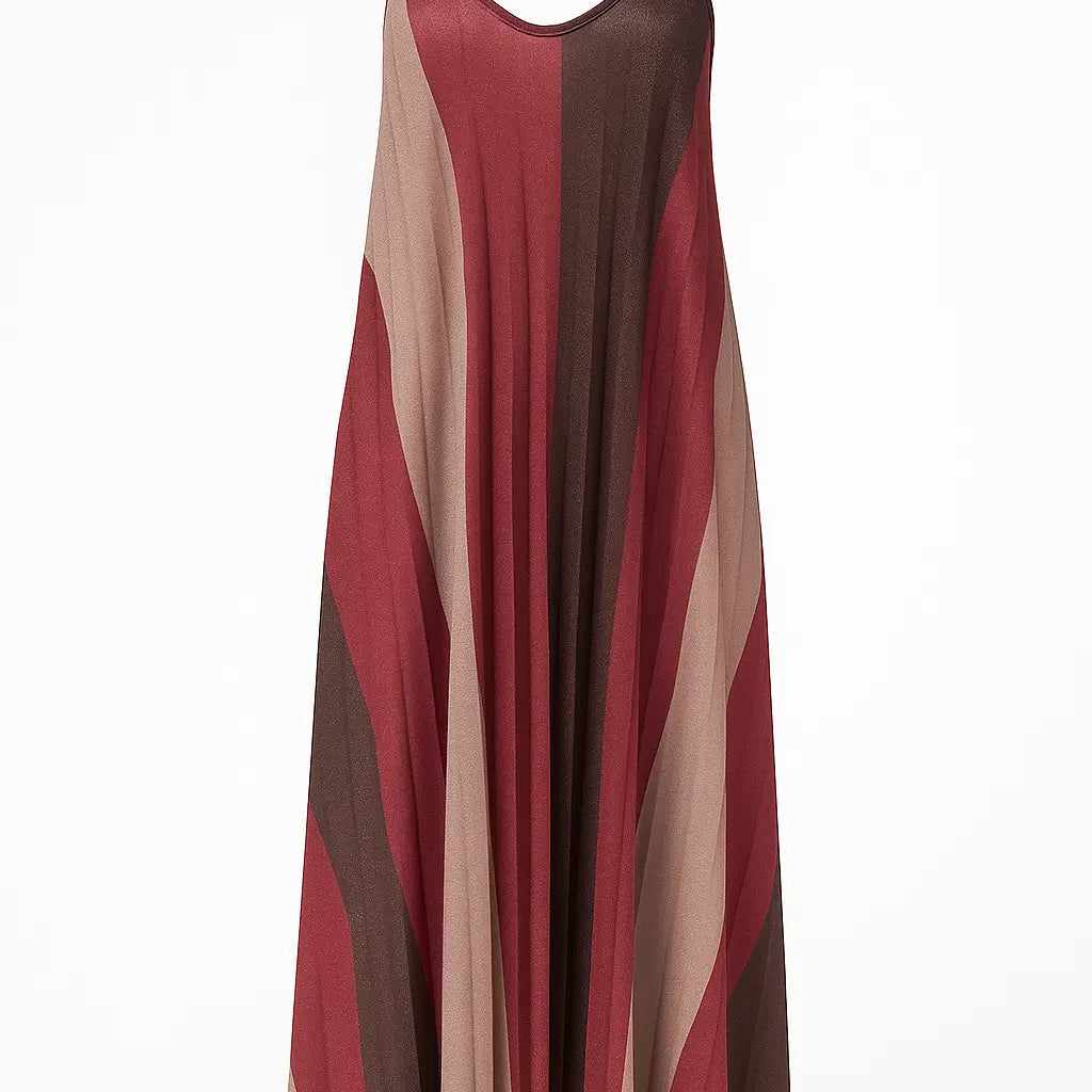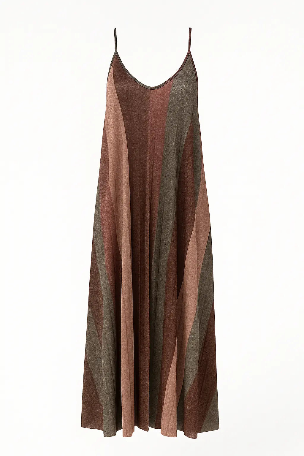 Scintilla con eleganza in questo abito lungo a bretelline firmato Dorabella. Realizzato in tessuto lurex plissettato, presenta una fantasia geometrica degradé nei toni caldi del bordeaux, bronzo e nude che slanciano la figura con delicatezza. Il fit morbido e la silhouette fluida lo rendono perfetto per le serate estive, cerimonie o occasioni speciali. Le spalline sottili e lo scollo a V donano femminilità e leggerezza.