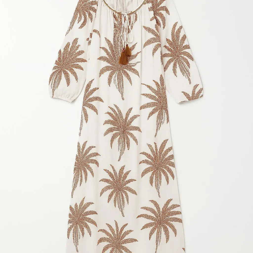 Questo abito lungo a fantasia è una scelta di moda perfetta per una vacanza al mare. I laccetti e le nappine allo scollo donano un tocco di eleganza e femminilità. Ideale per una passeggiata sulla spiaggia o una serata chic. Abbinabile con sandali per un look easy e glam.