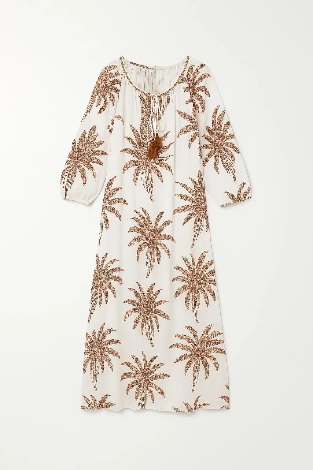 Abito lungo a fantasia con laccetti e nappine allo scollo