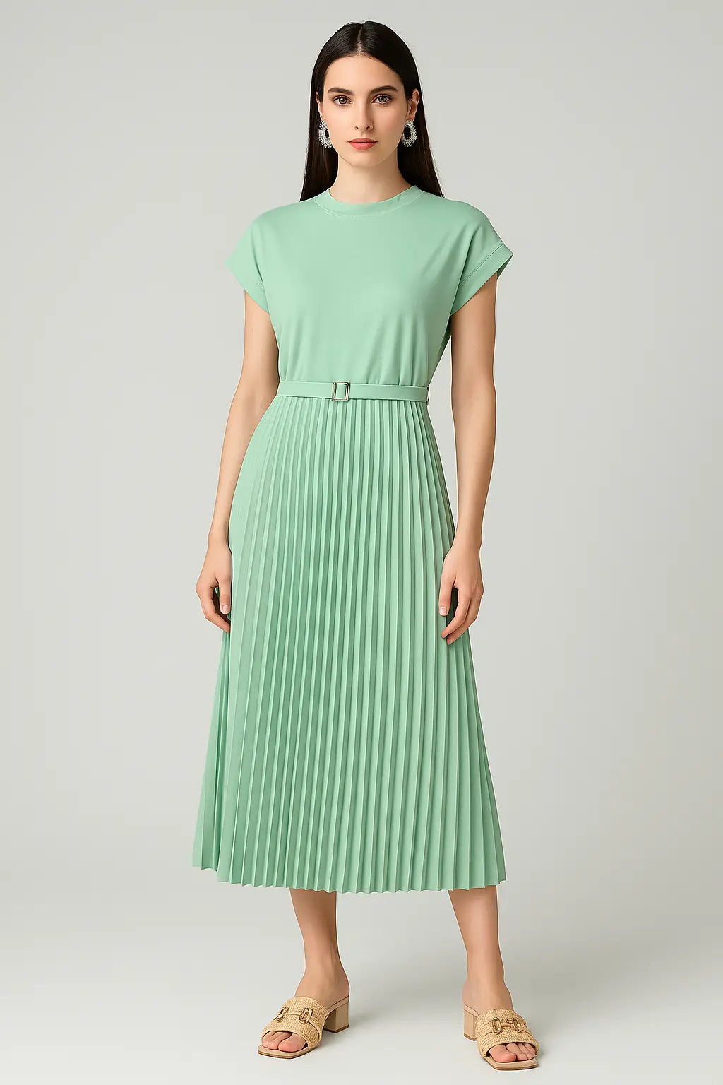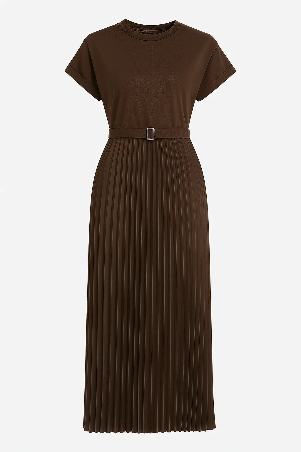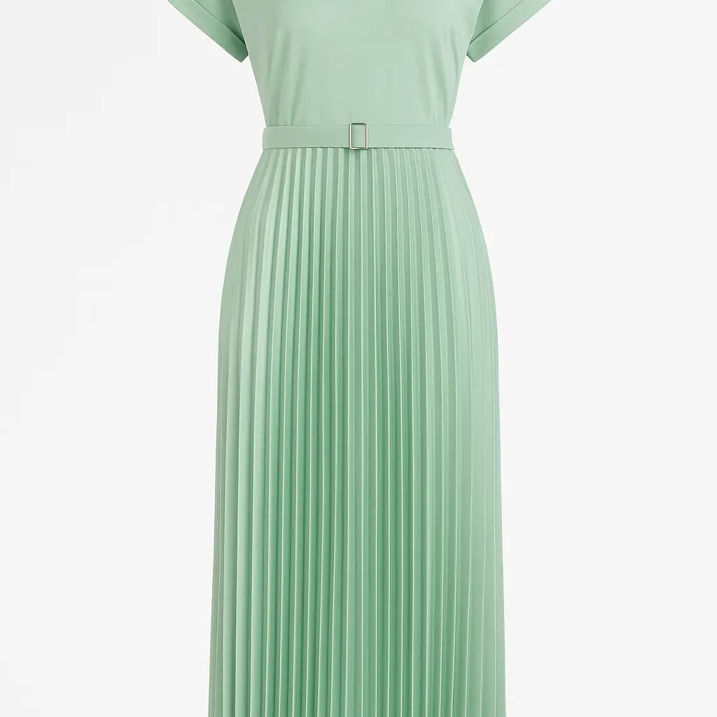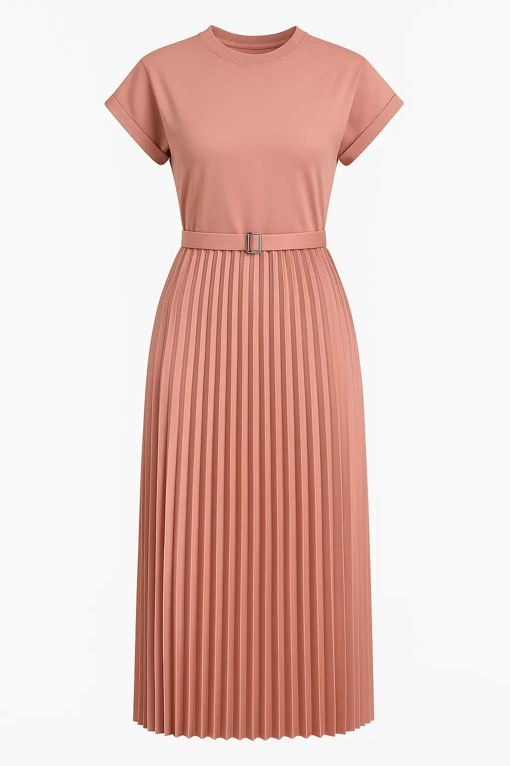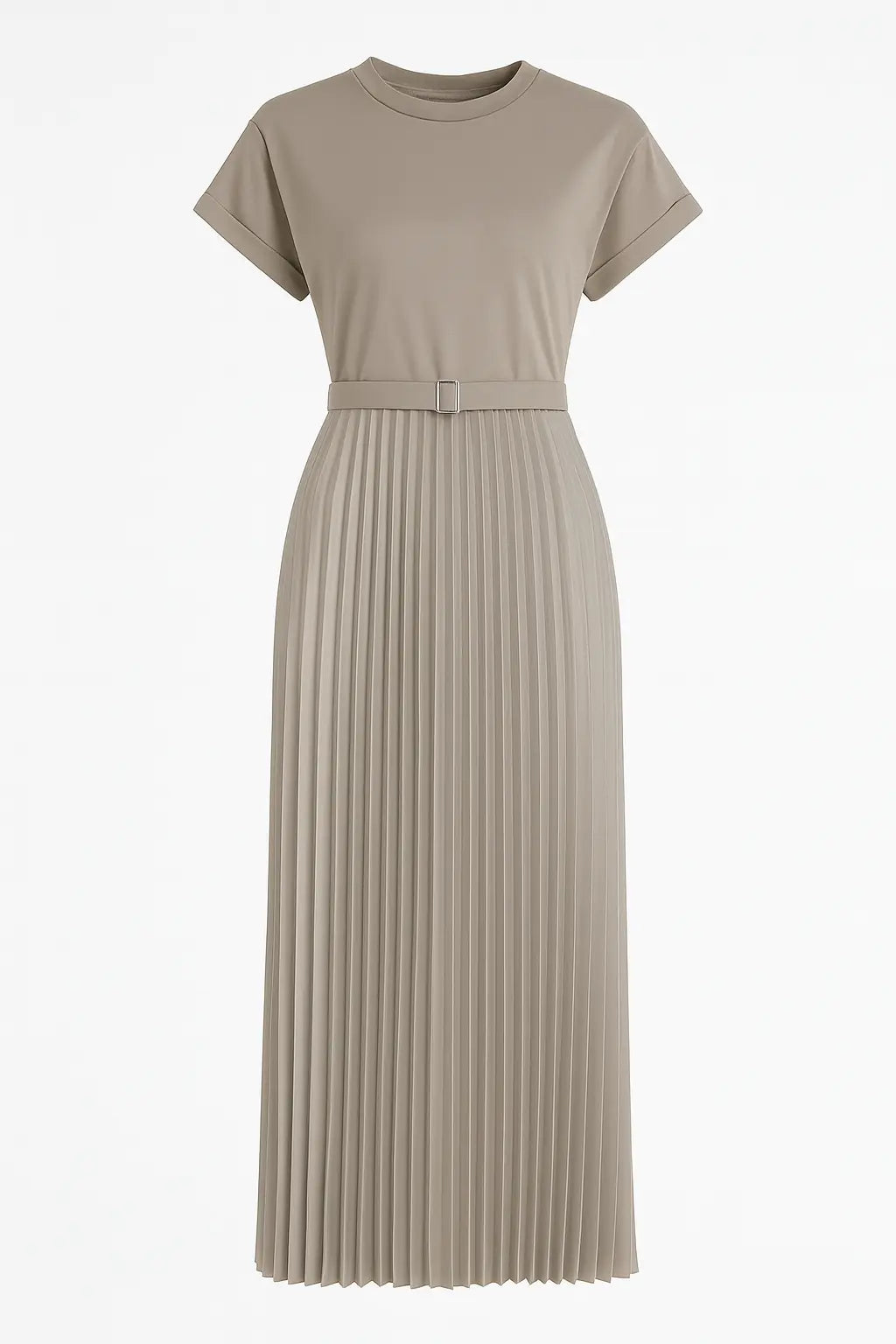 Raffinato e senza tempo, questo abito midi color beige chiaro è l’emblema dell’eleganza essenziale. La parte superiore, ispirata alla classica t-shirt, è realizzata in tessuto morbido e fluido con maniche corte risvoltate. Il punto vita è evidenziato da una cintura in tono con fibbia rivestita, mentre la gonna plissé dona movimento e leggerezza all’intero look. Perfetto per outfit da giorno o da ufficio, questo abito è una scelta versatile e chic per ogni occasione.