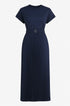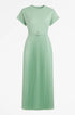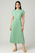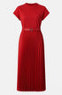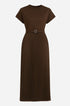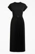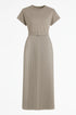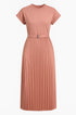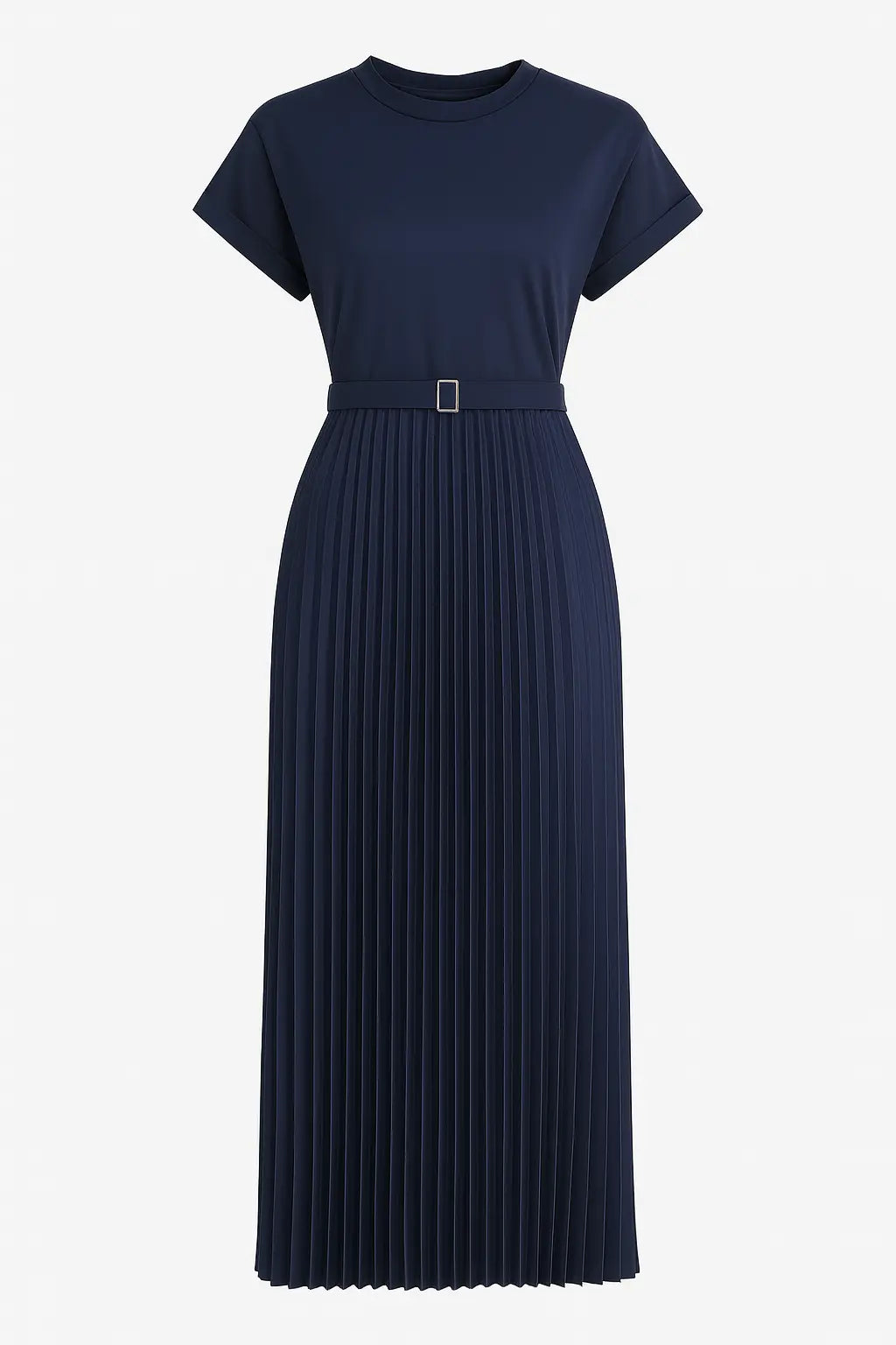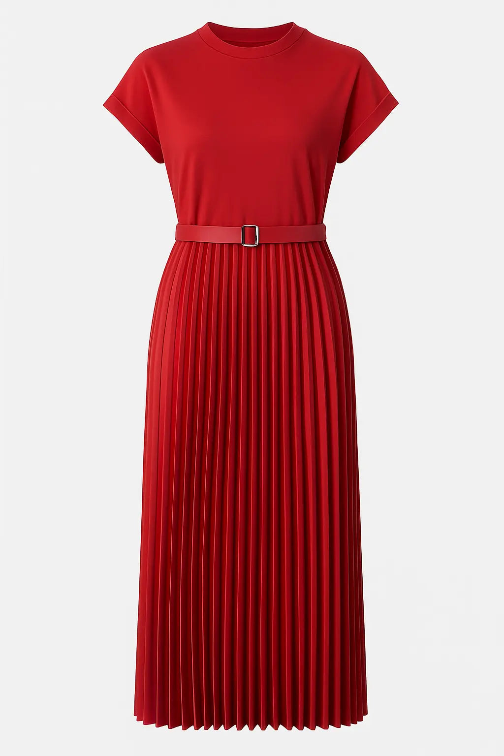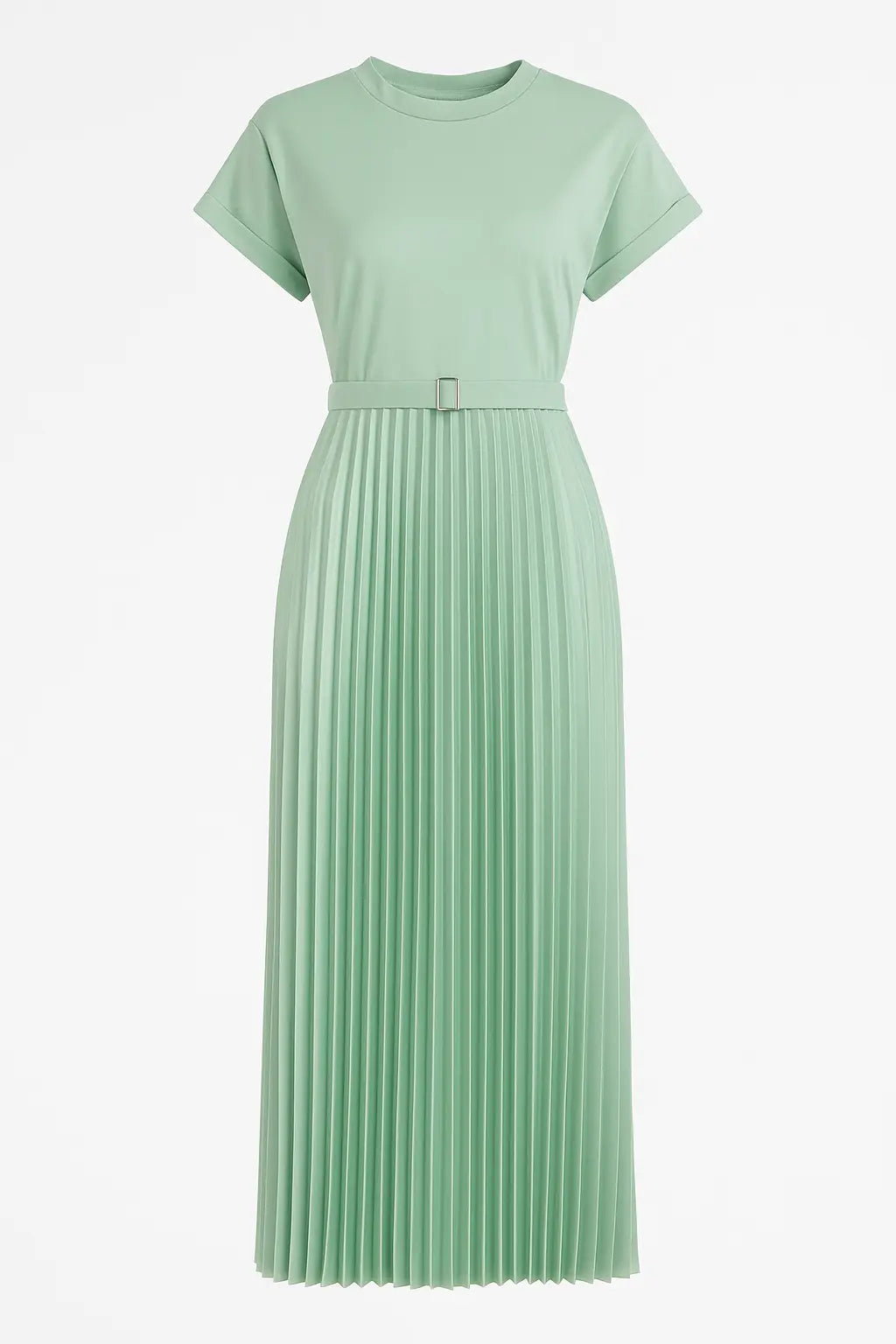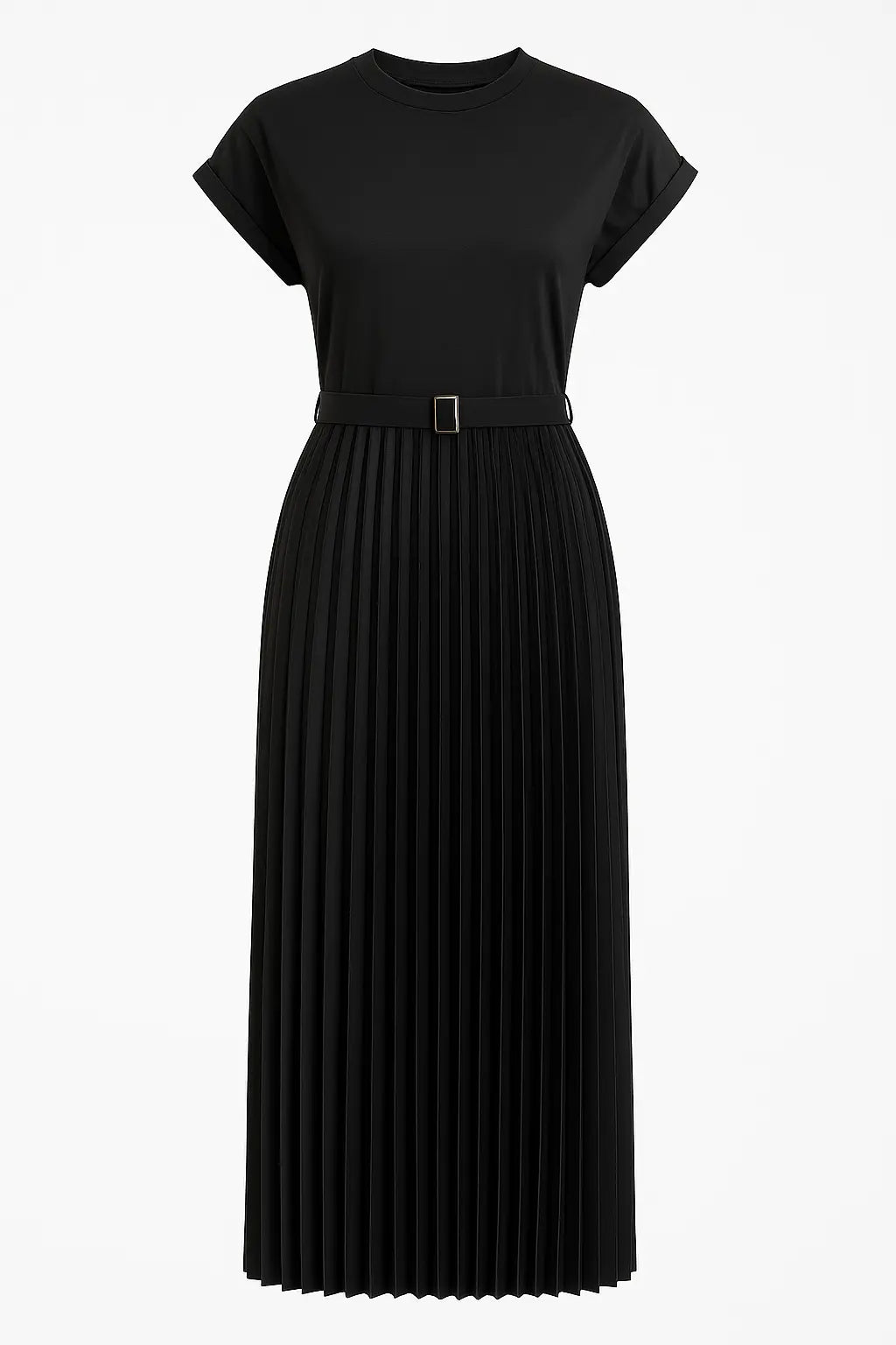 Raffinato e senza tempo, questo abito midi color beige chiaro è l’emblema dell’eleganza essenziale. La parte superiore, ispirata alla classica t-shirt, è realizzata in tessuto morbido e fluido con maniche corte risvoltate. Il punto vita è evidenziato da una cintura in tono con fibbia rivestita, mentre la gonna plissé dona movimento e leggerezza all’intero look. Perfetto per outfit da giorno o da ufficio, questo abito è una scelta versatile e chic per ogni occasione.